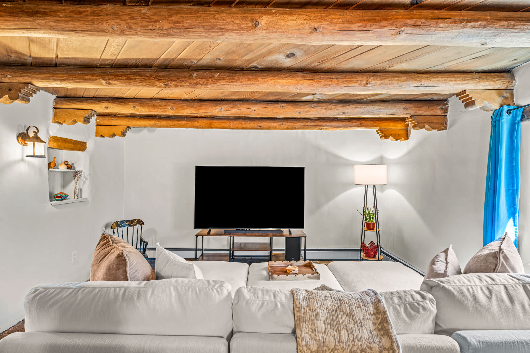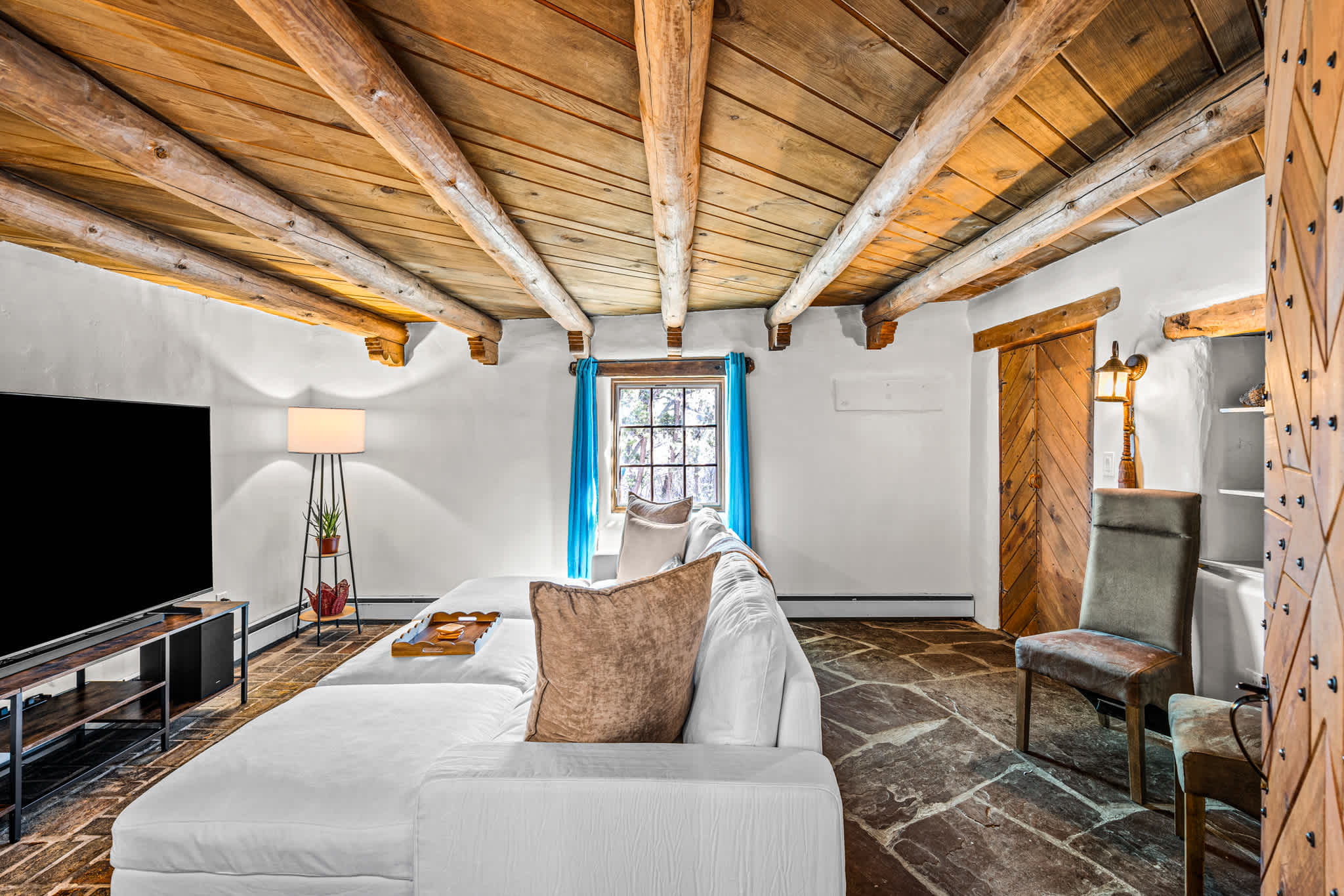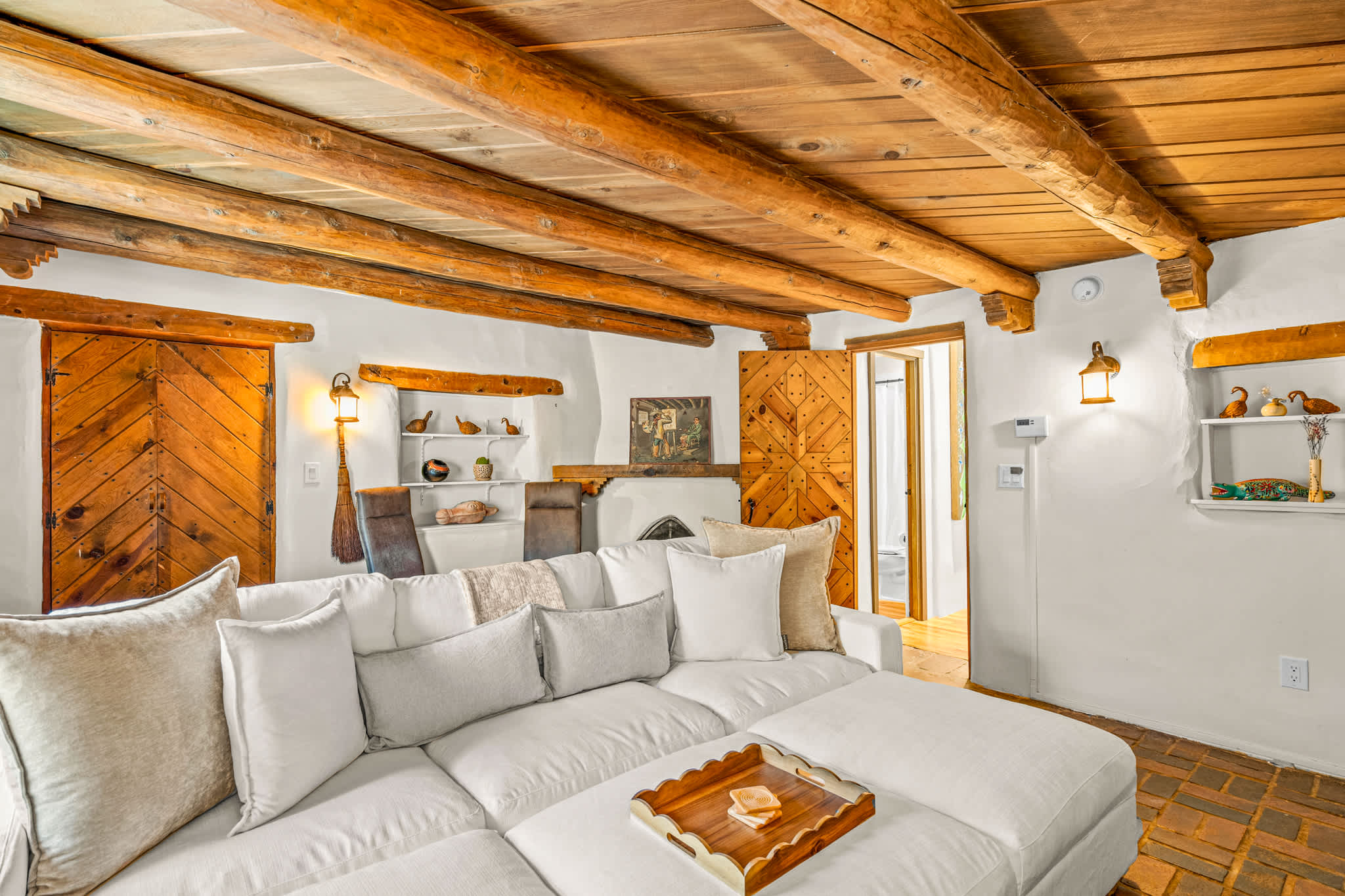 The main living area is warm and welcoming, centered around a traditional decorative kiva fireplace and framed by rich wood ceilings and beams. Comfortable seating creates an easy space for conversation or relaxing evenings, while natural light filters in through surrounding windows. A separate media room provides an additional place to unwind, featuring a large TV and cozy seating, perfect for movie nights or quiet downtime. The large stuffed sectional can be used for additional sleeping arrangements.