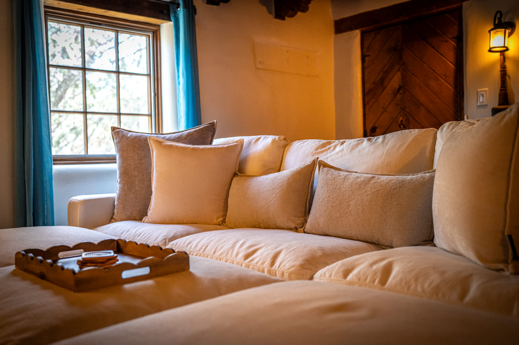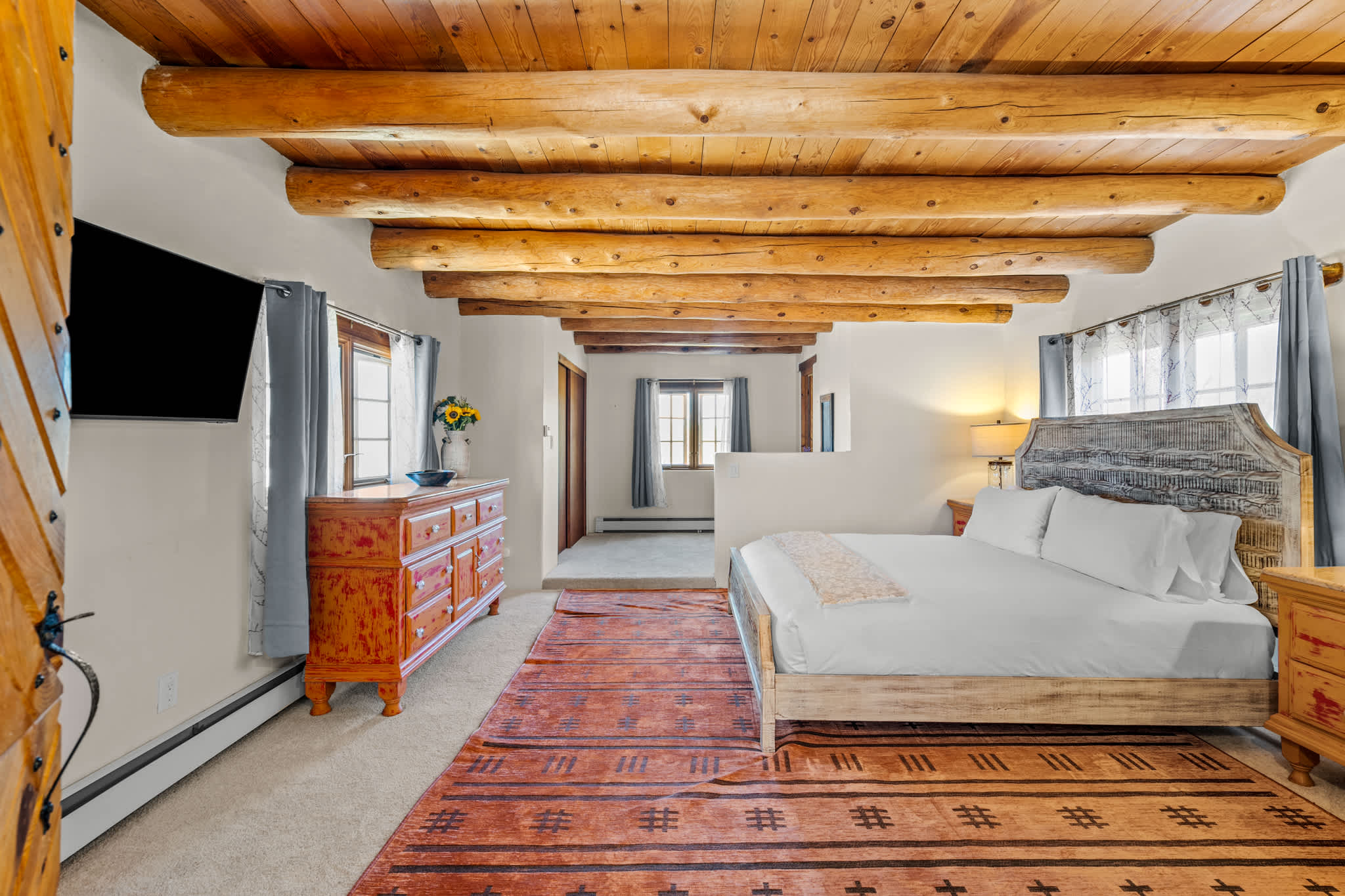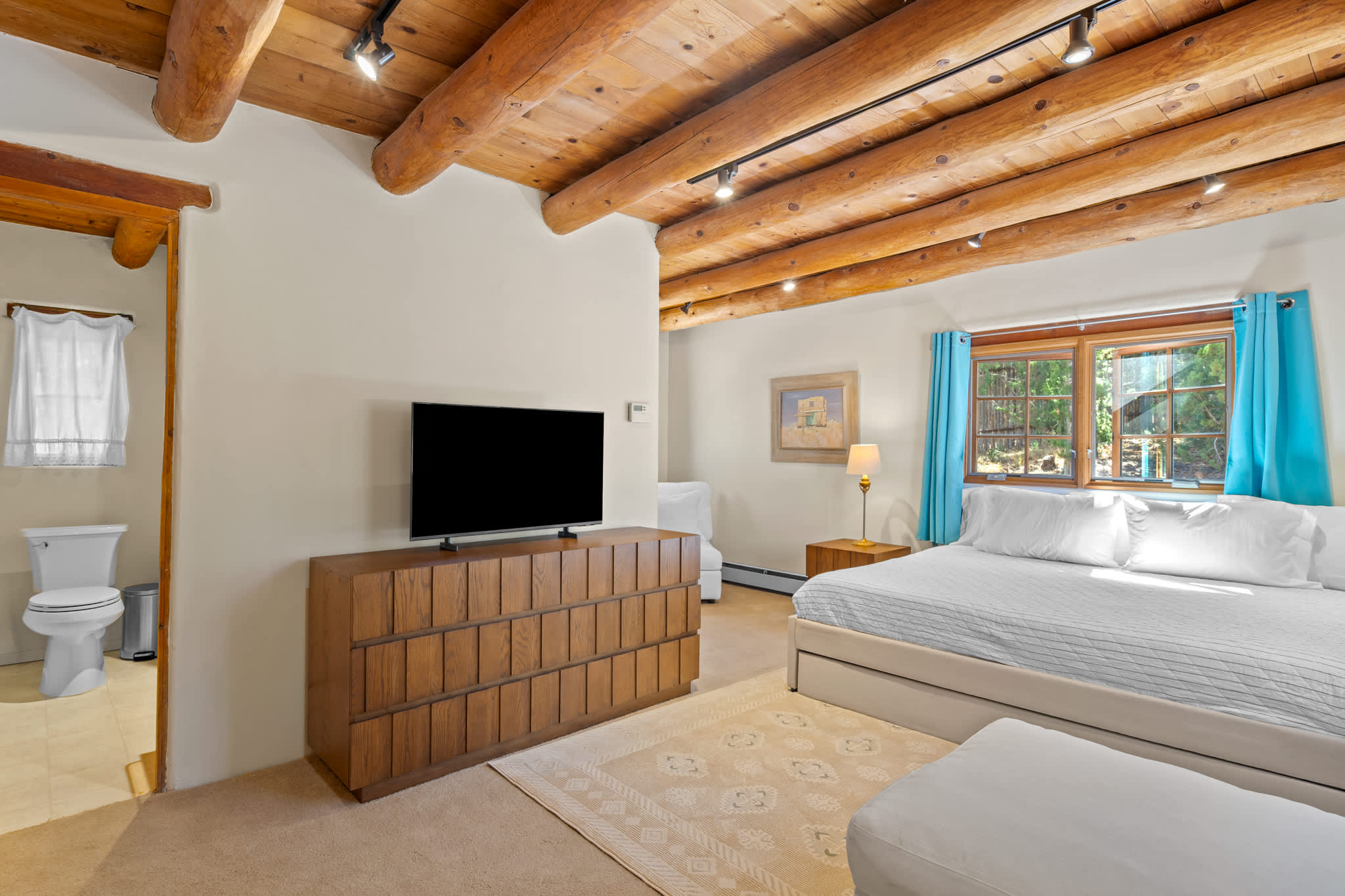 The main living area is warm and welcoming, centered around a traditional decorative kiva fireplace and framed by rich wood ceilings and beams. Comfortable seating creates an easy space for conversation or relaxing evenings, while natural light filters in through surrounding windows. A separate media room provides an additional place to unwind, featuring a large TV and cozy seating, perfect for movie nights or quiet downtime. The large stuffed sectional can be used for additional sleeping arrangements.