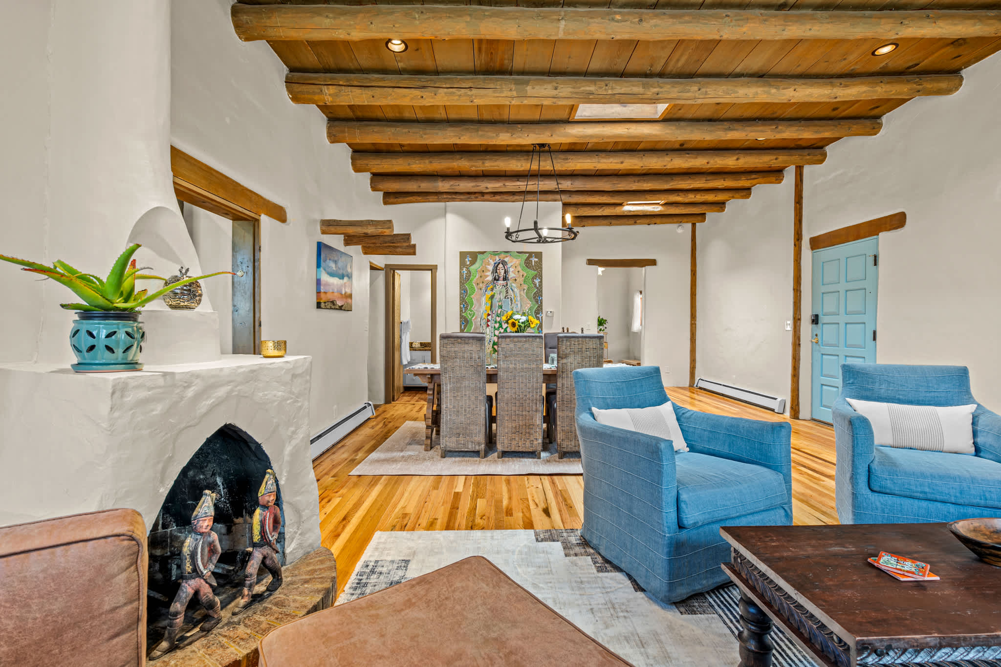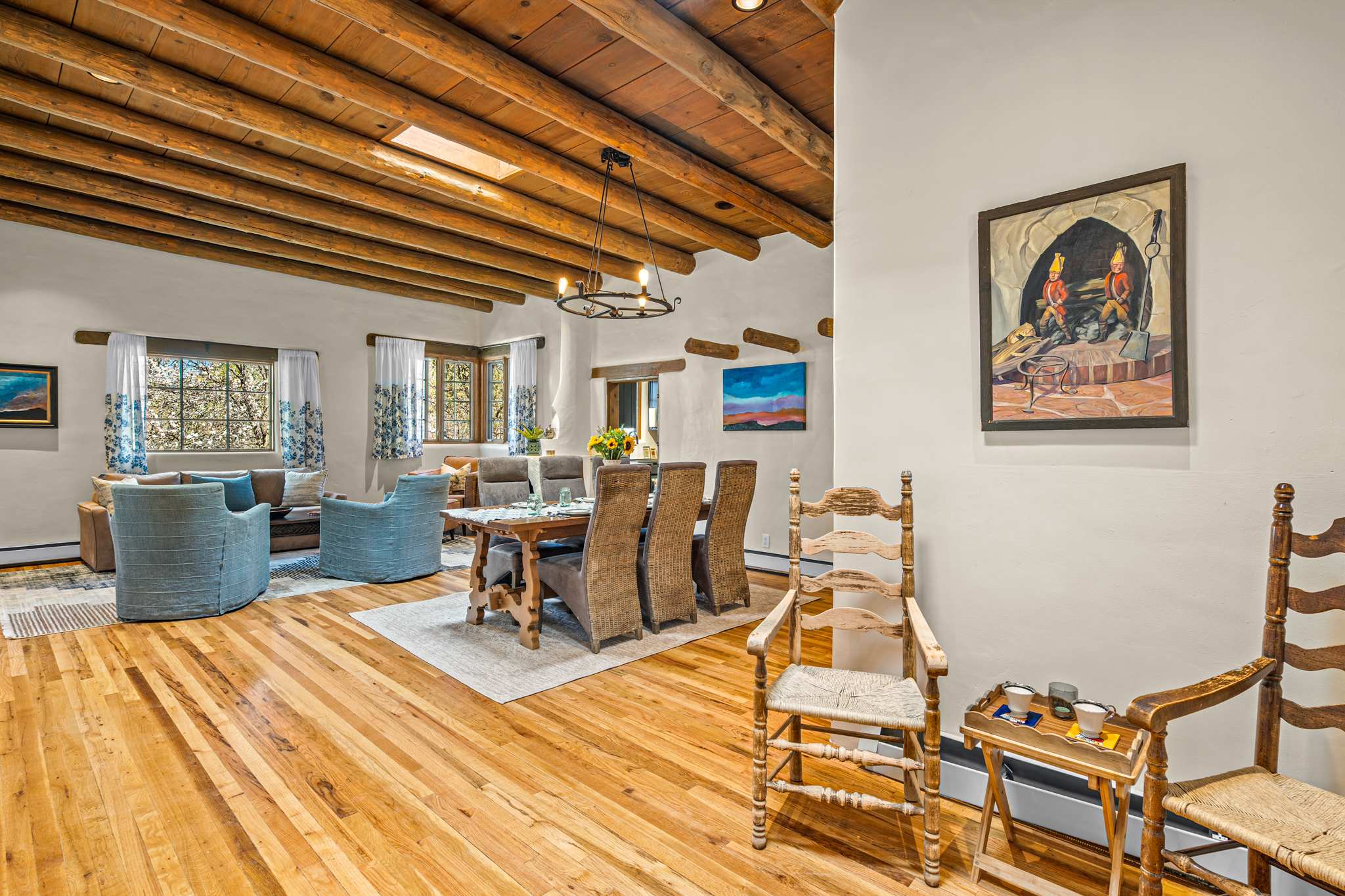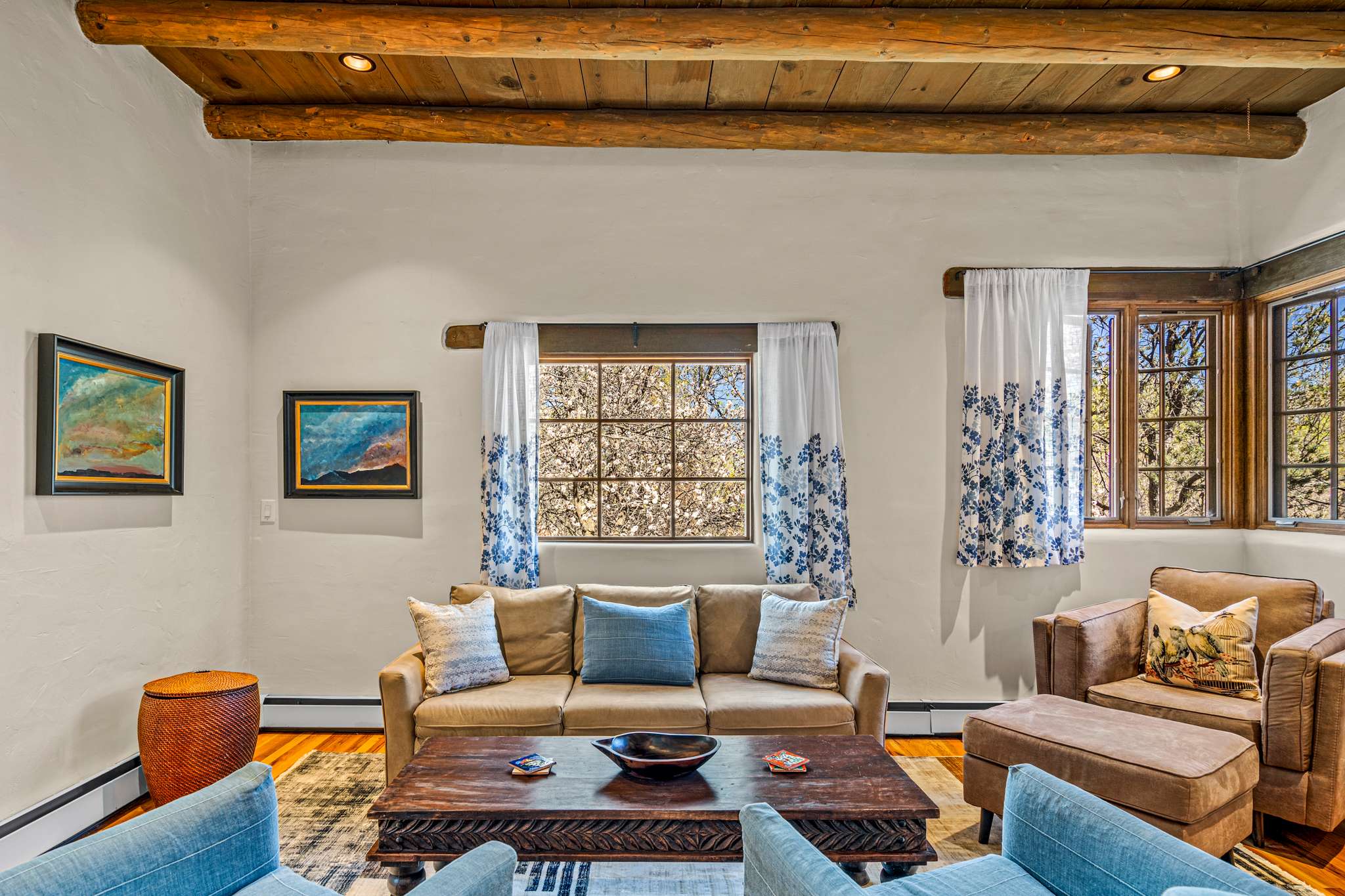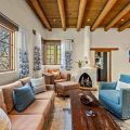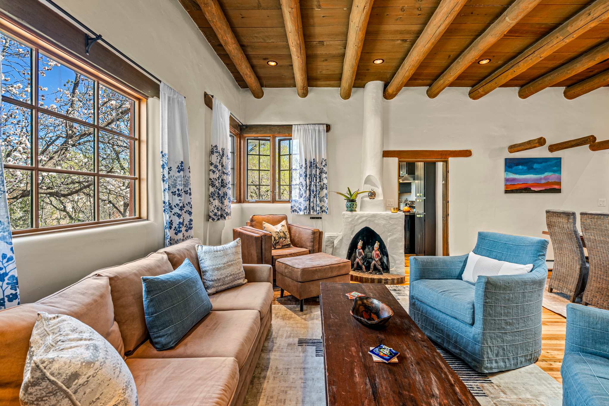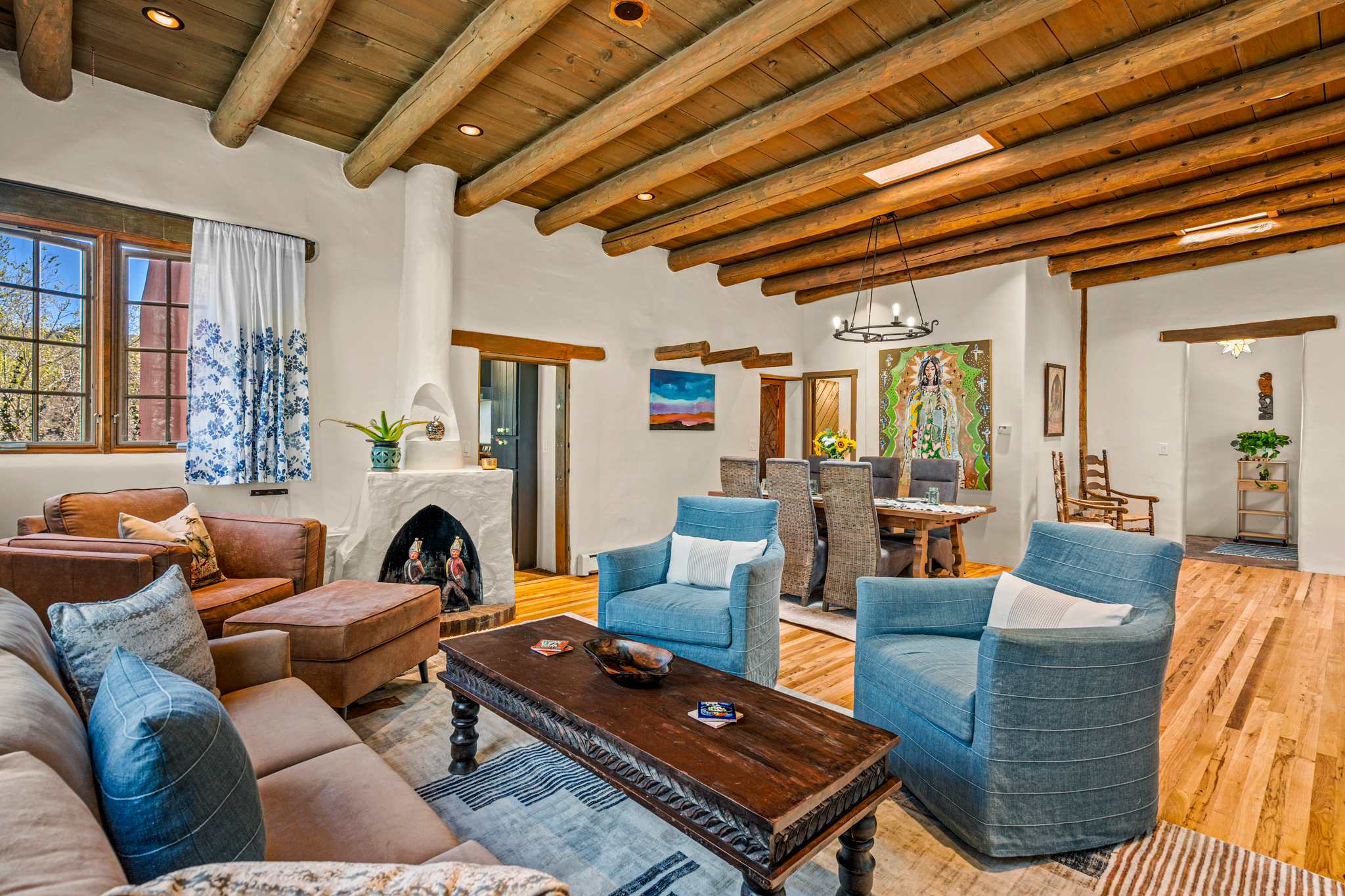 Classic Santa Fe charm meets comfortable, livable design at this traditional adobe retreat built by the Santa Fe Artist Cyrus Leroy Baldridge. Located on a quiet, tree filled property, this tucked back home features authentic Southwestern details throughout including exposed vigas, wood ceilings, plaster walls, and multiple decorative kiva fireplaces, paired with inviting spaces to gather and unwind. With generous common areas, a well equipped galley kitchen and annex, and spacious bedrooms, this home is ideal for small families or groups looking for an authentic Santa Fe experience with room to spread out. This home also features original art from Santa Fe artists Brad Smith, Bobby Beals, and Cyrus Leroy Baldridge.