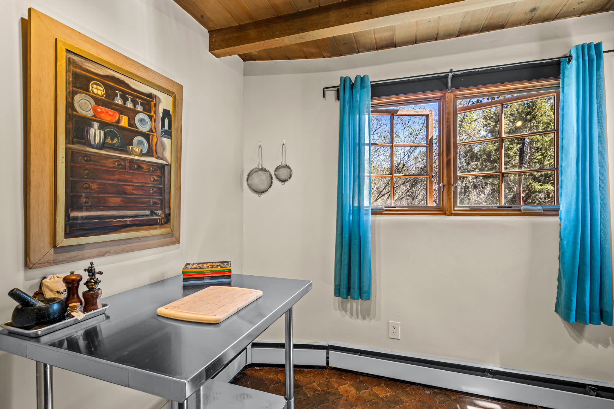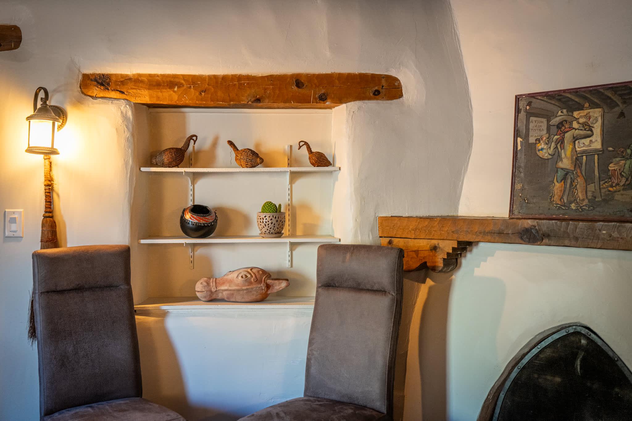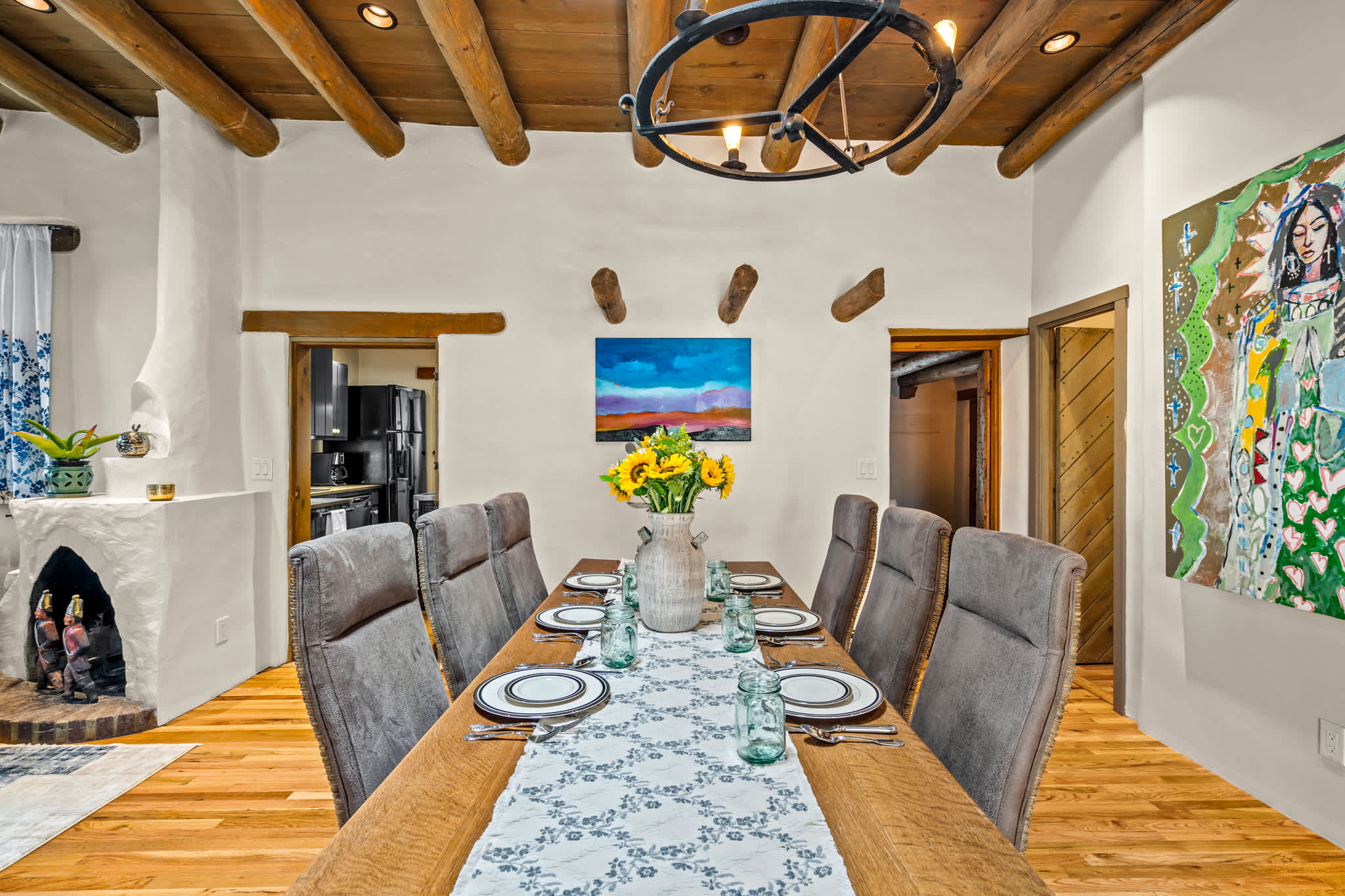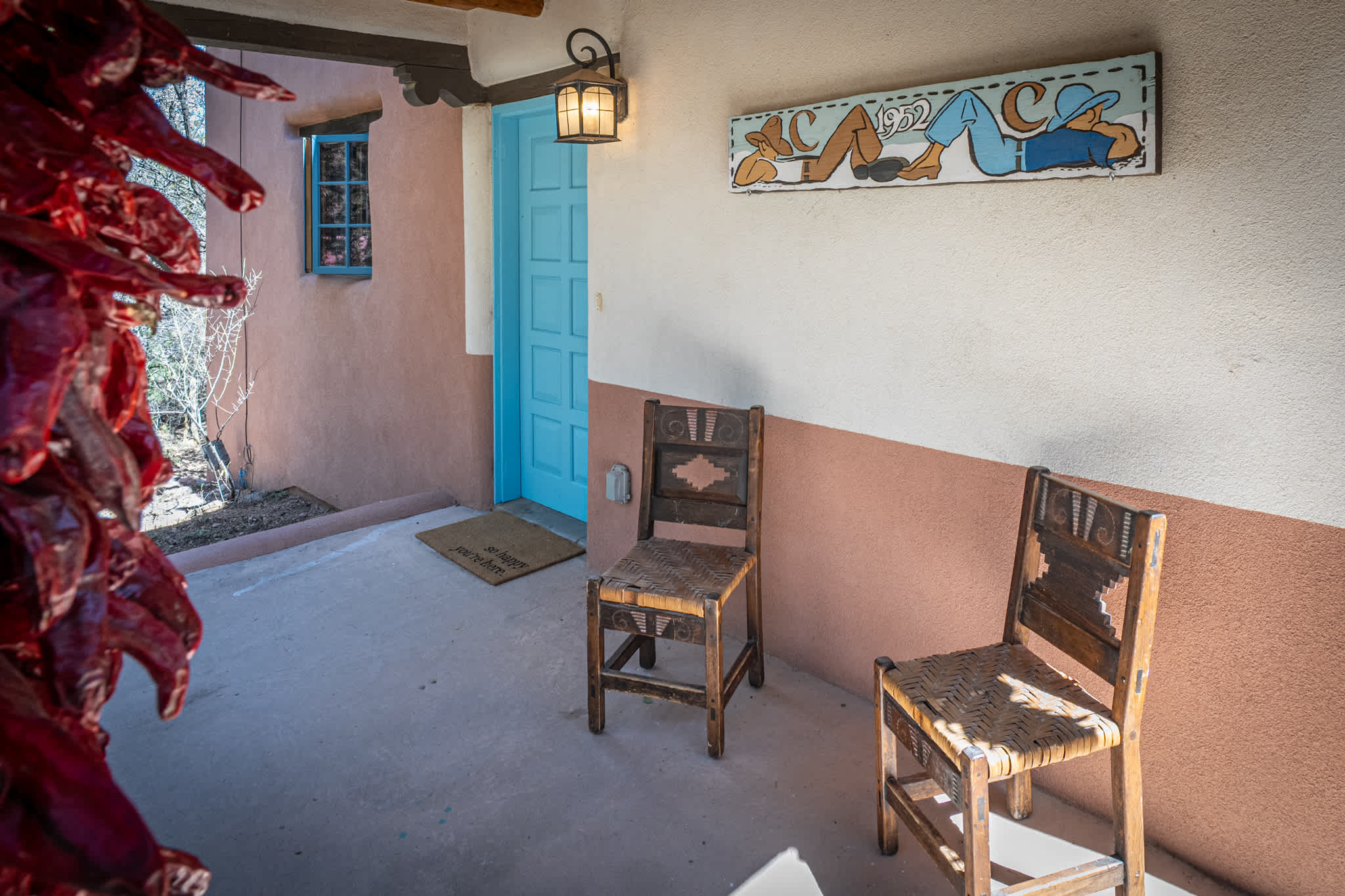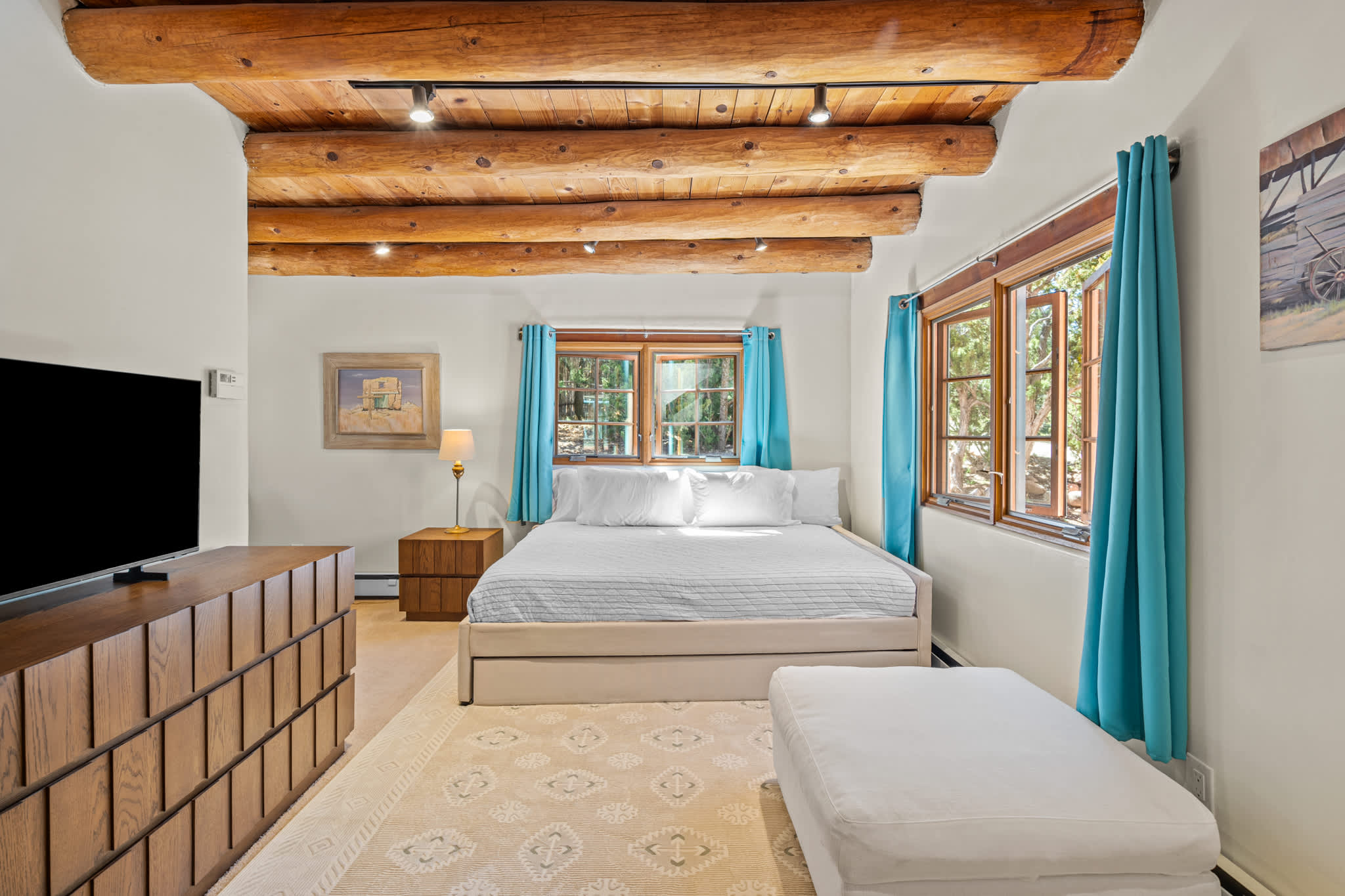 Classic Santa Fe charm meets comfortable, livable design at this traditional adobe retreat built by the Santa Fe Artist Cyrus Leroy Baldridge. Located on a quiet, tree filled property, this tucked back home features authentic Southwestern details throughout including exposed vigas, wood ceilings, plaster walls, and multiple decorative kiva fireplaces, paired with inviting spaces to gather and unwind. With generous common areas, a well equipped galley kitchen and annex, and spacious bedrooms, this home is ideal for small families or groups looking for an authentic Santa Fe experience with room to spread out. This home also features original art from Santa Fe artists Brad Smith, Bobby Beals, and Cyrus Leroy Baldridge.