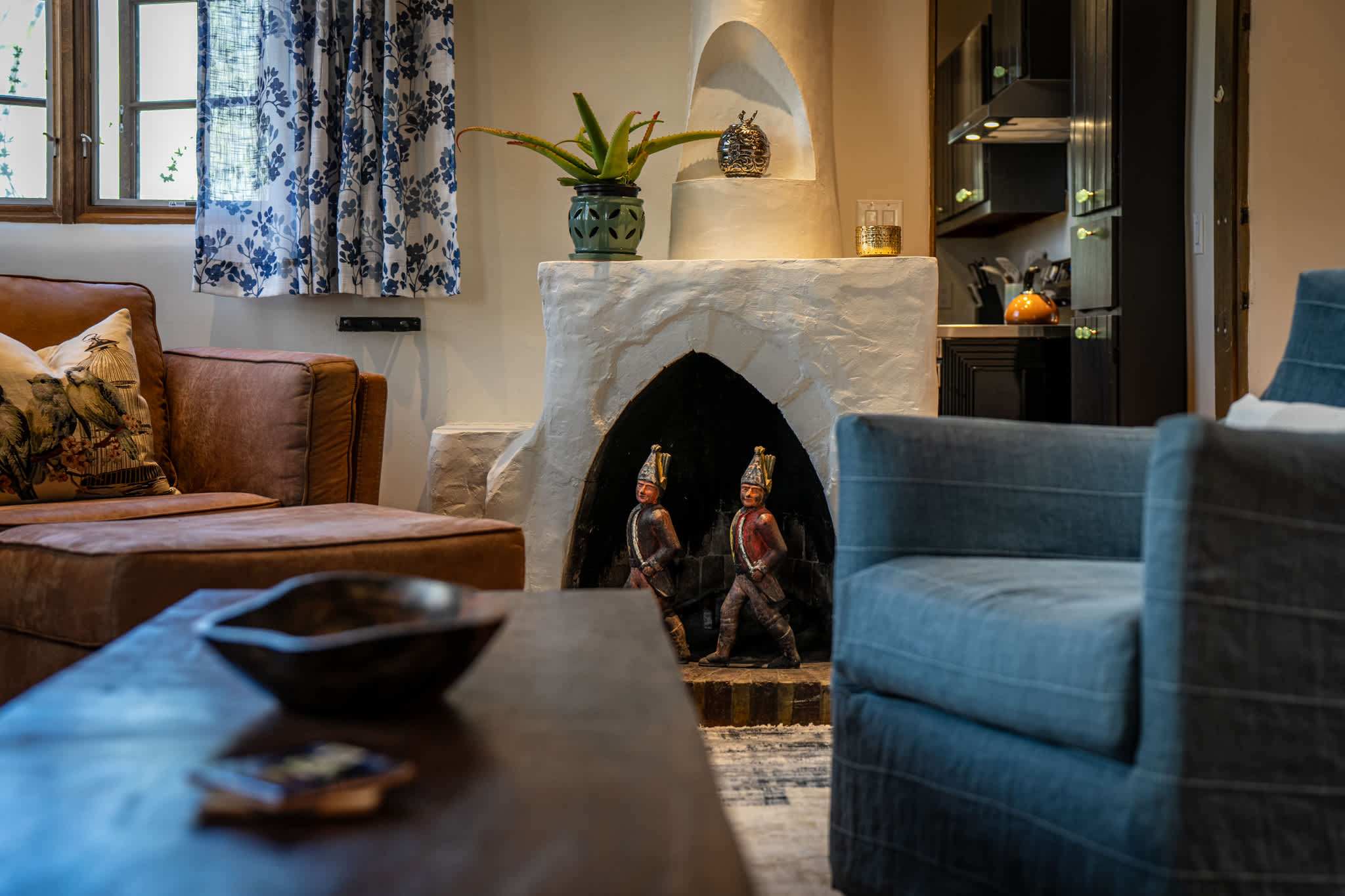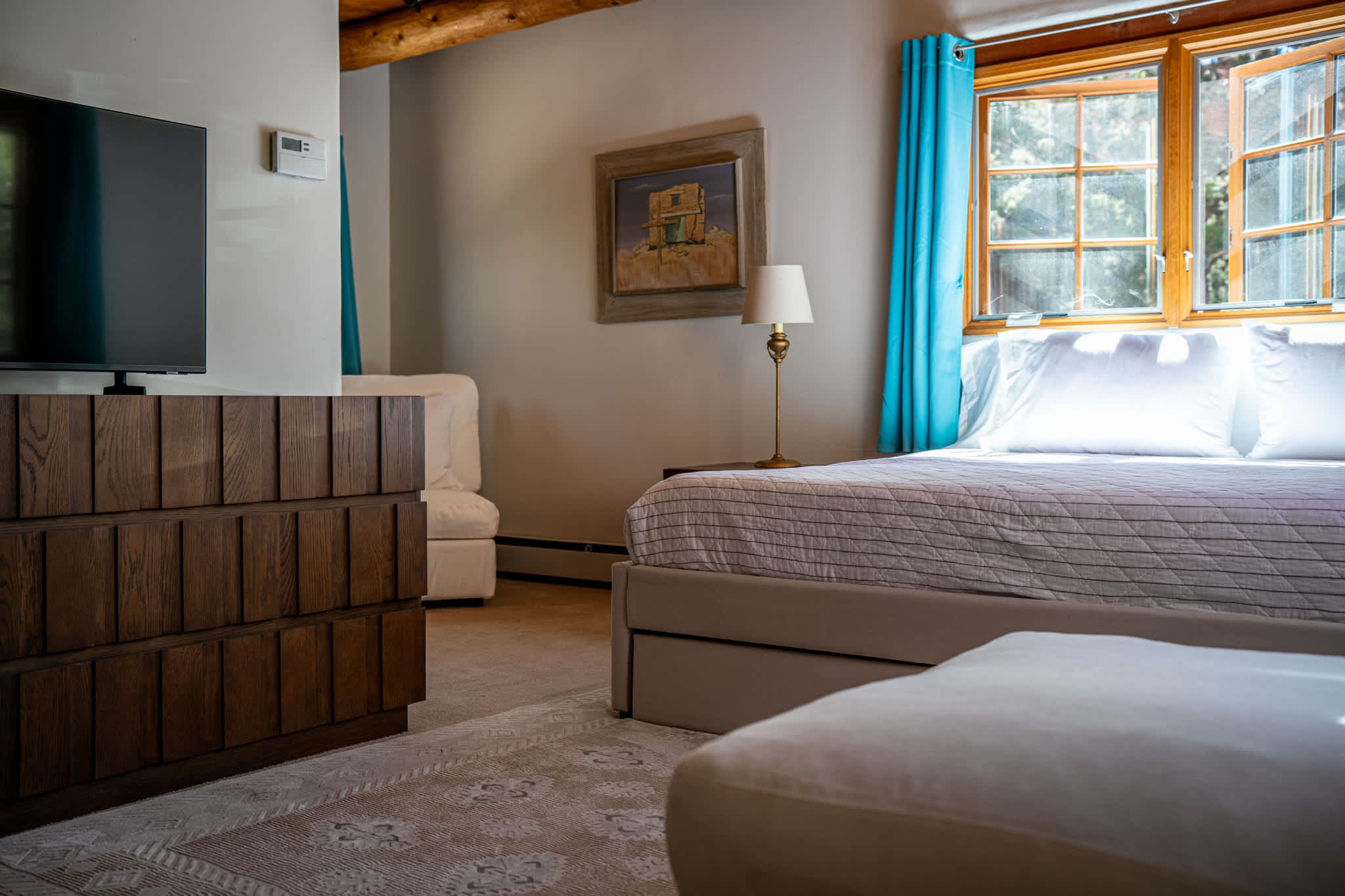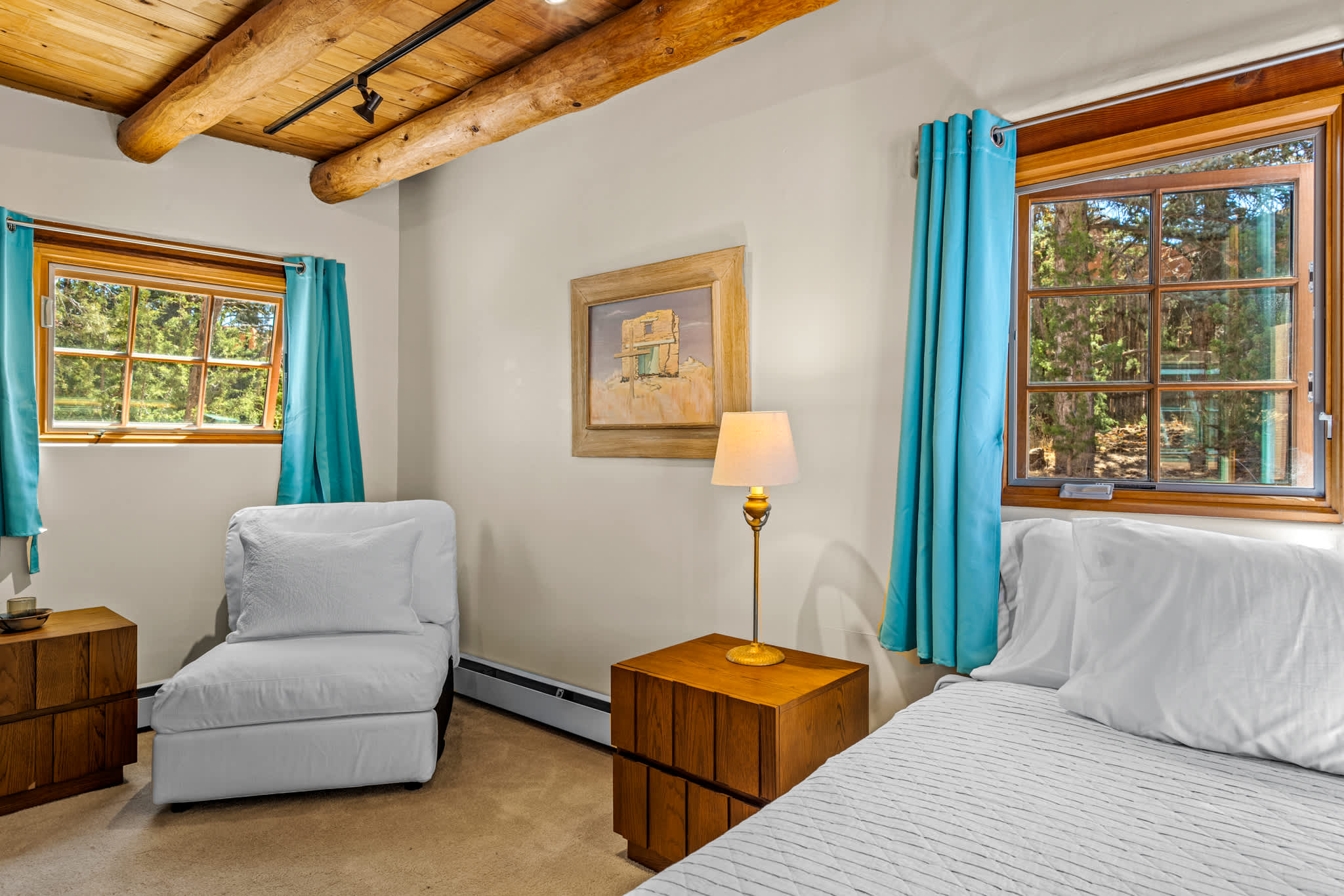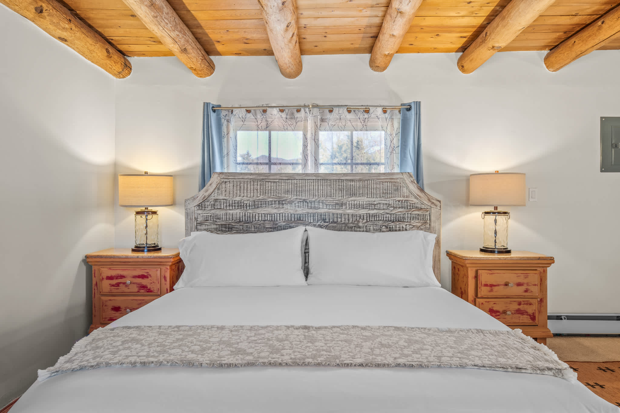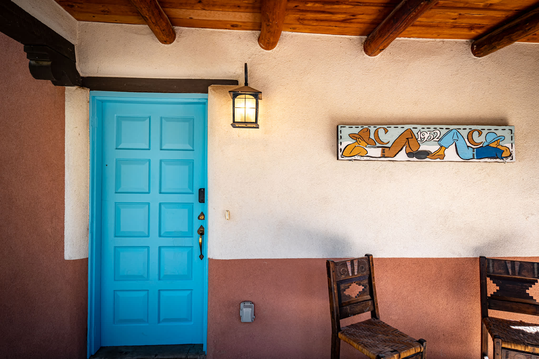 Classic Santa Fe charm meets comfortable, livable design at this traditional adobe retreat built by the Santa Fe Artist Cyrus Leroy Baldridge. Located on a quiet, tree filled property, this tucked back home features authentic Southwestern details throughout including exposed vigas, wood ceilings, plaster walls, and multiple decorative kiva fireplaces, paired with inviting spaces to gather and unwind. With generous common areas, a well equipped galley kitchen and annex, and spacious bedrooms, this home is ideal for small families or groups looking for an authentic Santa Fe experience with room to spread out. This home also features original art from Santa Fe artists Brad Smith, Bobby Beals, and Cyrus Leroy Baldridge.