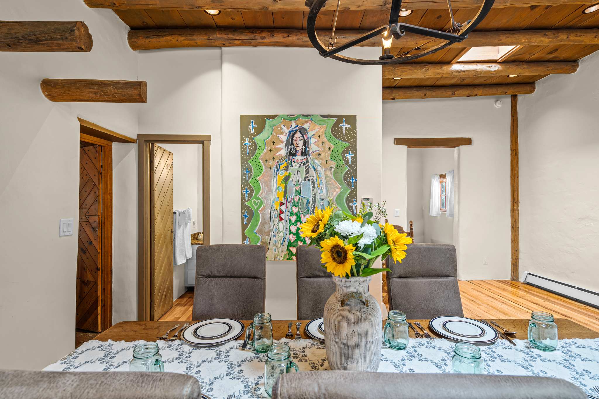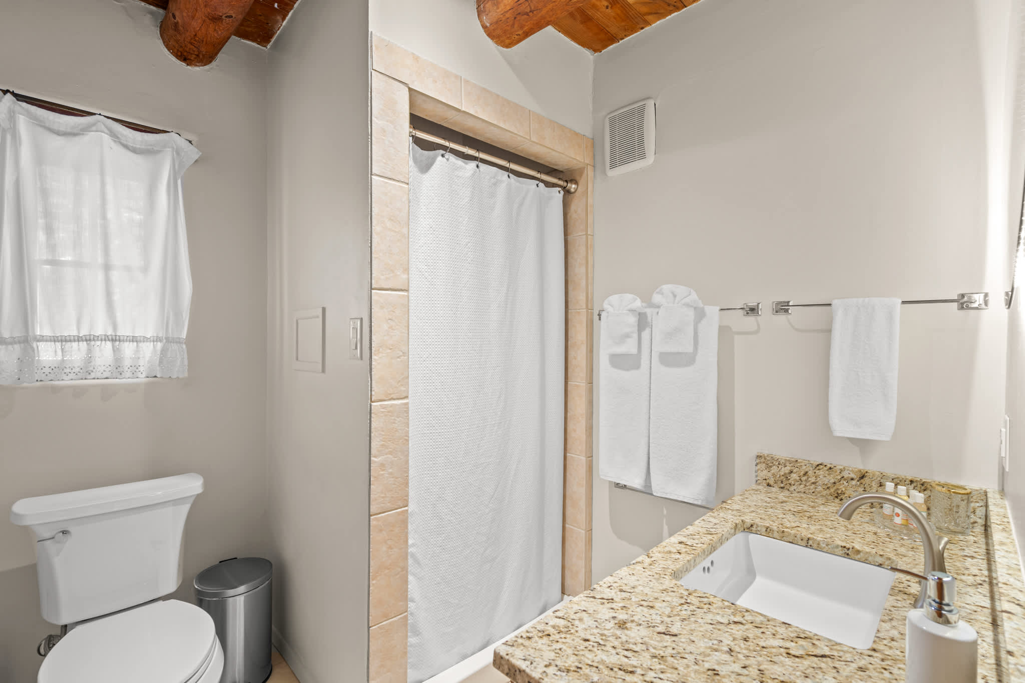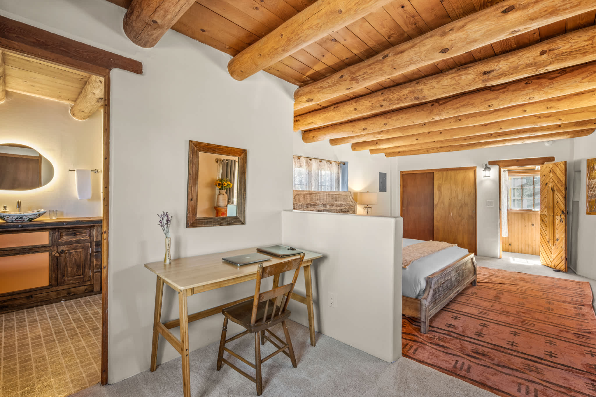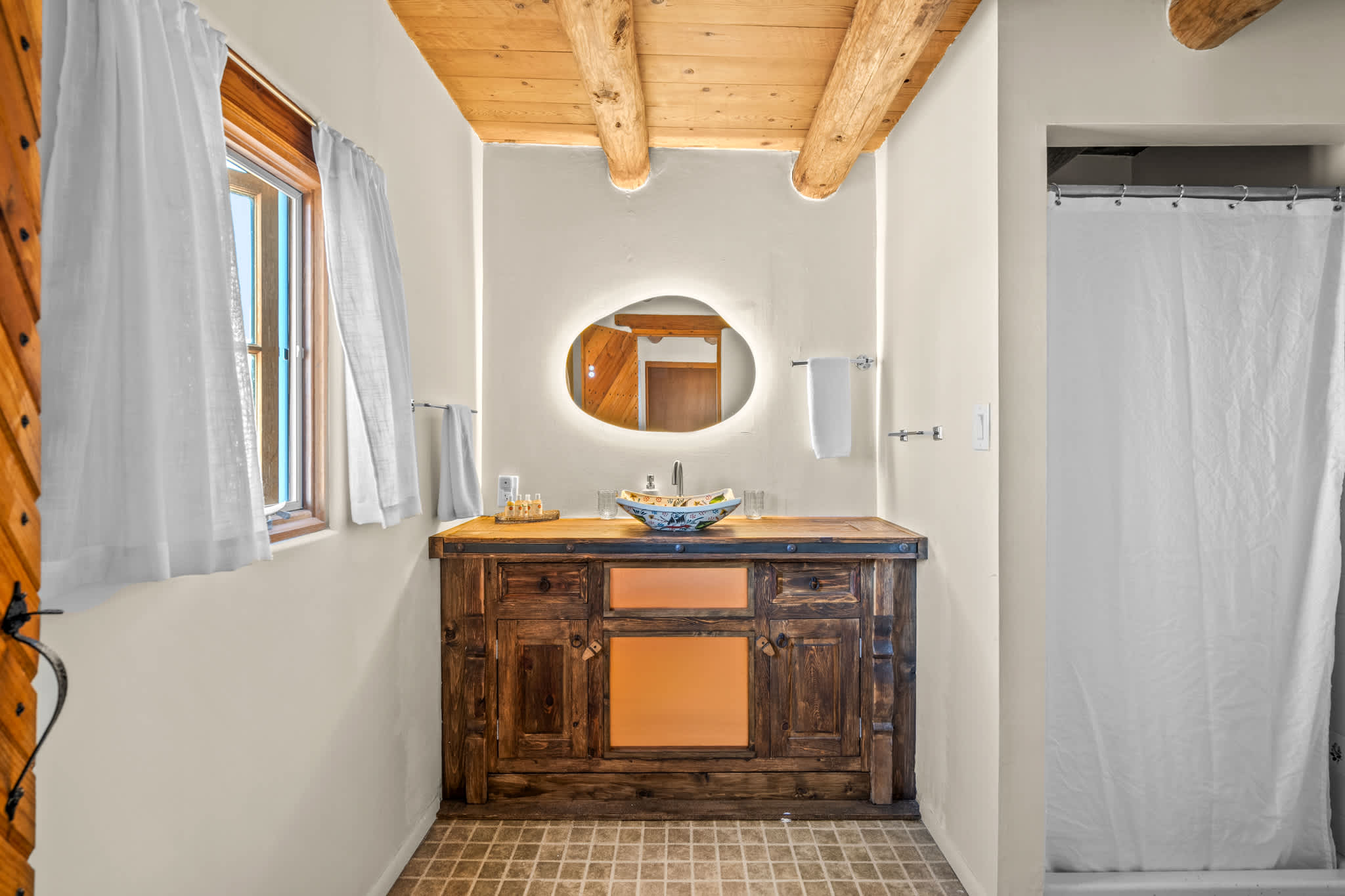 Bathrooms feature a mix of classic Santa Fe elements and practical updates, with walk in showers, handcrafted vanities, and clean finishes designed for ease and comfort.
