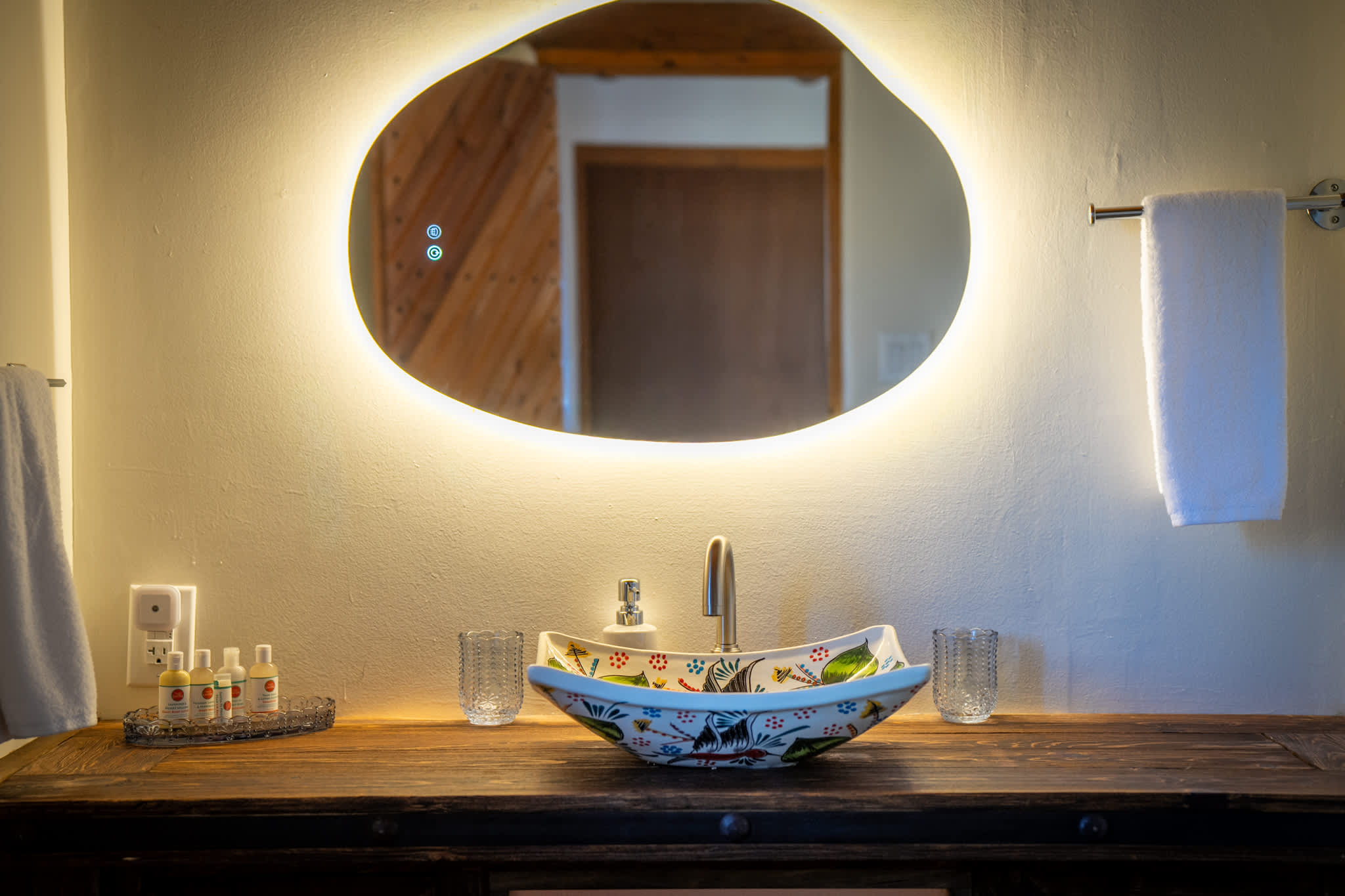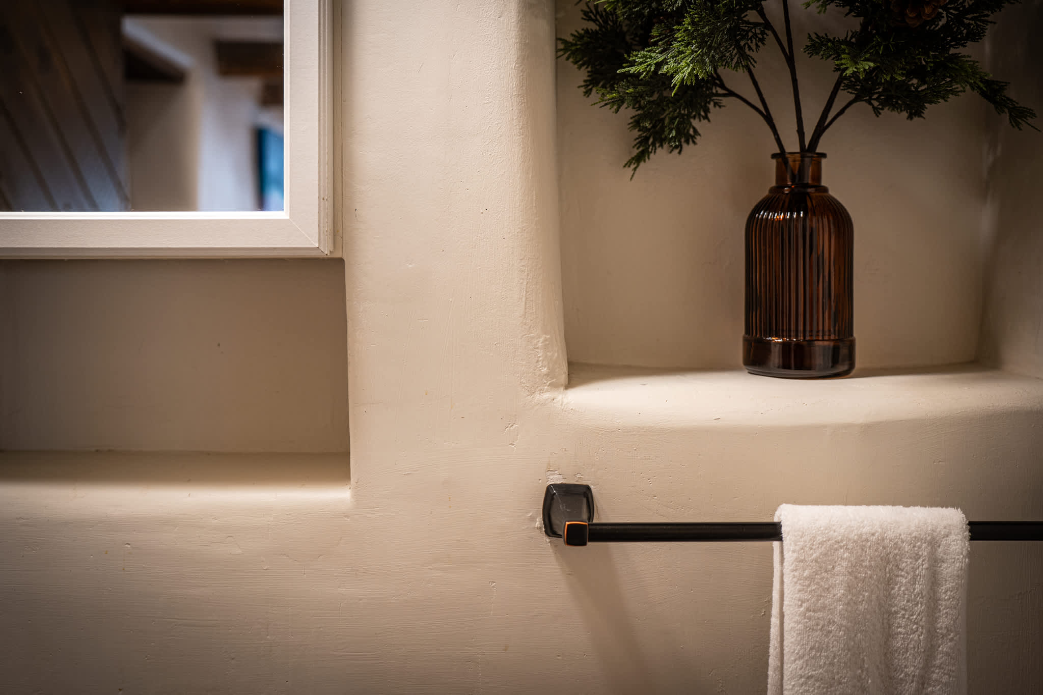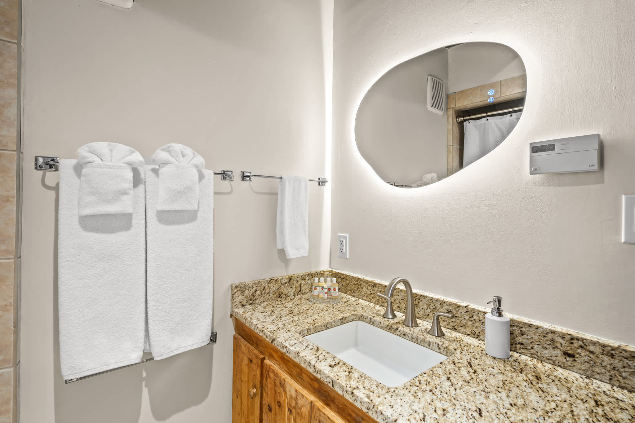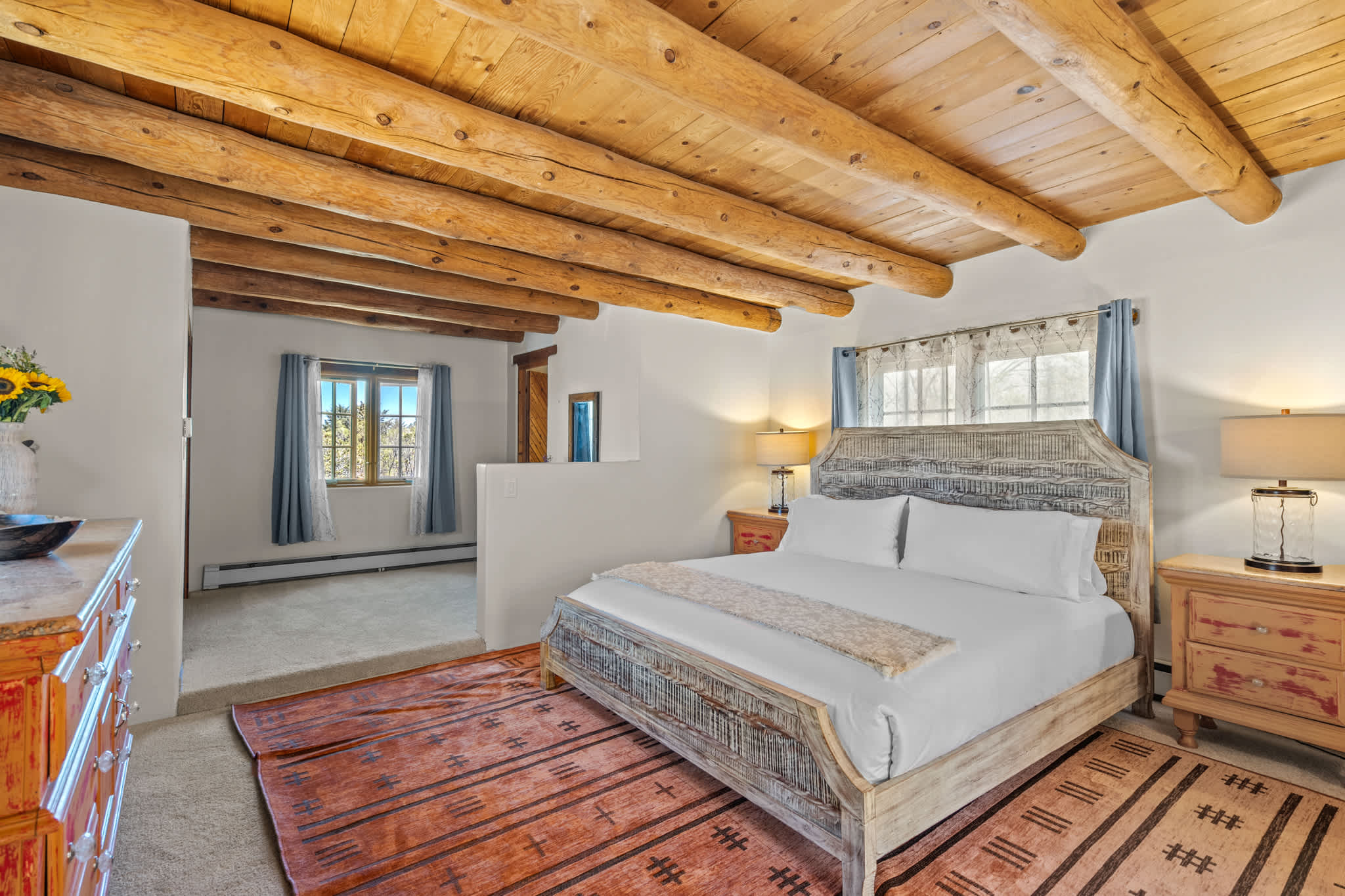 Bathrooms feature a mix of classic Santa Fe elements and practical updates, with walk in showers, handcrafted vanities, and clean finishes designed for ease and comfort.