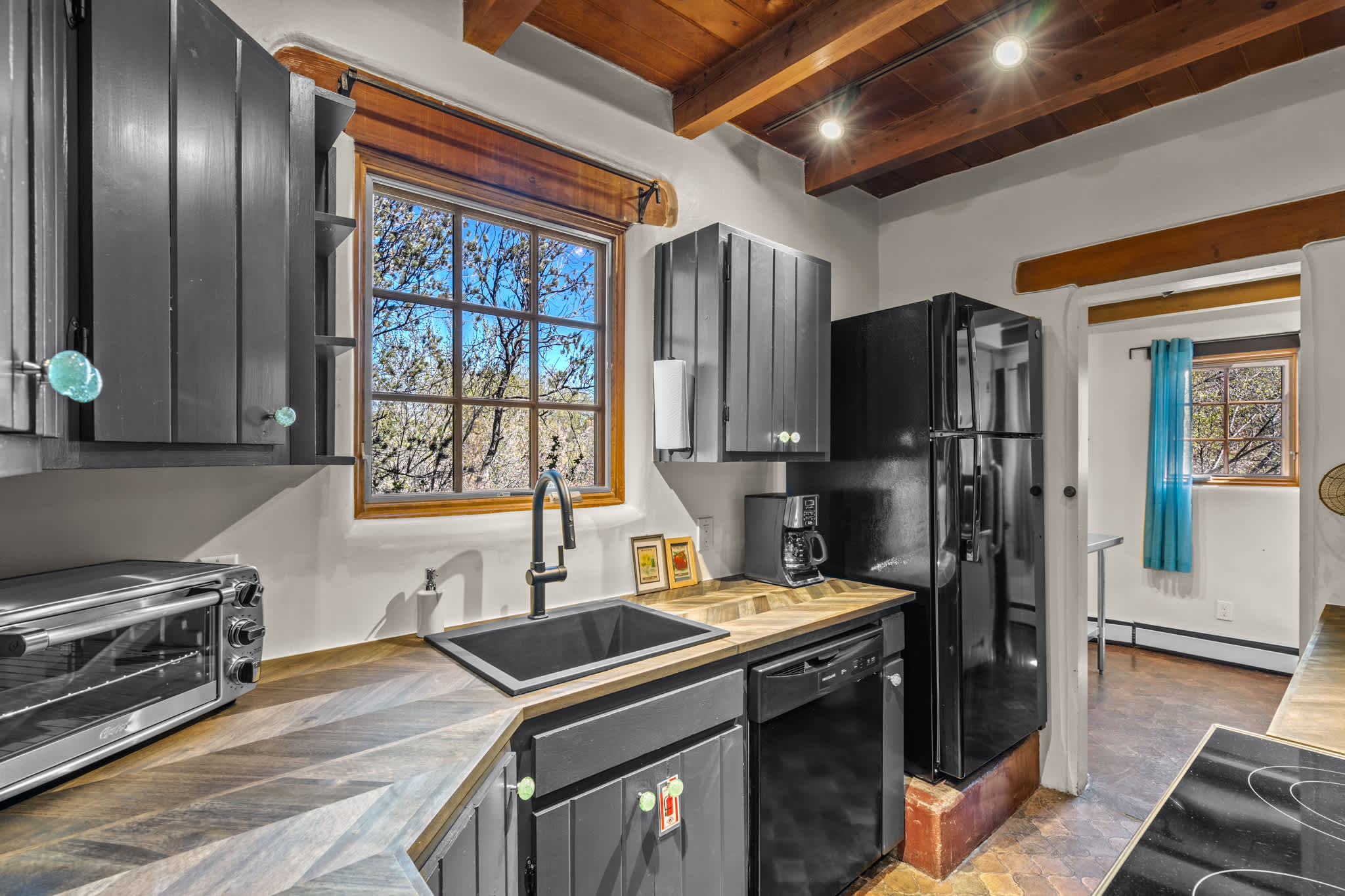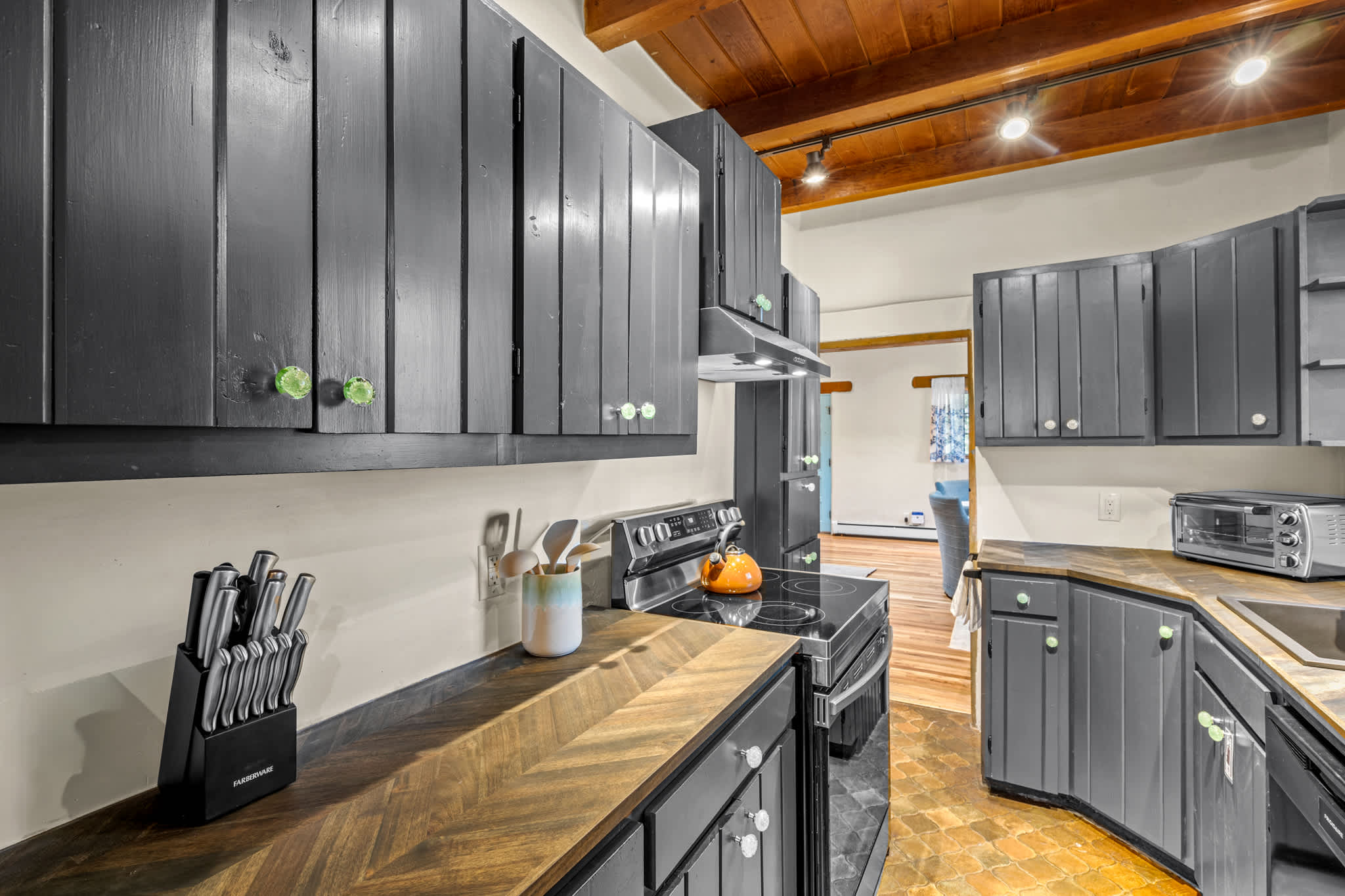 The kitchen blends rustic character with practical functionality. Mocha butcher block countertops, open shelving, and painted cabinetry create a relaxed, lived in feel, while a full suite of appliances makes meal preparation easy. The adjacent dining area features a large table with seating for your group, set beneath a striking wood beamed ceiling and custom lighting. The open flow between kitchen, dining, and living spaces keeps everyone connected.