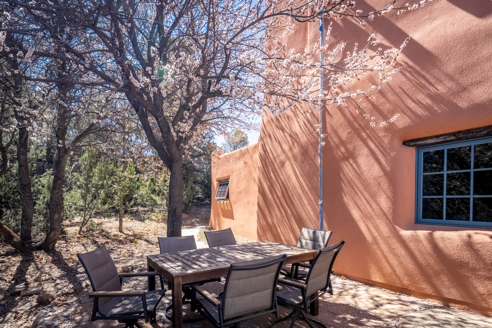 The outdoor areas are quiet and natural, surrounded by mature trees and native landscaping. A private patio with outdoor dining provides a peaceful setting for morning coffee or evening meals. The property feels tucked away and serene, offering a sense of retreat while still being conveniently located.