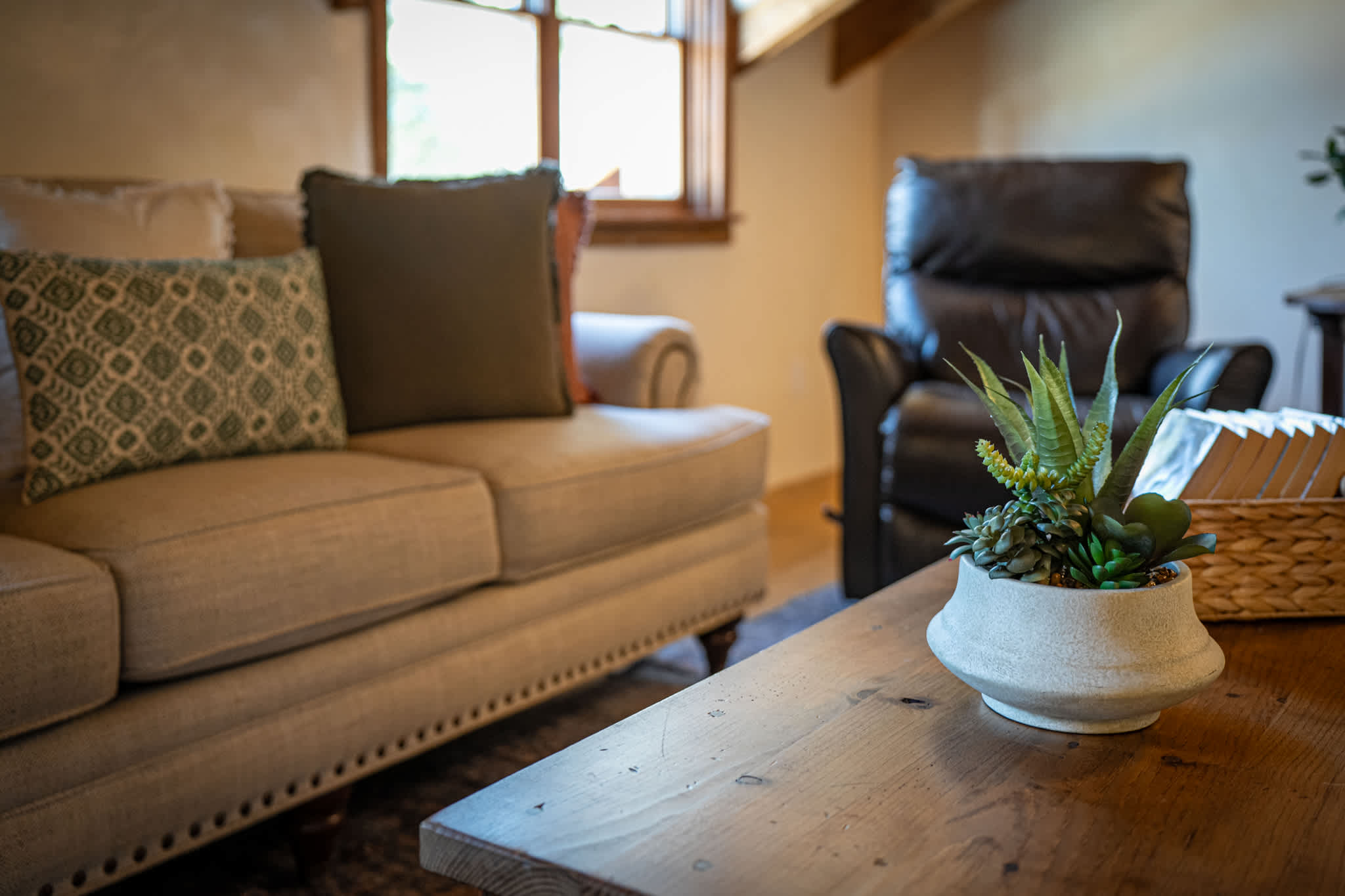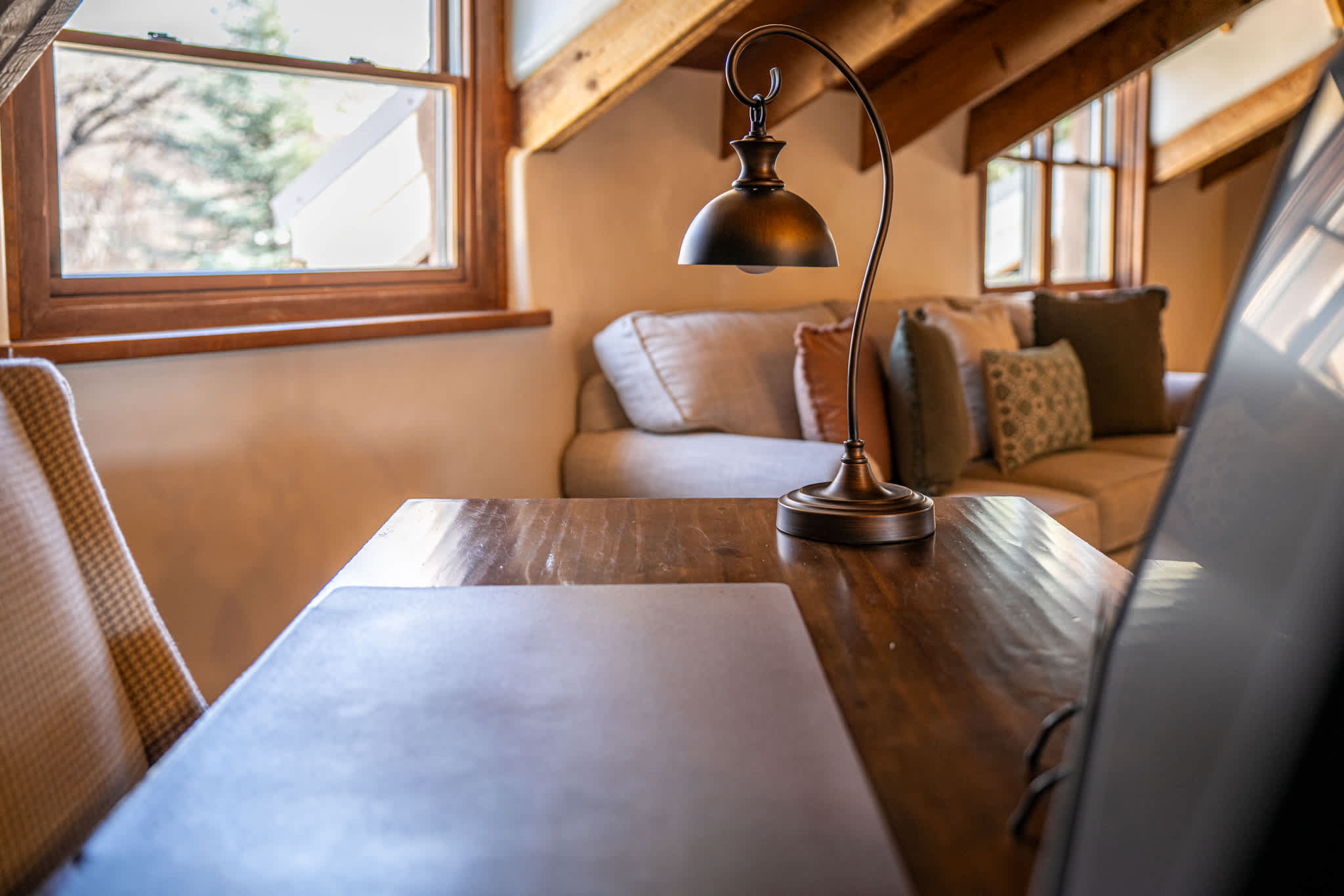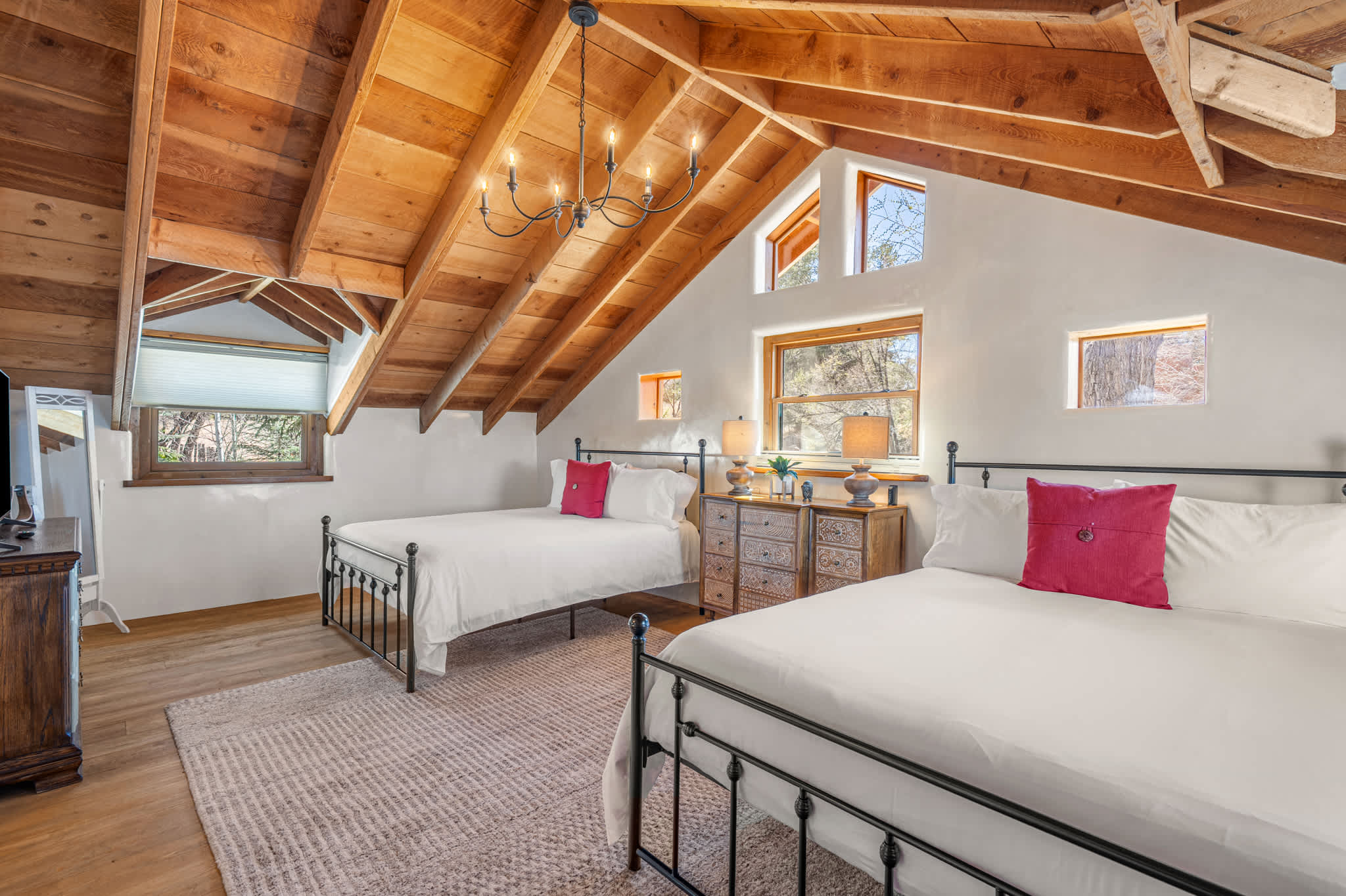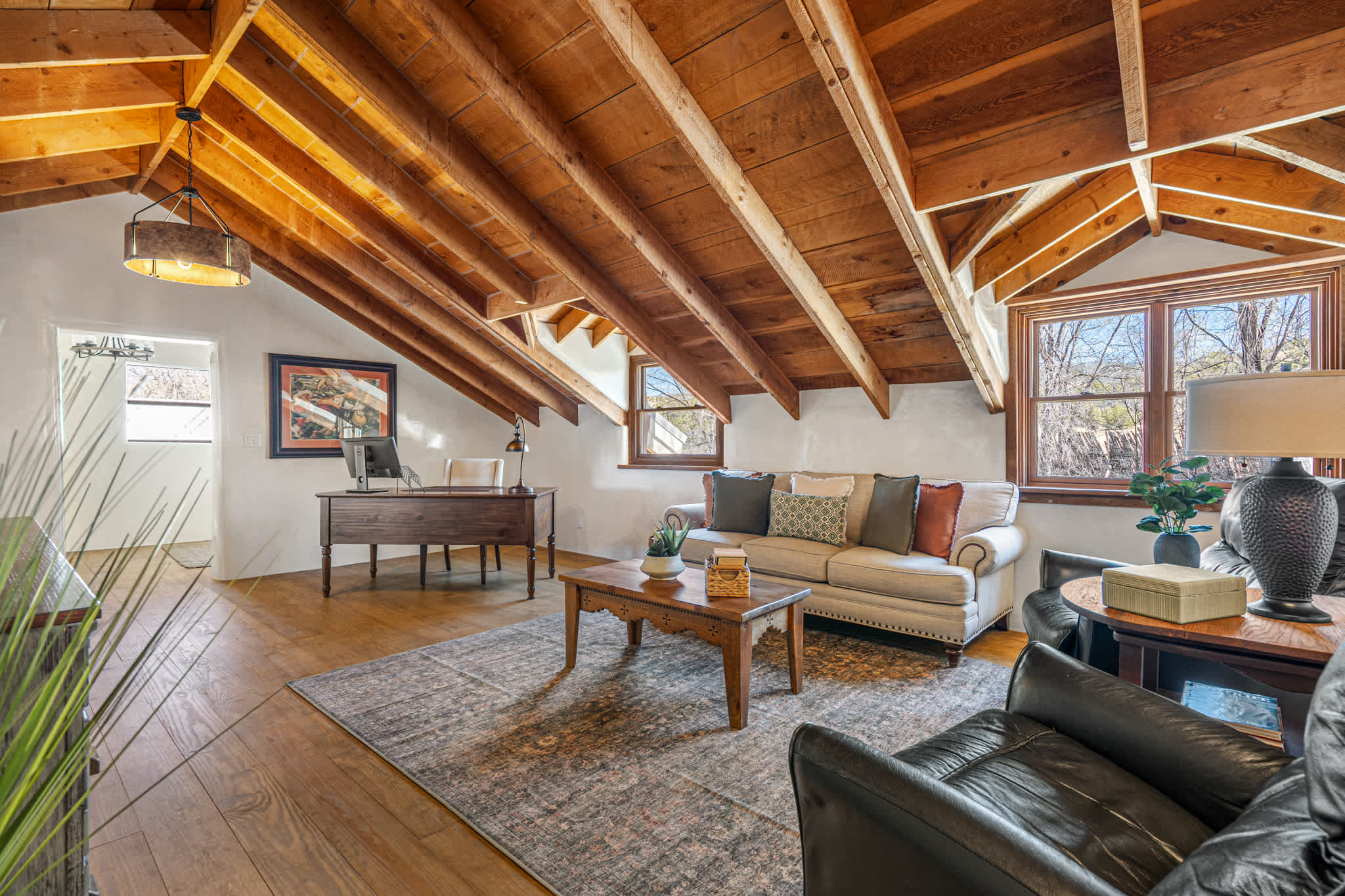The main living room is grounded by a traditional kiva fireplace and framed by rich wood beams and large windows that bring in natural light. Leather seating and plush textiles create a comfortable setting for conversation or relaxing evenings. A second upstairs living area offers additional space to unwind, with vaulted ceilings, cozy seating, and a quiet, tucked away feel, ideal for reading, work, or movie nights. Mini split systems throughout ensure year round comfort.