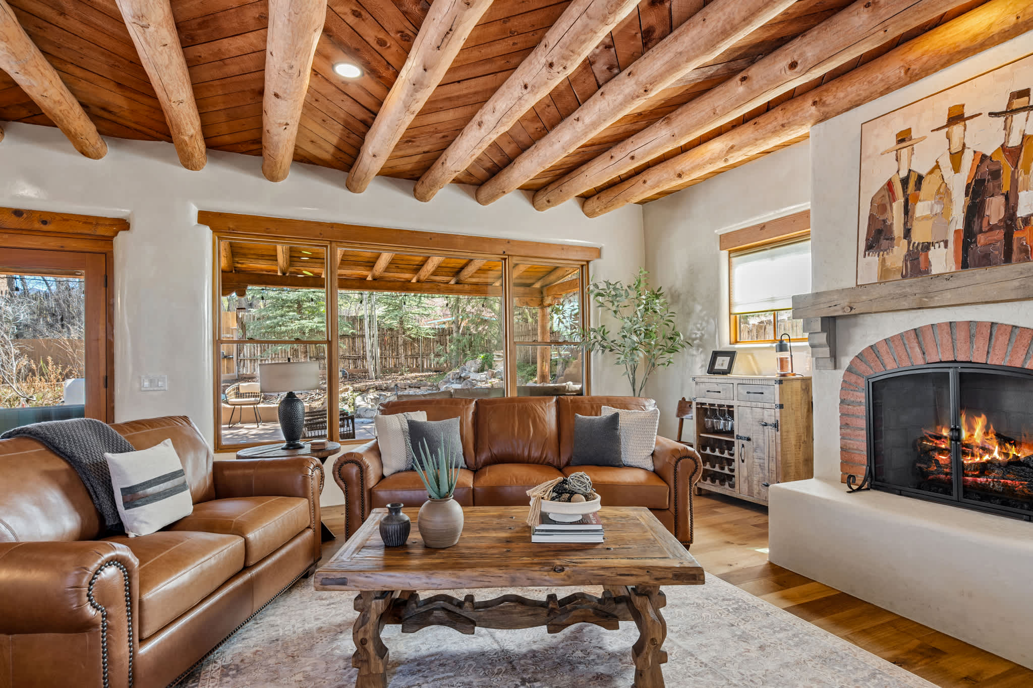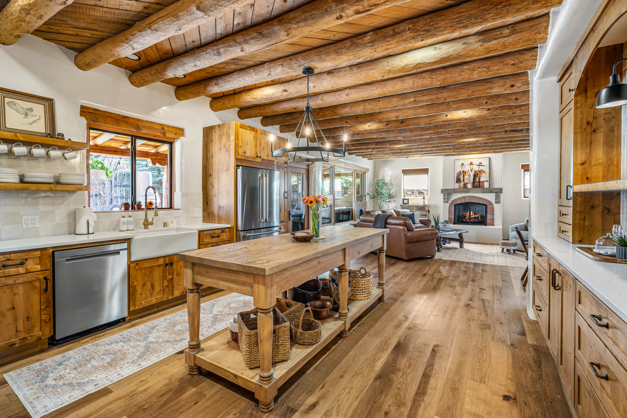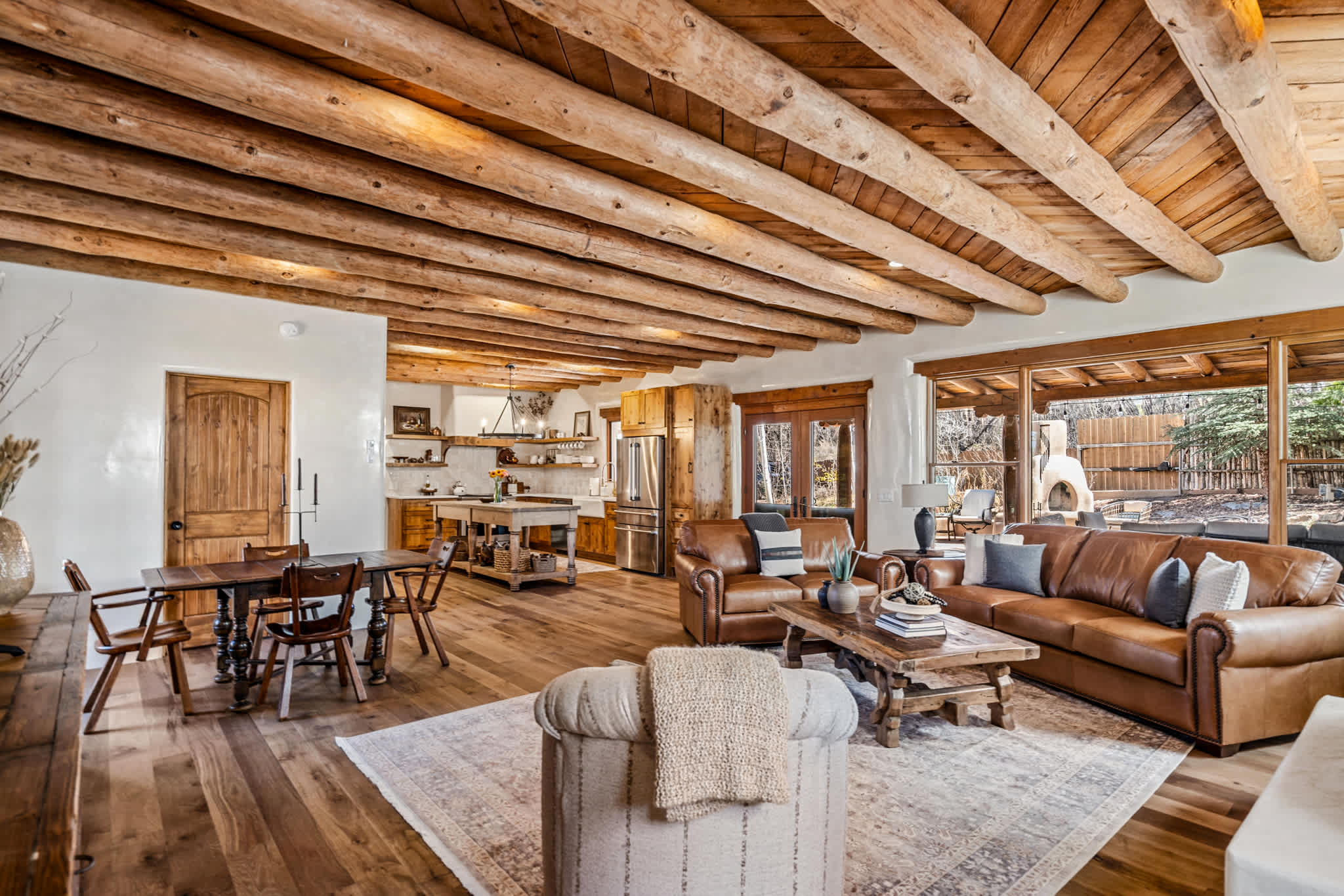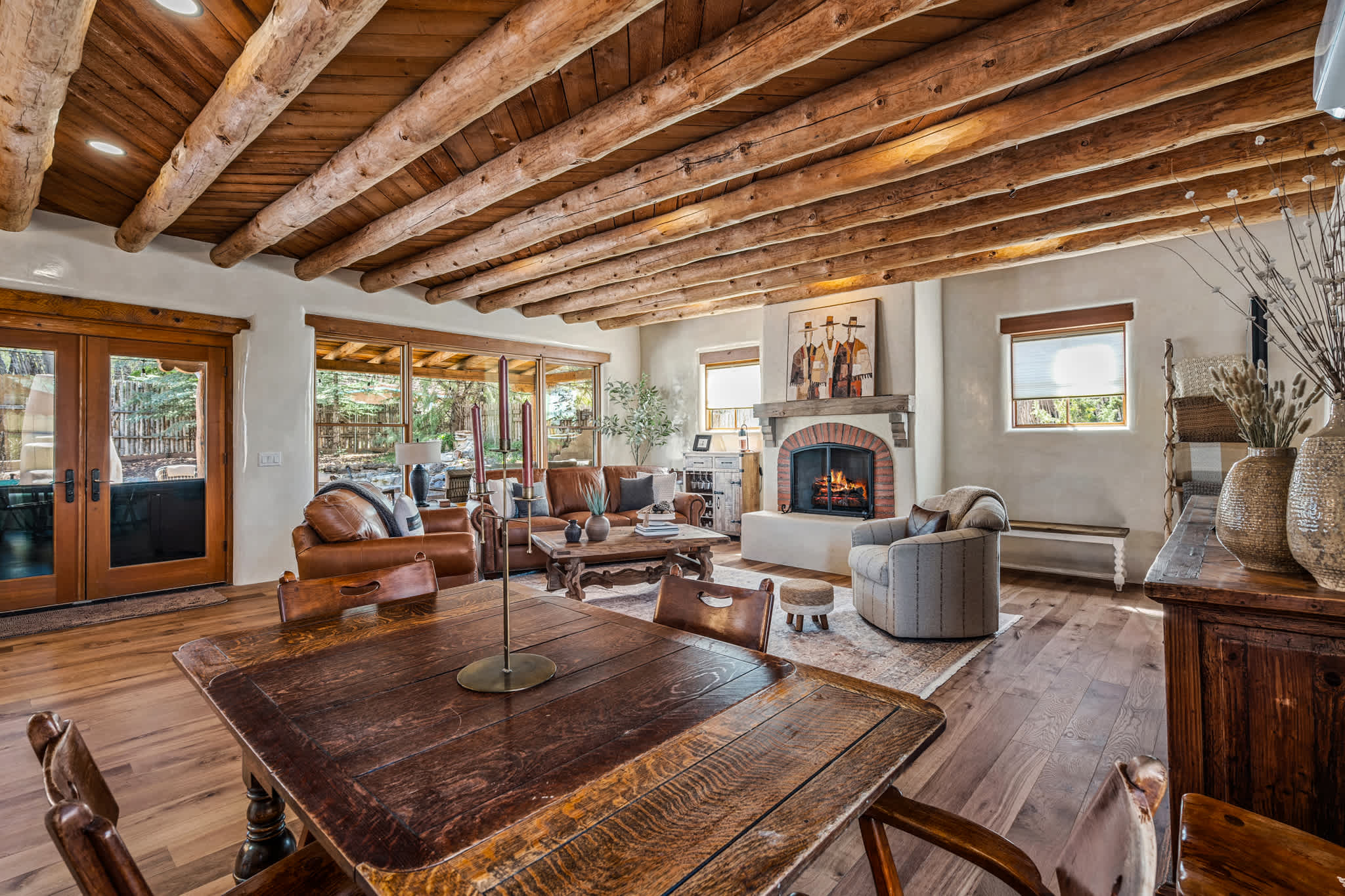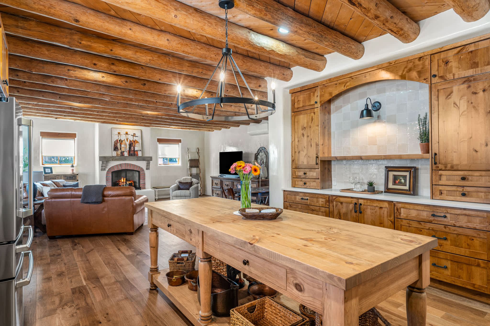 Set on a quiet property in the village of Tesuque just minutes from the famed Tesuque Village Market, this transformed expansive Santa Fe adobe style home blends classic Southwestern architecture with refined, modern comfort. Exposed vigas, wide plank wood floors, hand troweled plaster walls, and thoughtfully curated furnishings create a warm, high end retreat. With multiple living areas, a chef’s kitchen, spacious bedrooms, and inviting outdoor spaces, including a hot tub and kiva fireplace, this home is well suited for families or groups seeking both privacy and style.