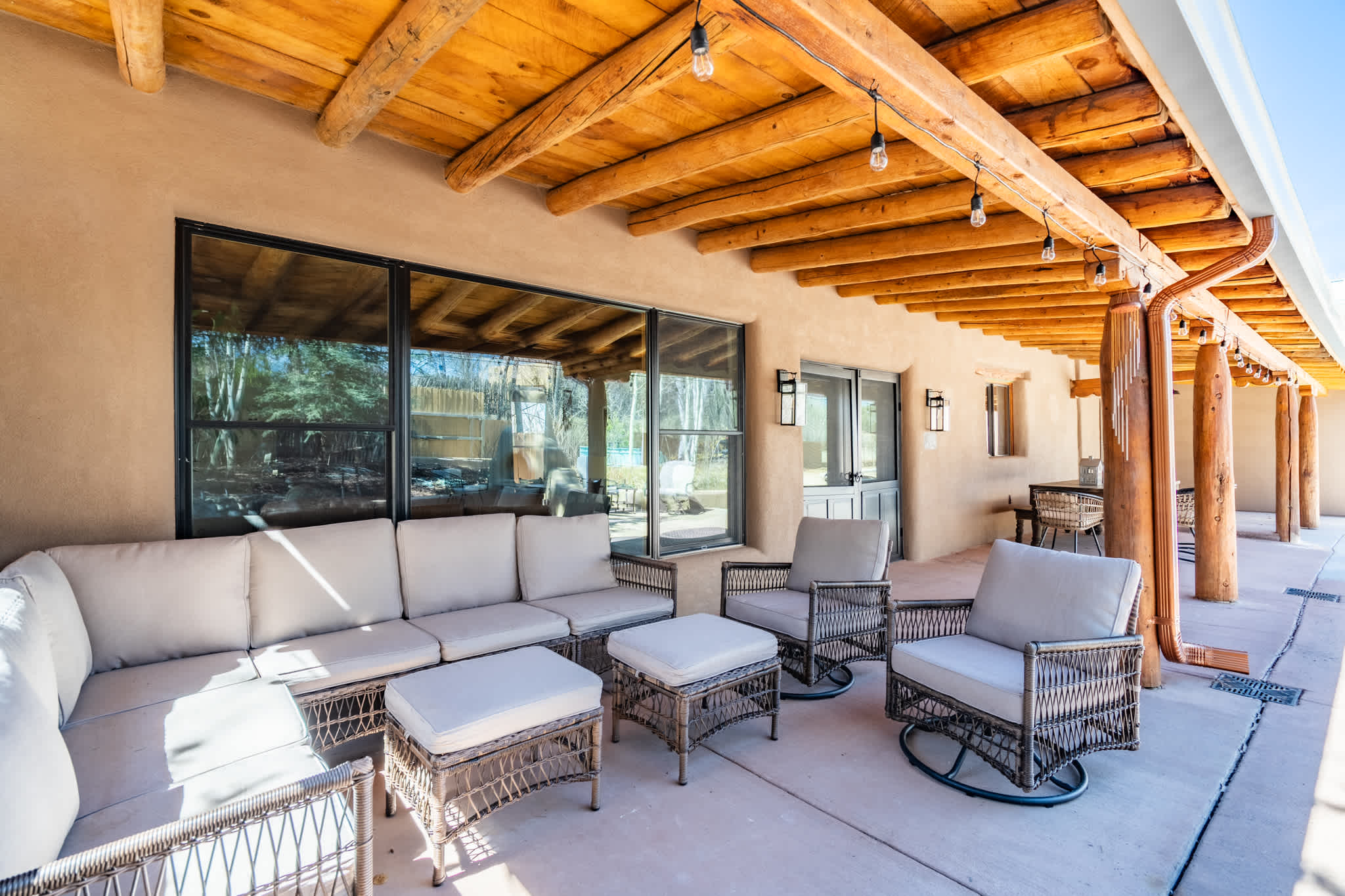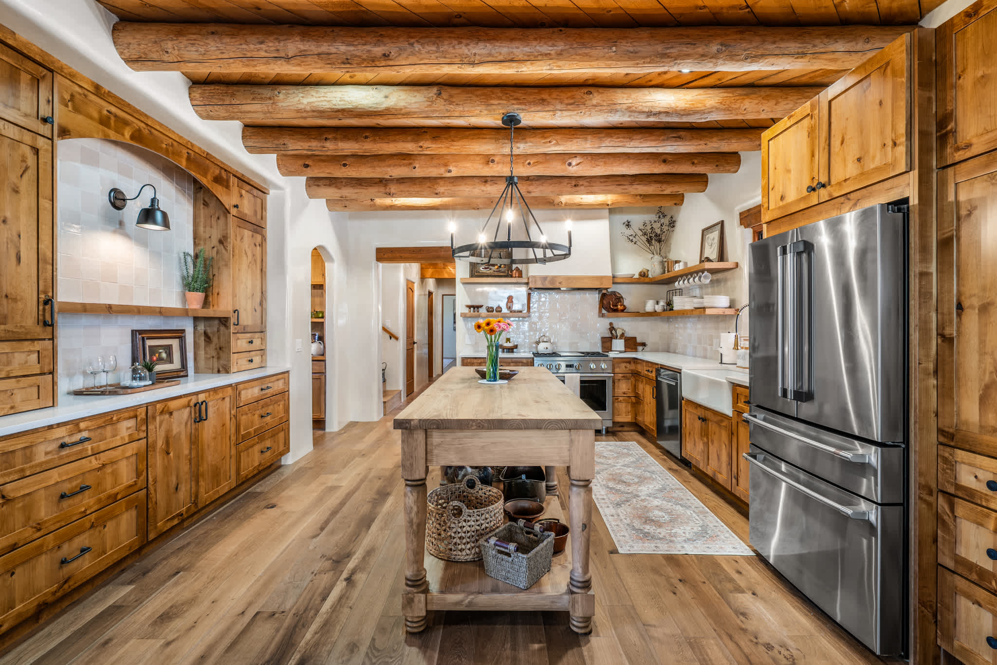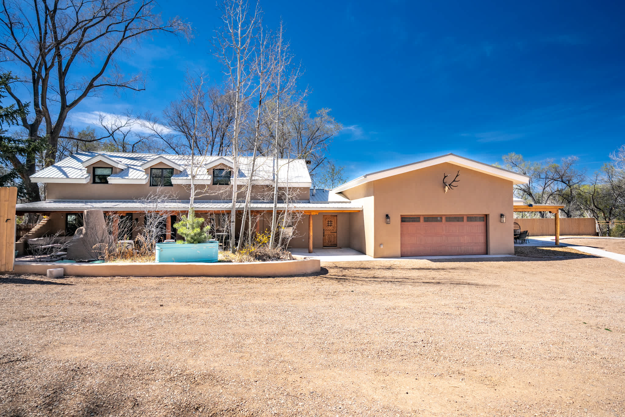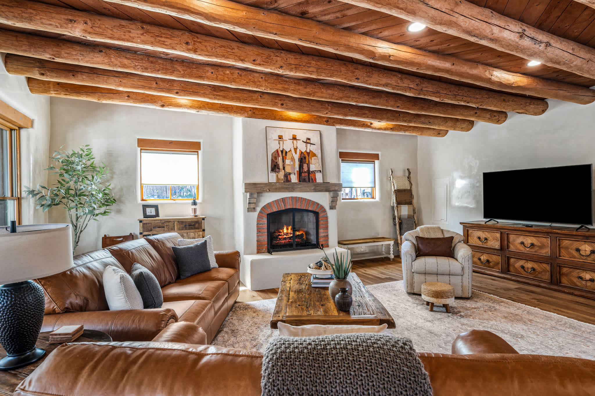 Set on a quiet property in the village of Tesuque just minutes from the famed Tesuque Village Market, this transformed expansive Santa Fe adobe style home blends classic Southwestern architecture with refined, modern comfort. Exposed vigas, wide plank wood floors, hand troweled plaster walls, and thoughtfully curated furnishings create a warm, high end retreat. With multiple living areas, a chef’s kitchen, spacious bedrooms, and inviting outdoor spaces, including a hot tub and kiva fireplace, this home is well suited for families or groups seeking both privacy and style.