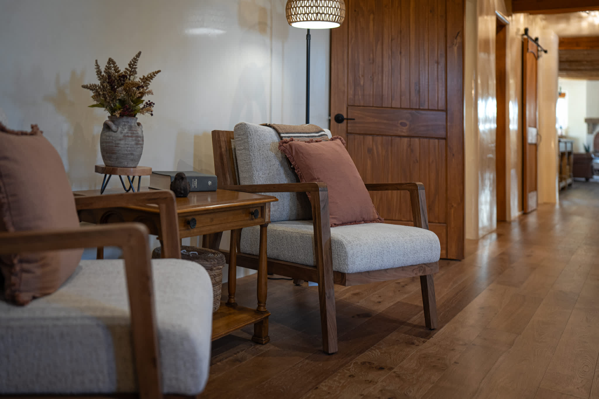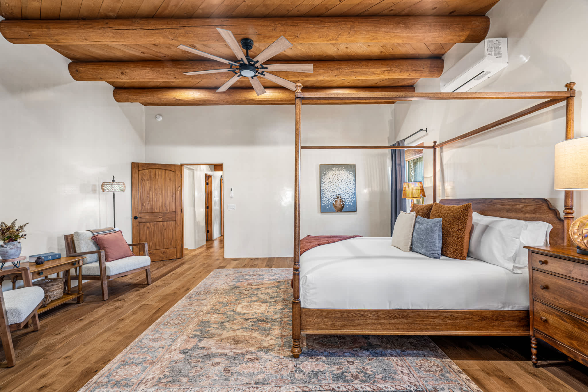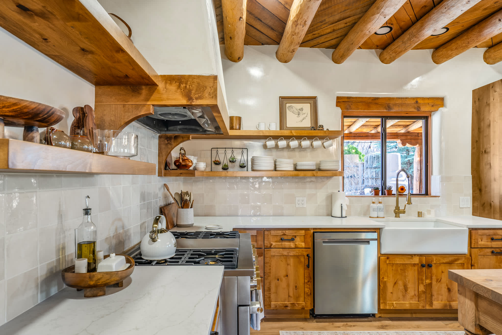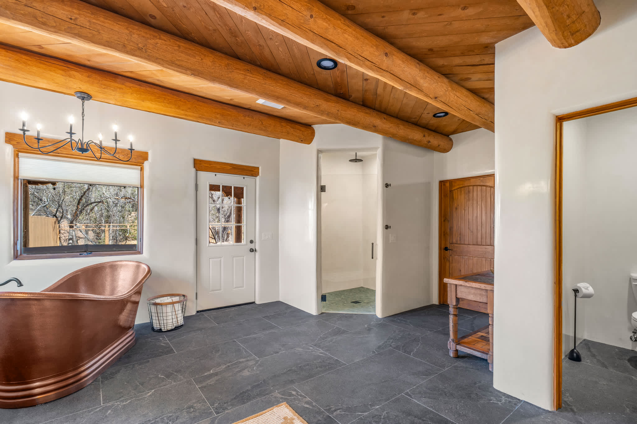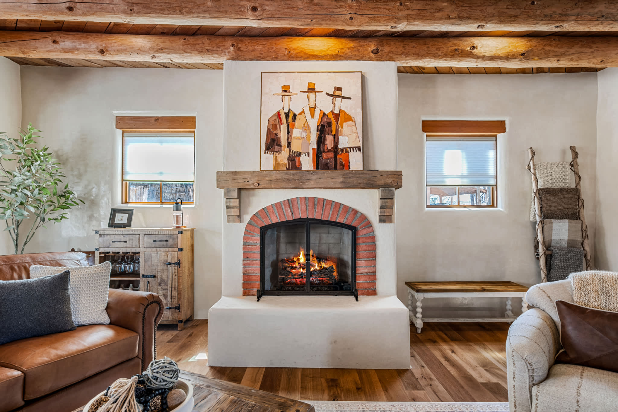 Set on a quiet property in the village of Tesuque just minutes from the famed Tesuque Village Market, this transformed expansive Santa Fe adobe style home blends classic Southwestern architecture with refined, modern comfort. Exposed vigas, wide plank wood floors, hand troweled plaster walls, and thoughtfully curated furnishings create a warm, high end retreat. With multiple living areas, a chef’s kitchen, spacious bedrooms, and inviting outdoor spaces, including a hot tub and kiva fireplace, this home is well suited for families or groups seeking both privacy and style.