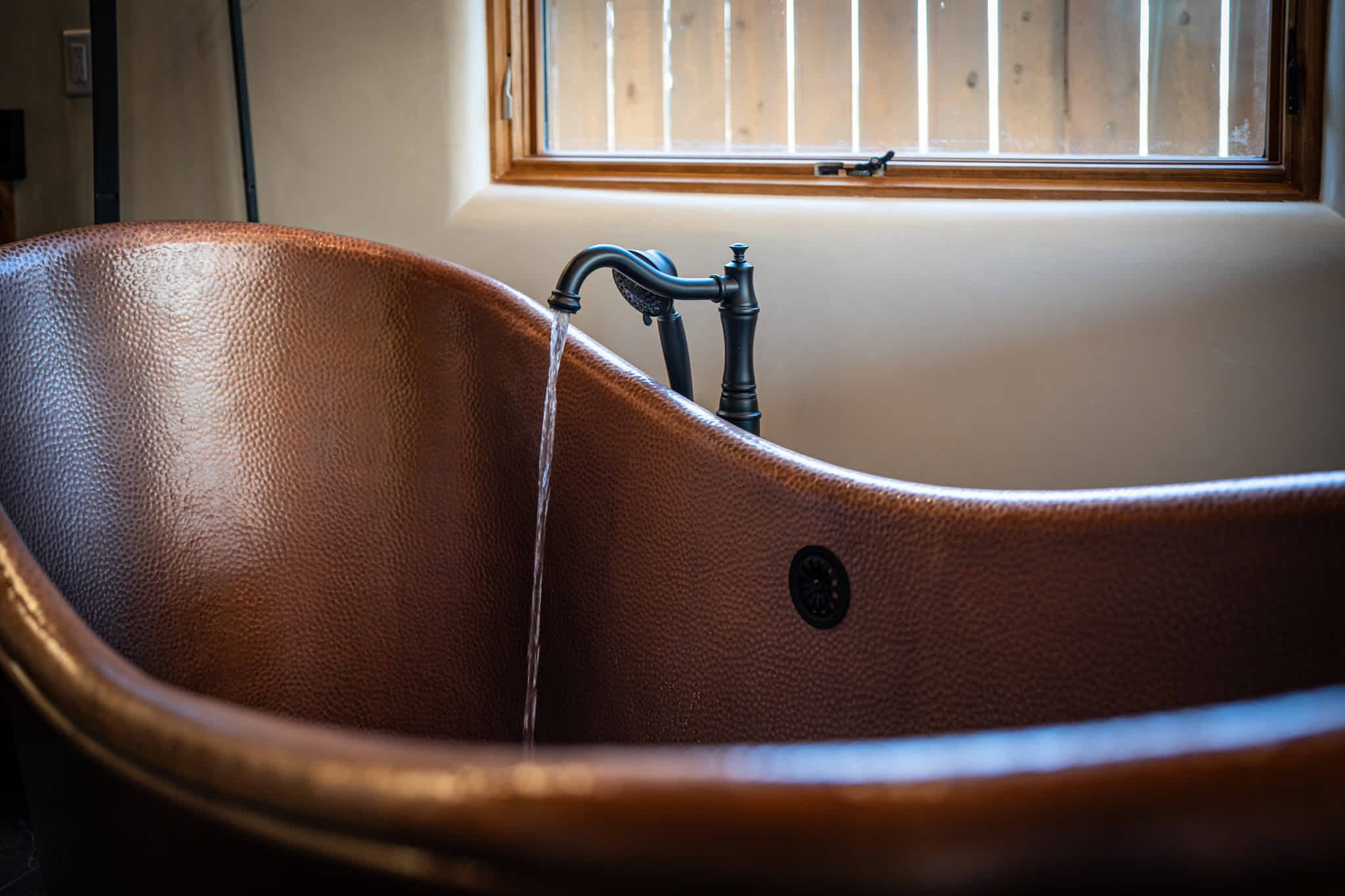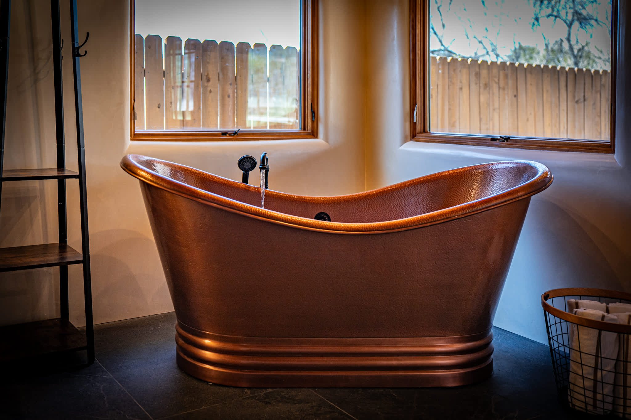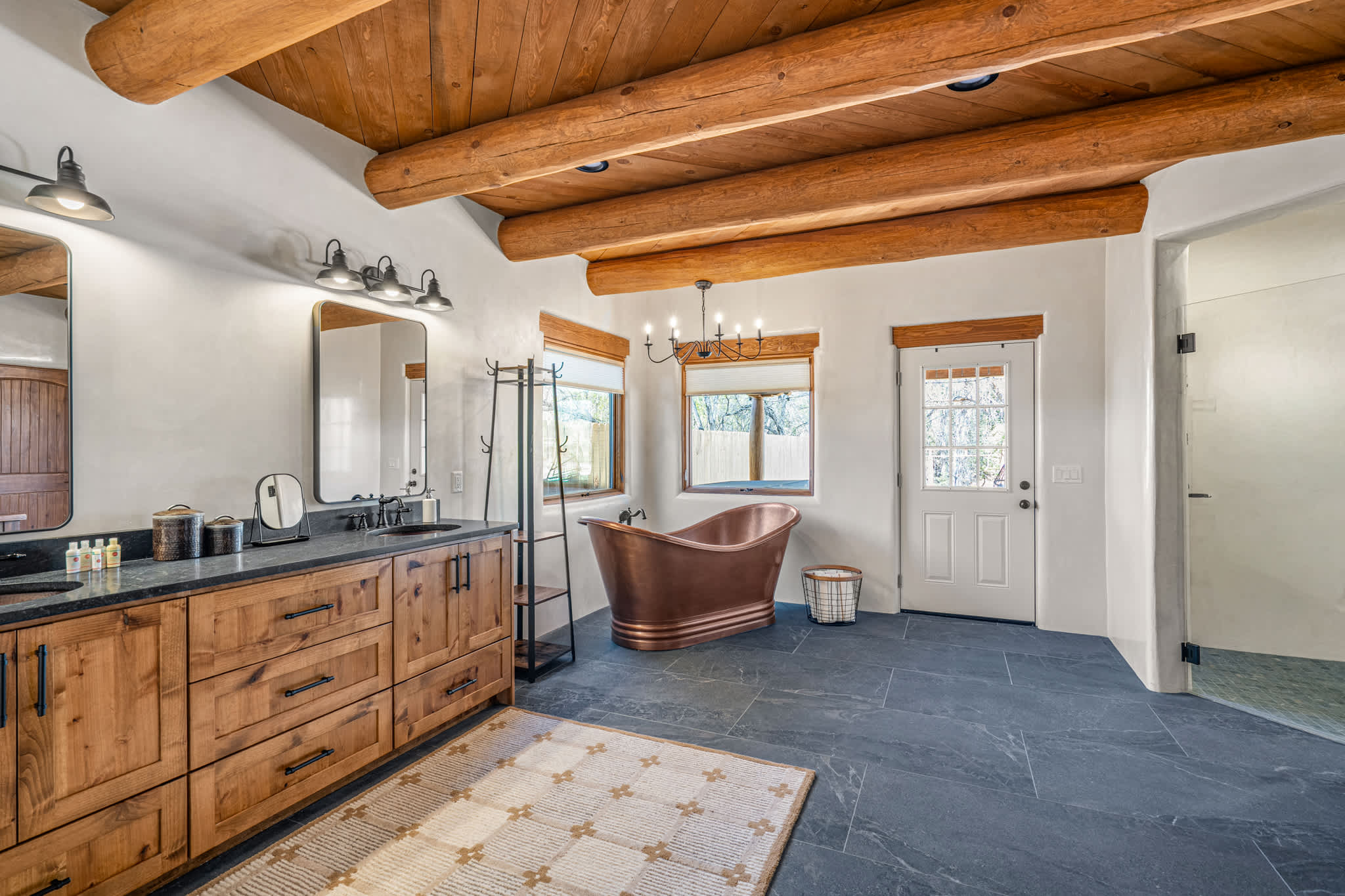 Bedrooms are spacious and thoughtfully designed, each with superior Frette linens and a calm, uncluttered aesthetic. The primary suite is located on the first floor and features a statement bed, high ceilings, and direct access to a luxurious en suite bath with soaking copper tub and oversized sculpted shower. Anchoring the second level is a large bedroom with two queen size beds perfect for friends or teenagers. Also located on this level is an additional full bath with a walk in shower.