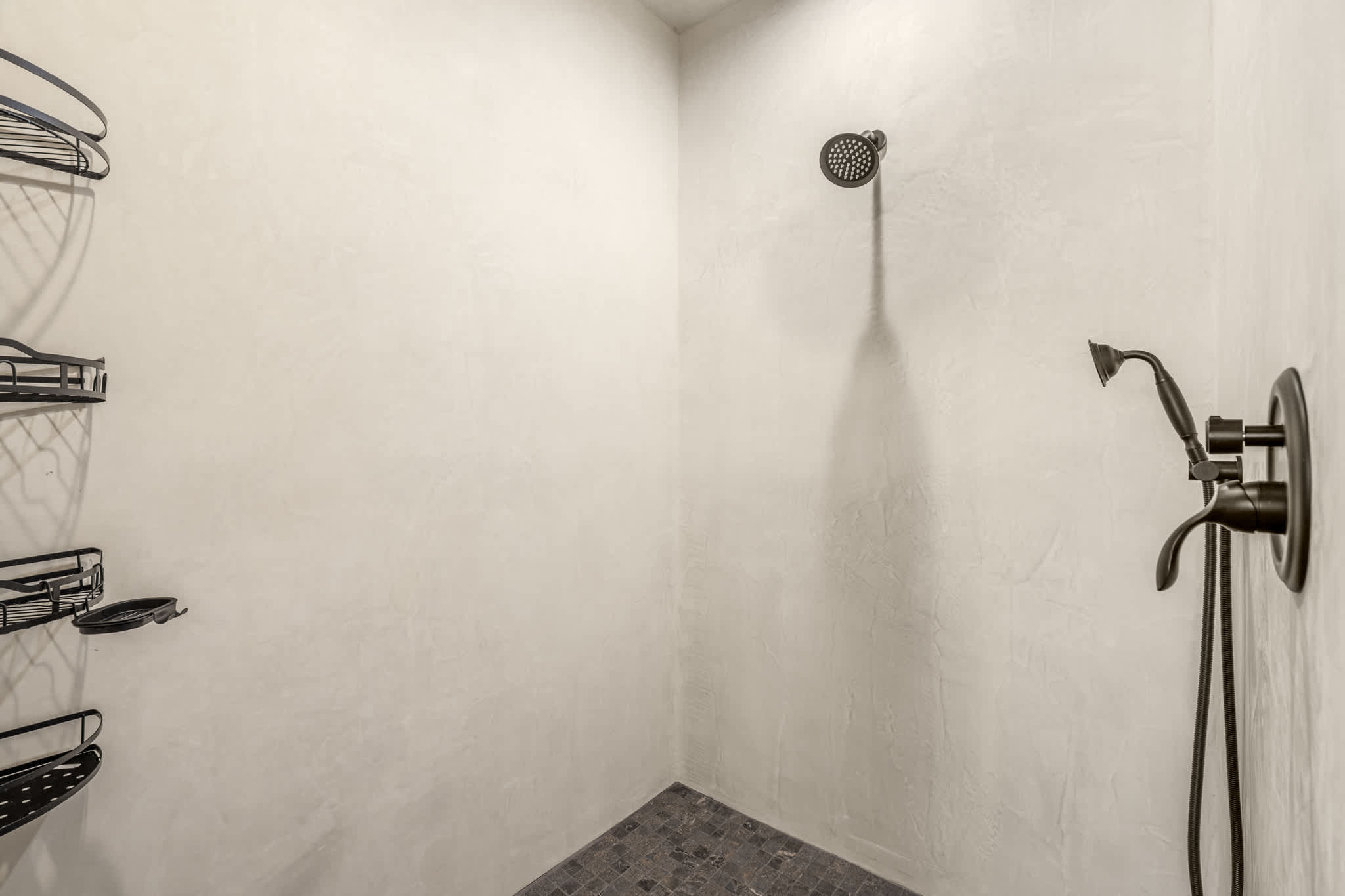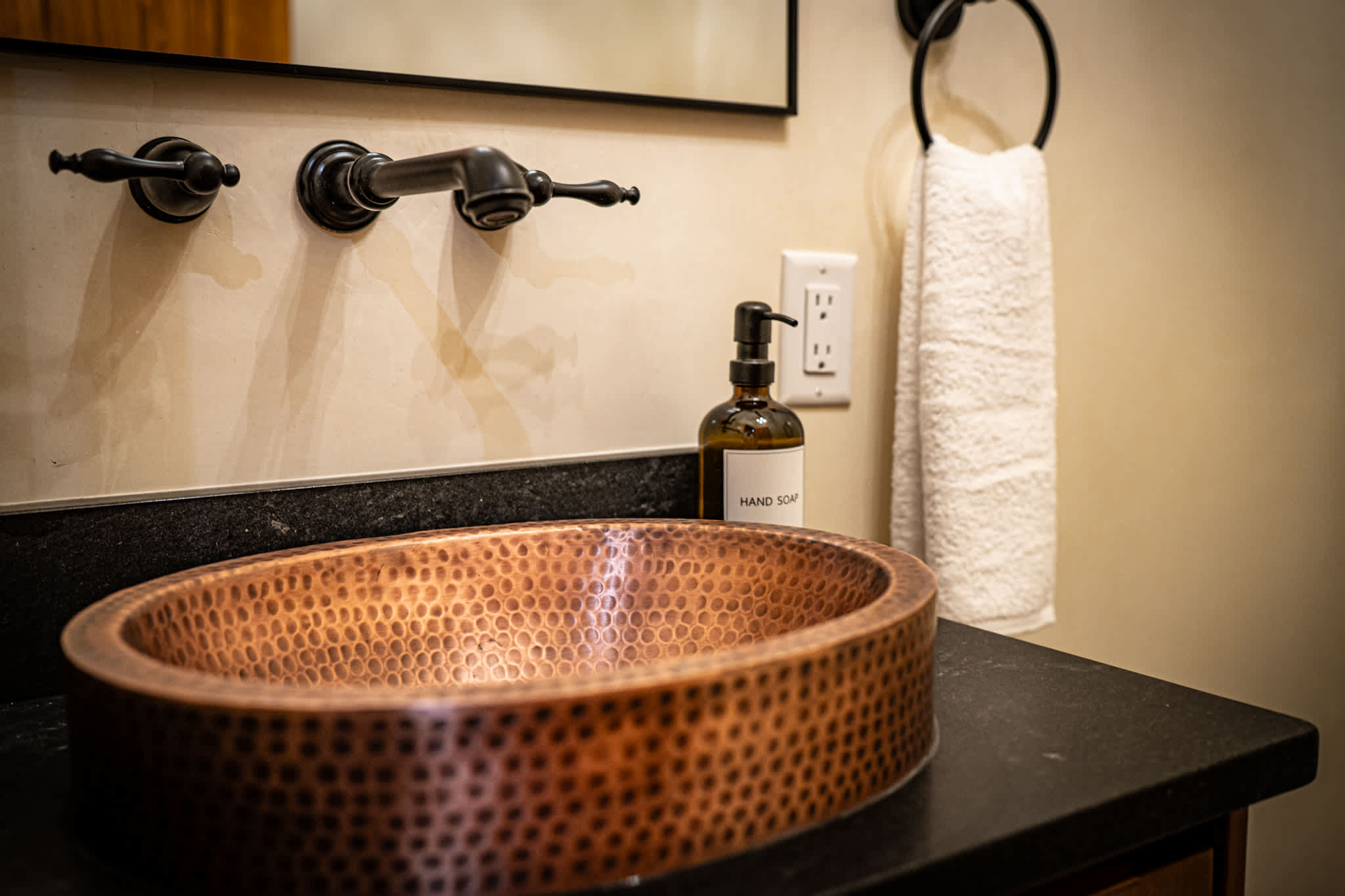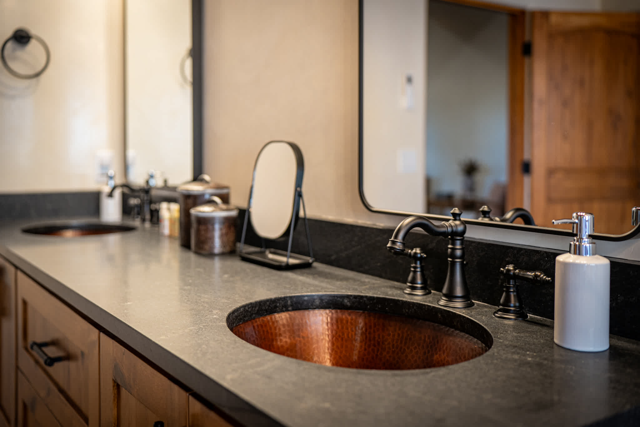 Bedrooms are spacious and thoughtfully designed, each with superior Frette linens and a calm, uncluttered aesthetic. The primary suite is located on the first floor and features a statement bed, high ceilings, and direct access to a luxurious en suite bath with soaking copper tub and oversized sculpted shower. Anchoring the second level is a large bedroom with two queen size beds perfect for friends or teenagers. Also located on this level is an additional full bath with a walk in shower.