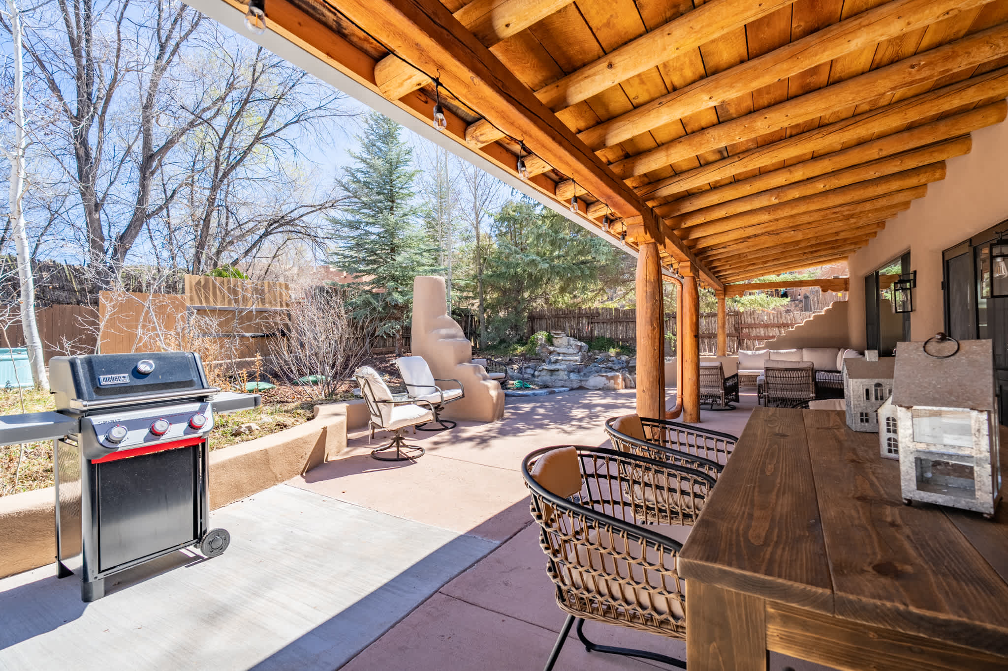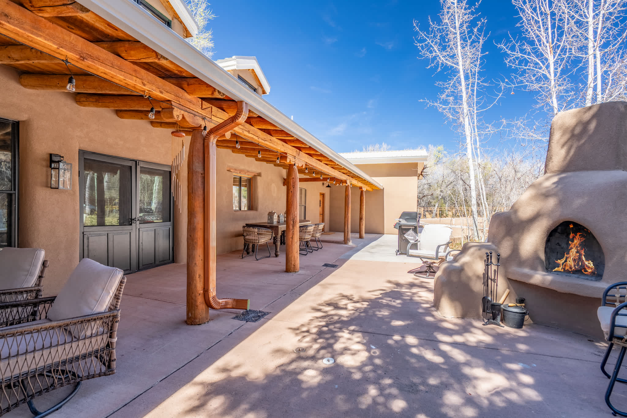 Outdoor living is a key highlight. The covered portal provides shaded seating and dining areas, perfect for morning coffee or evening meals. A traditional outdoor kiva fireplace creates a natural gathering point, while the hot tub offers a private place to unwind under the open sky. Grandchildren have been kept in mind as the homeowners created a paved tricycle and bicycle path around the garden of the exterior. The setting is quiet and spacious, with a sense of seclusion while still being accessible to town