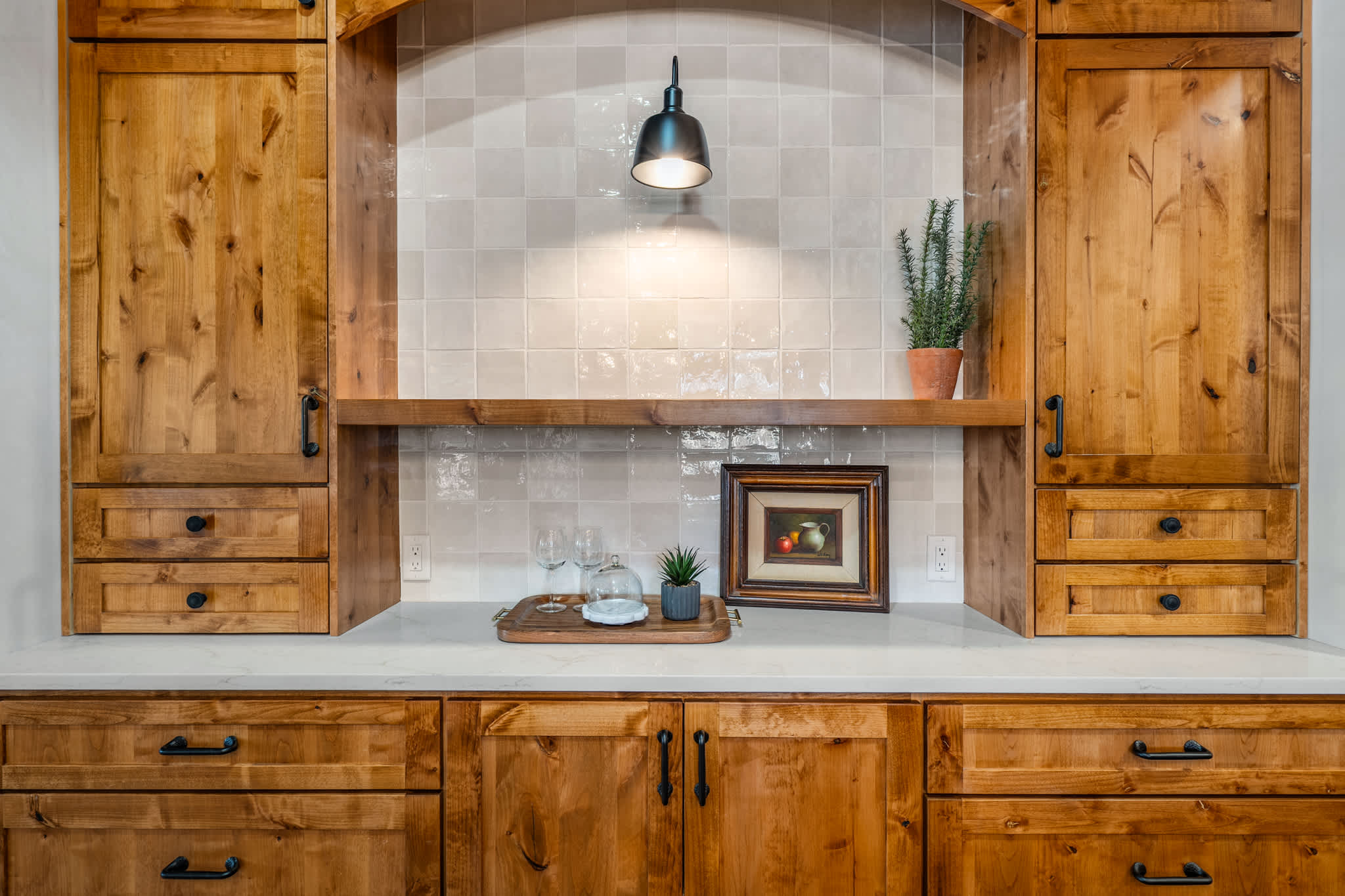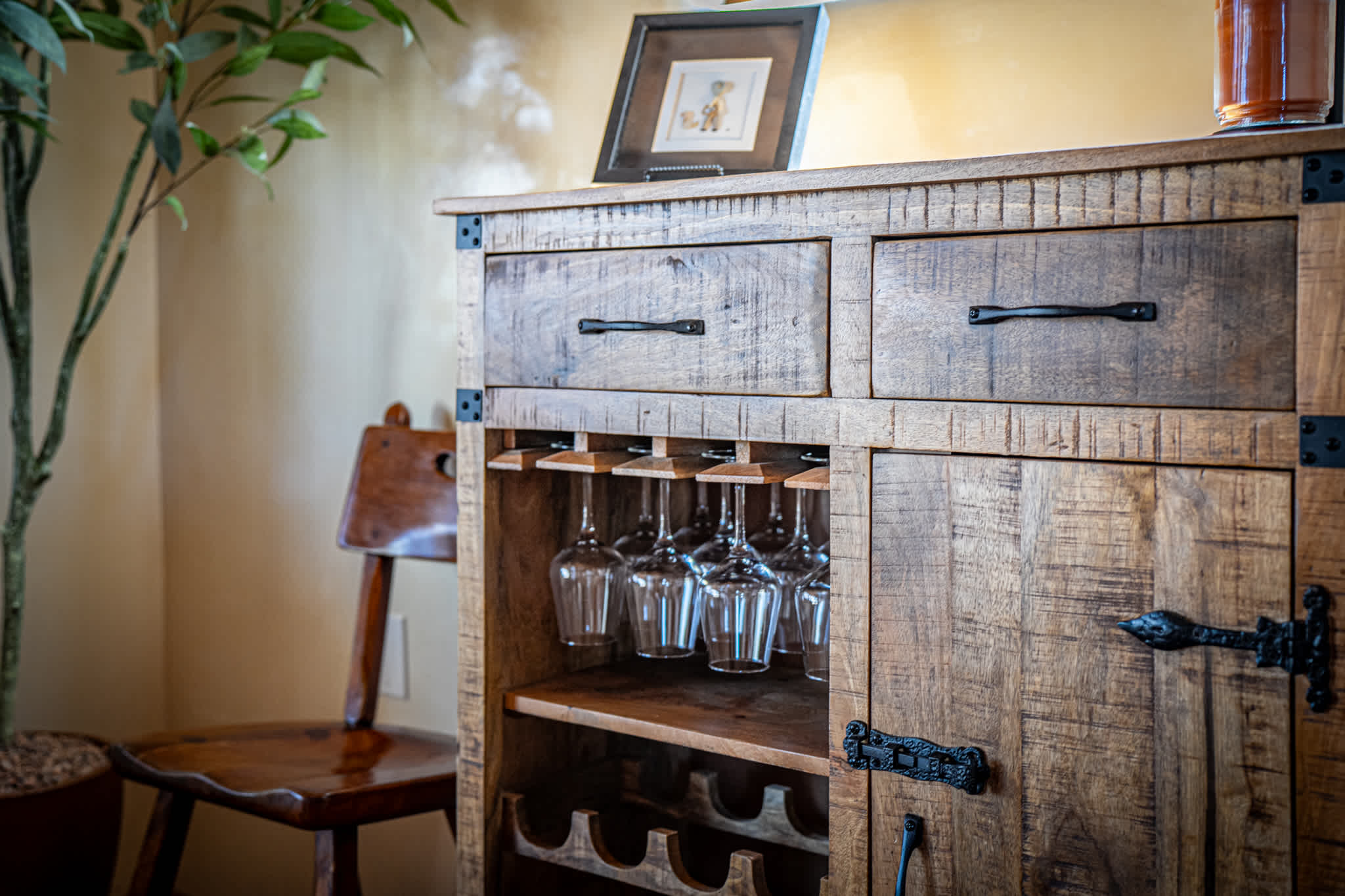 The kitchen is both functional and visually striking, with artisan wood cabinetry, open shelving, stone countertops, and a large central island. High end appliances and generous prep space make it easy to cook for a group. The adjacent dining area features a hand finished wood table with seating for shared meals, while the open layout keeps everyone connected.