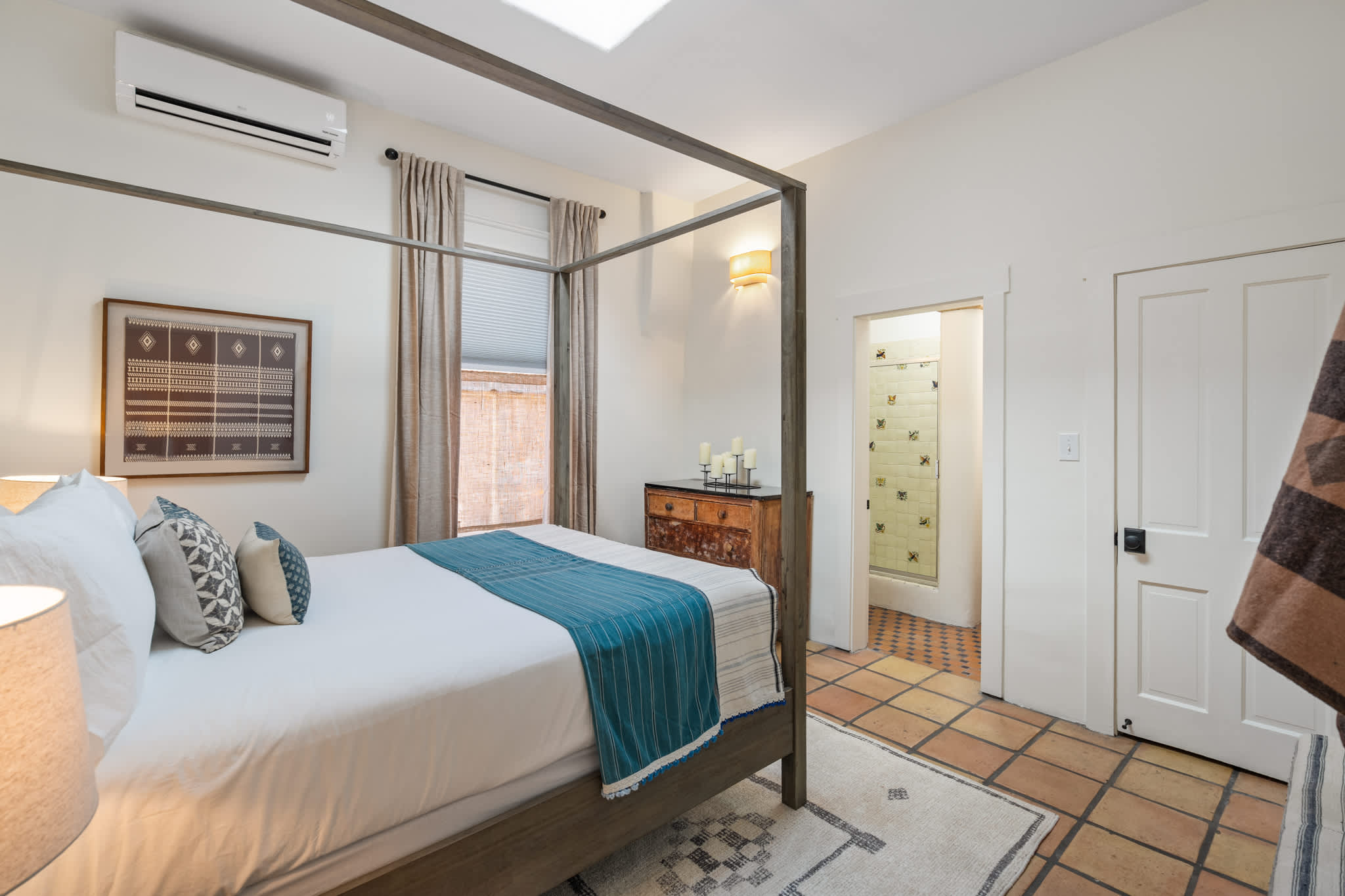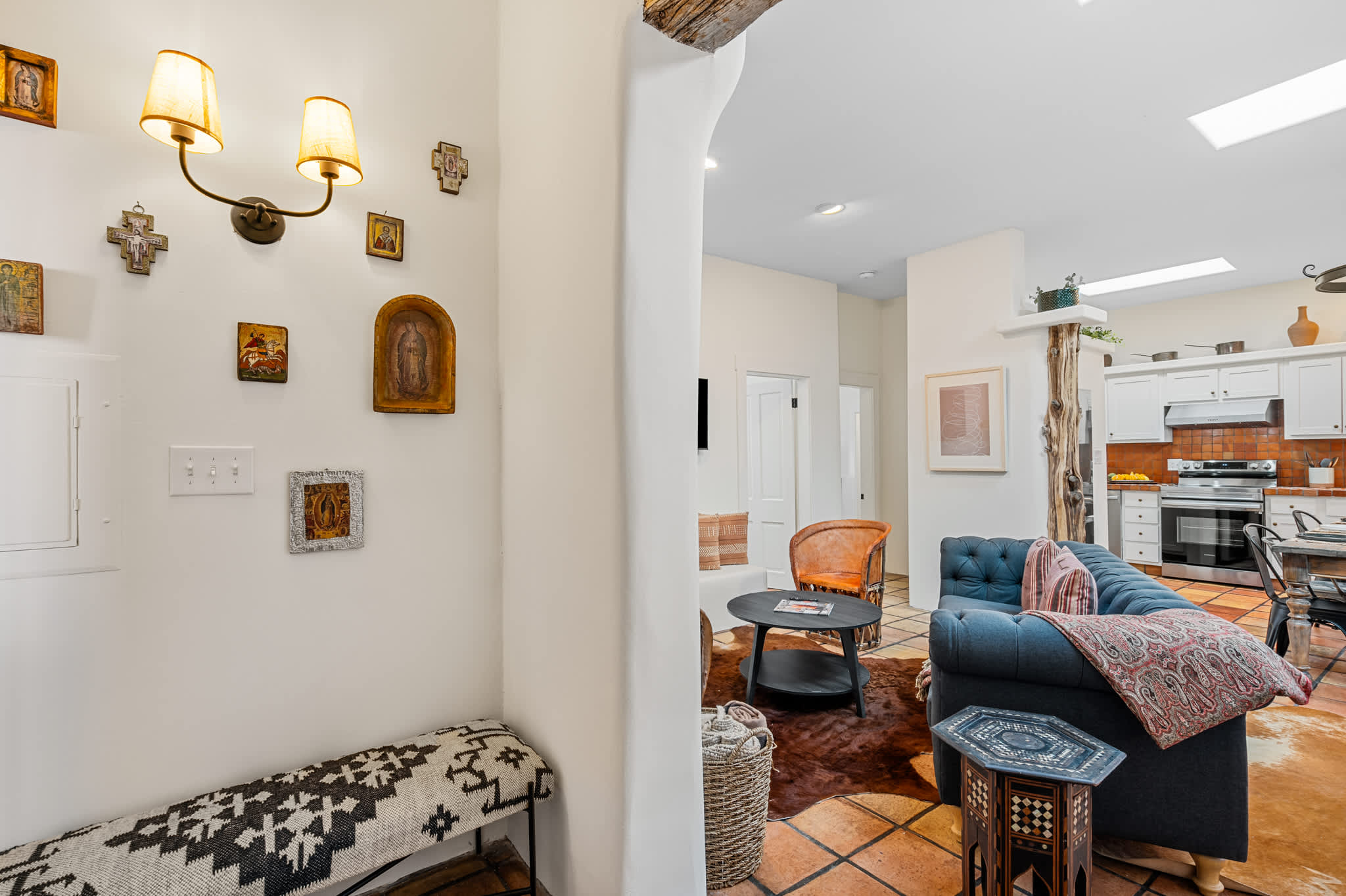 Around the corner from the Georgia O’Keeffe Museum this bright, stylish, and unmistakably Santa Fe single-level adobe retreat offers a relaxed home base with modern comforts and classic Southwestern character. High ceilings with skylights, saltillo tile floors, curated décor, and thoughtful updates create an easy, welcoming space to unwind after a day in town. Enjoy open-concept living, four bedrooms with private ensuite bathrooms, and a centrally located, yet tucked-away feel that’s perfect for couples, friends, or family traveling together.
