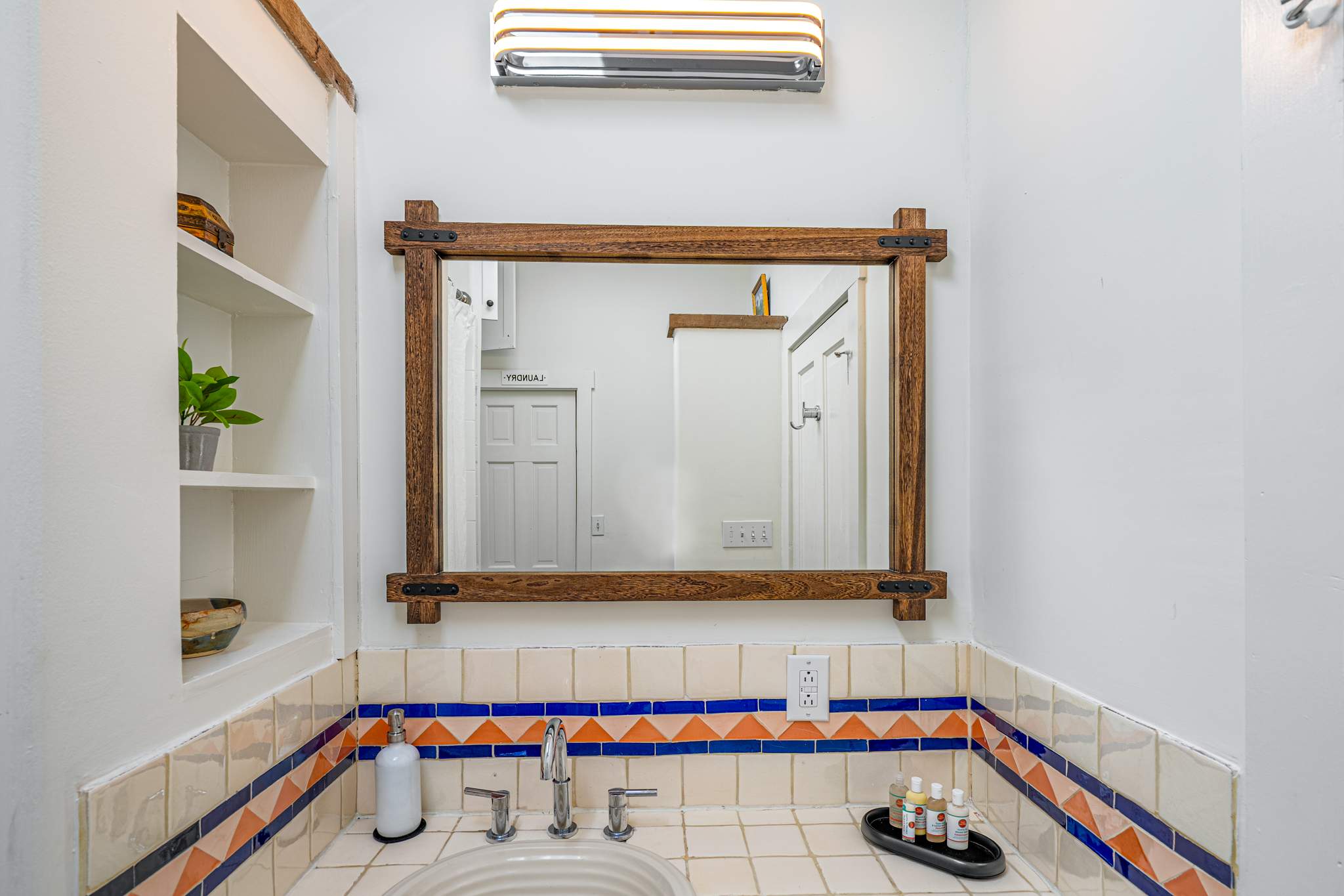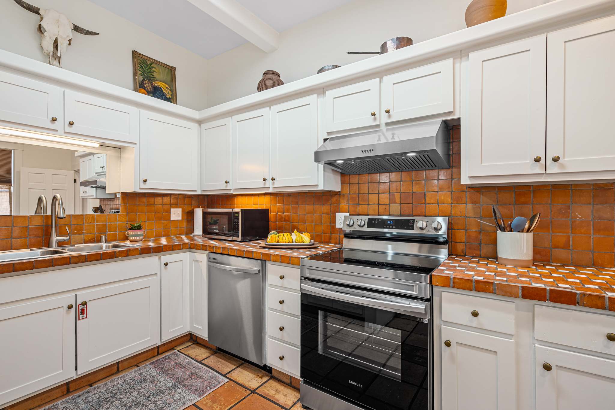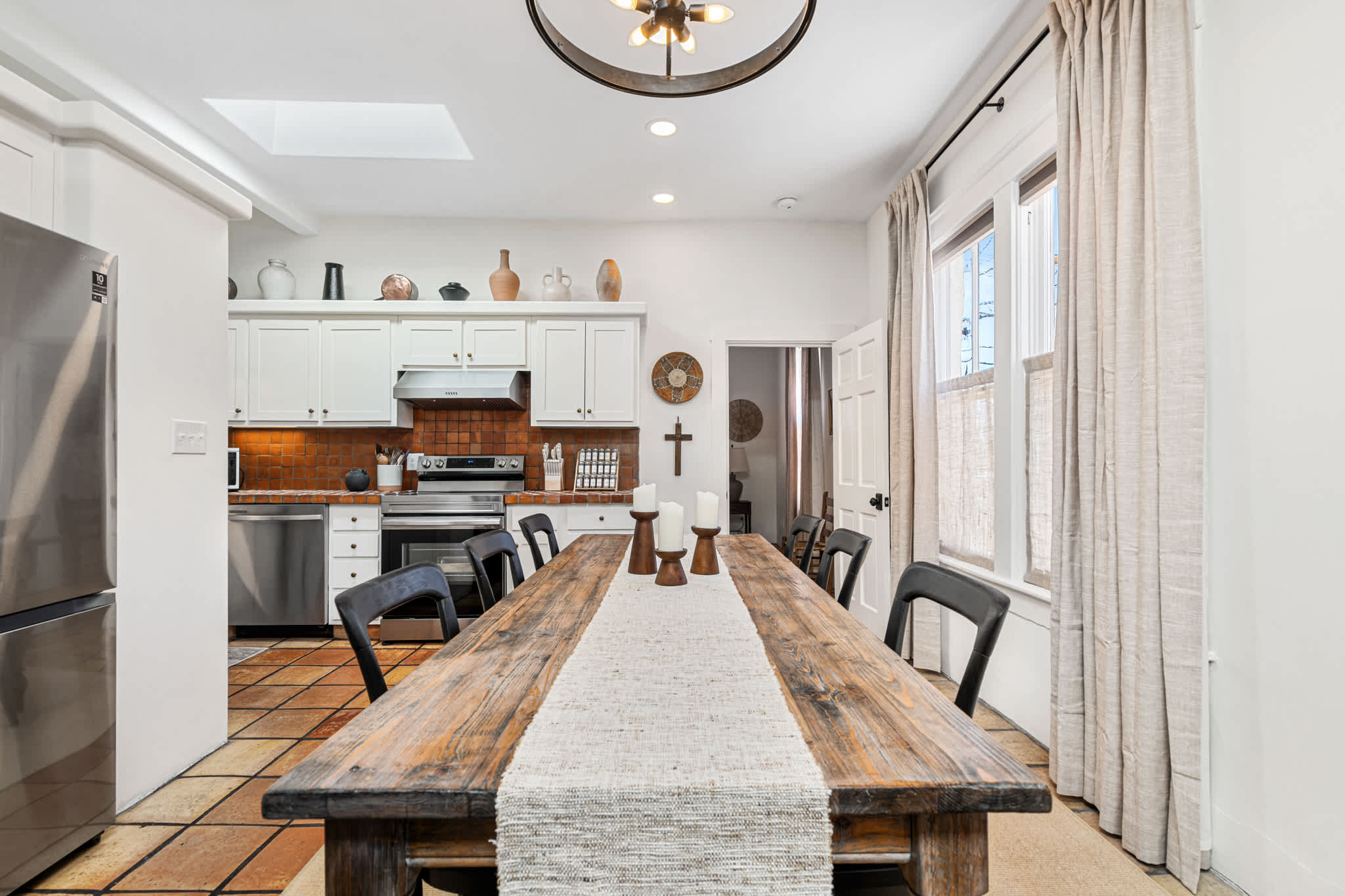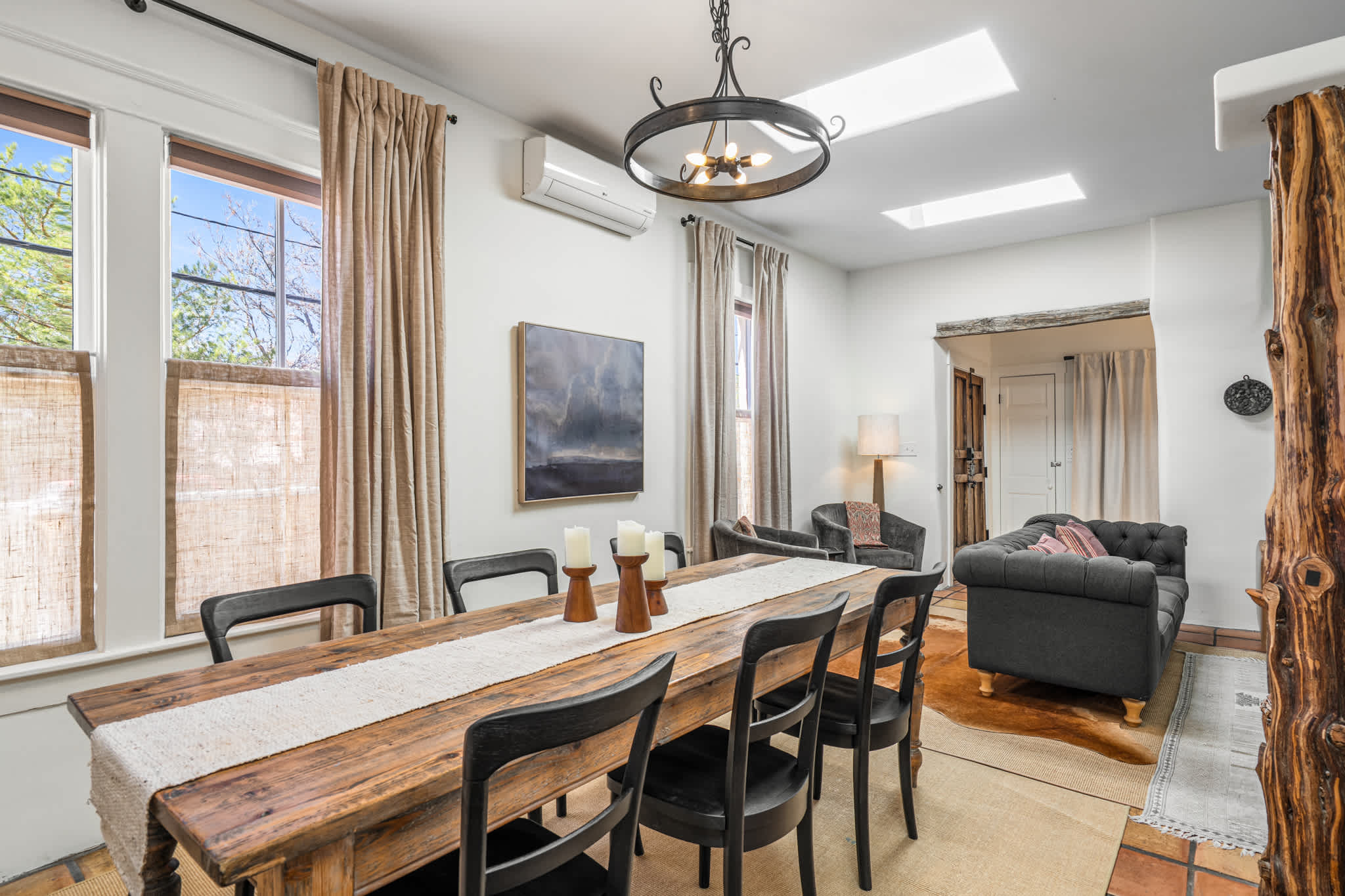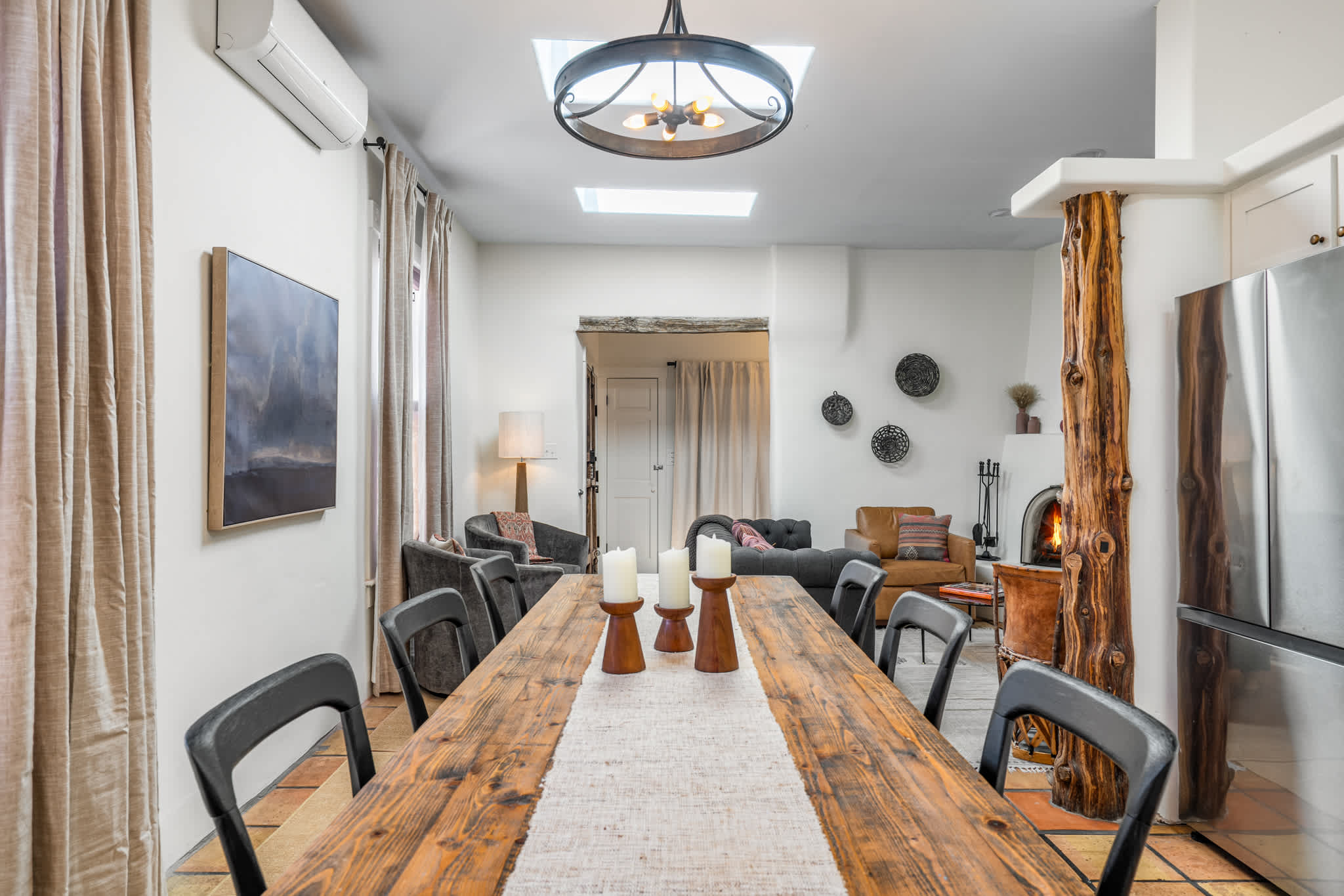 The kitchen is fully equipped for everything from quick breakfasts to full dinners at home. Crisp cabinetry, generous counters, and a full appliance suite make cooking simple, while the warm tile backsplash adds a Santa Fe touch. The large rustic dining table sits in the heart of the space and comfortably seats your group for meals, games, or planning the next day’s adventures.