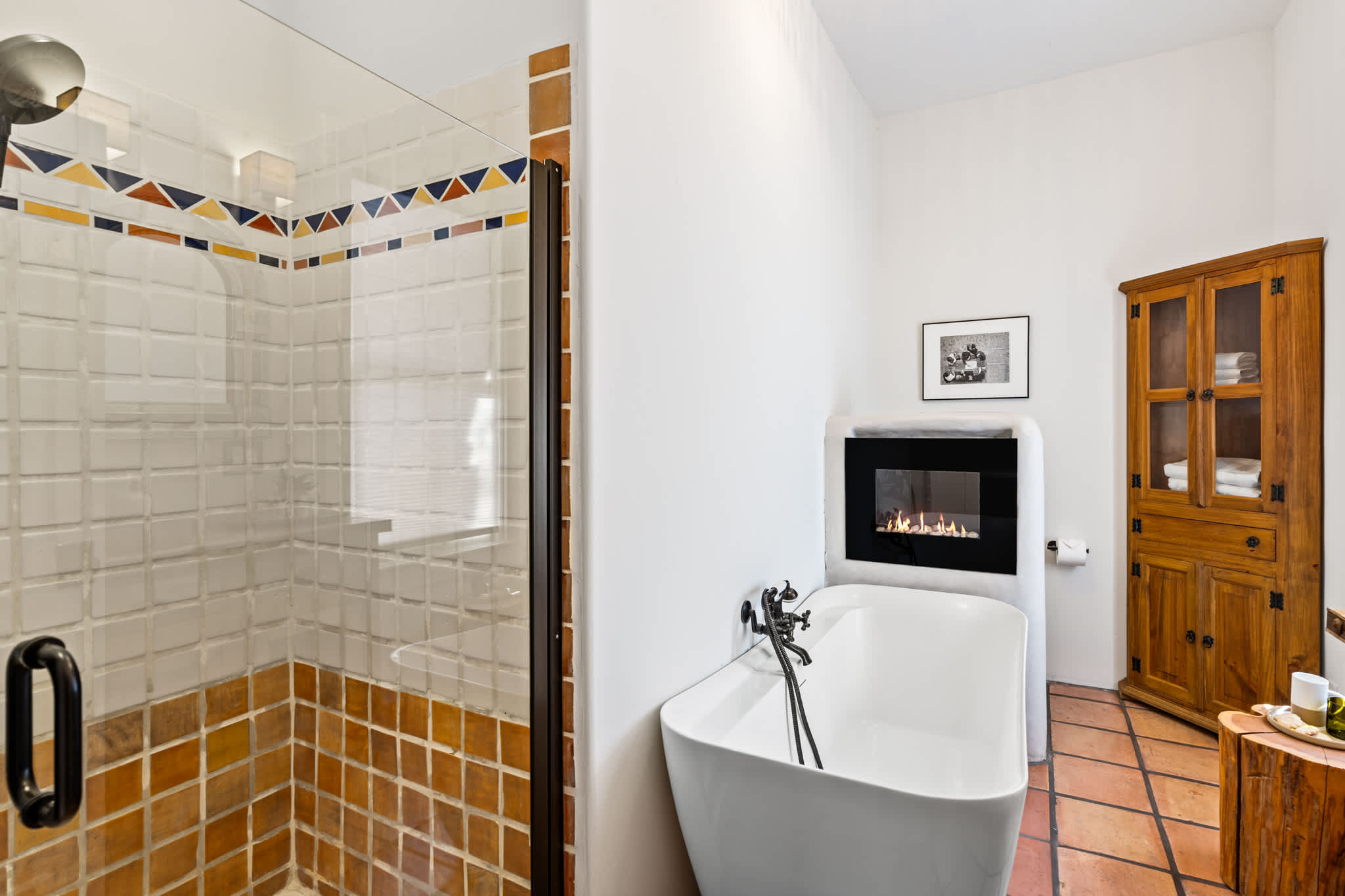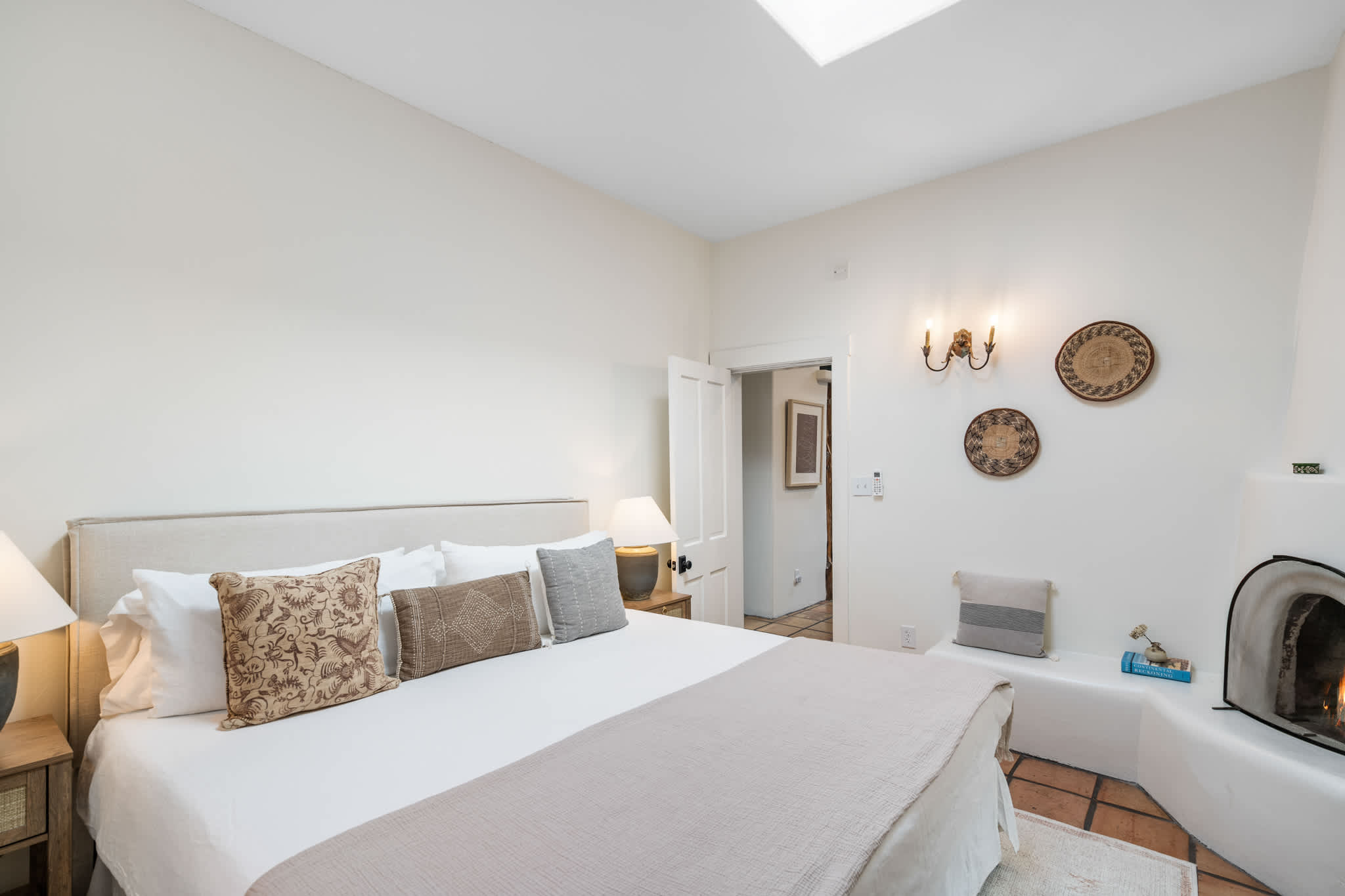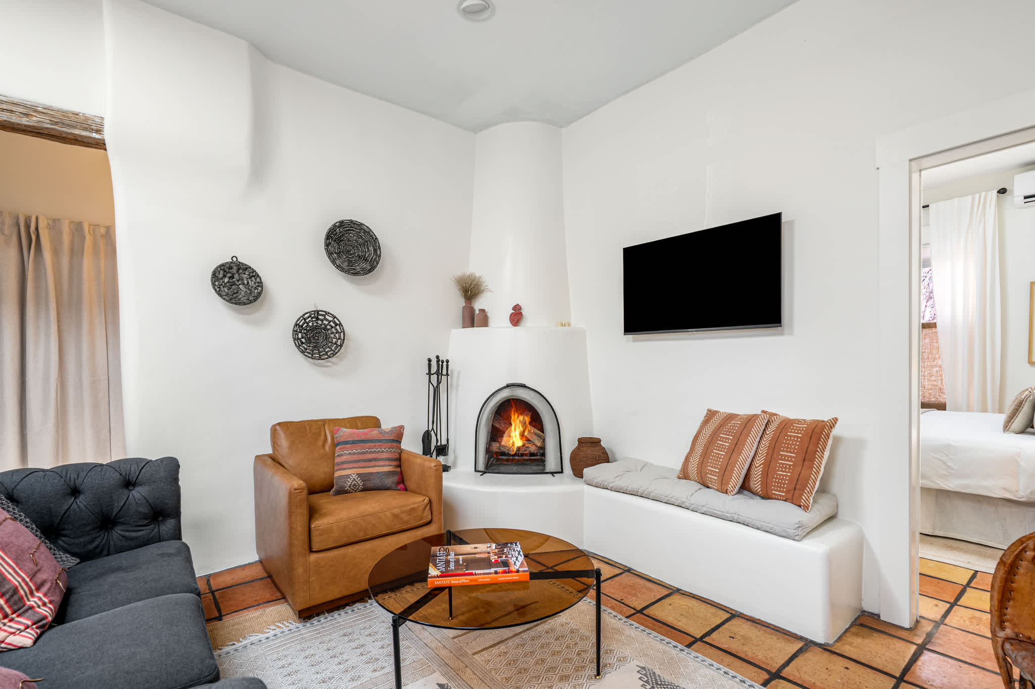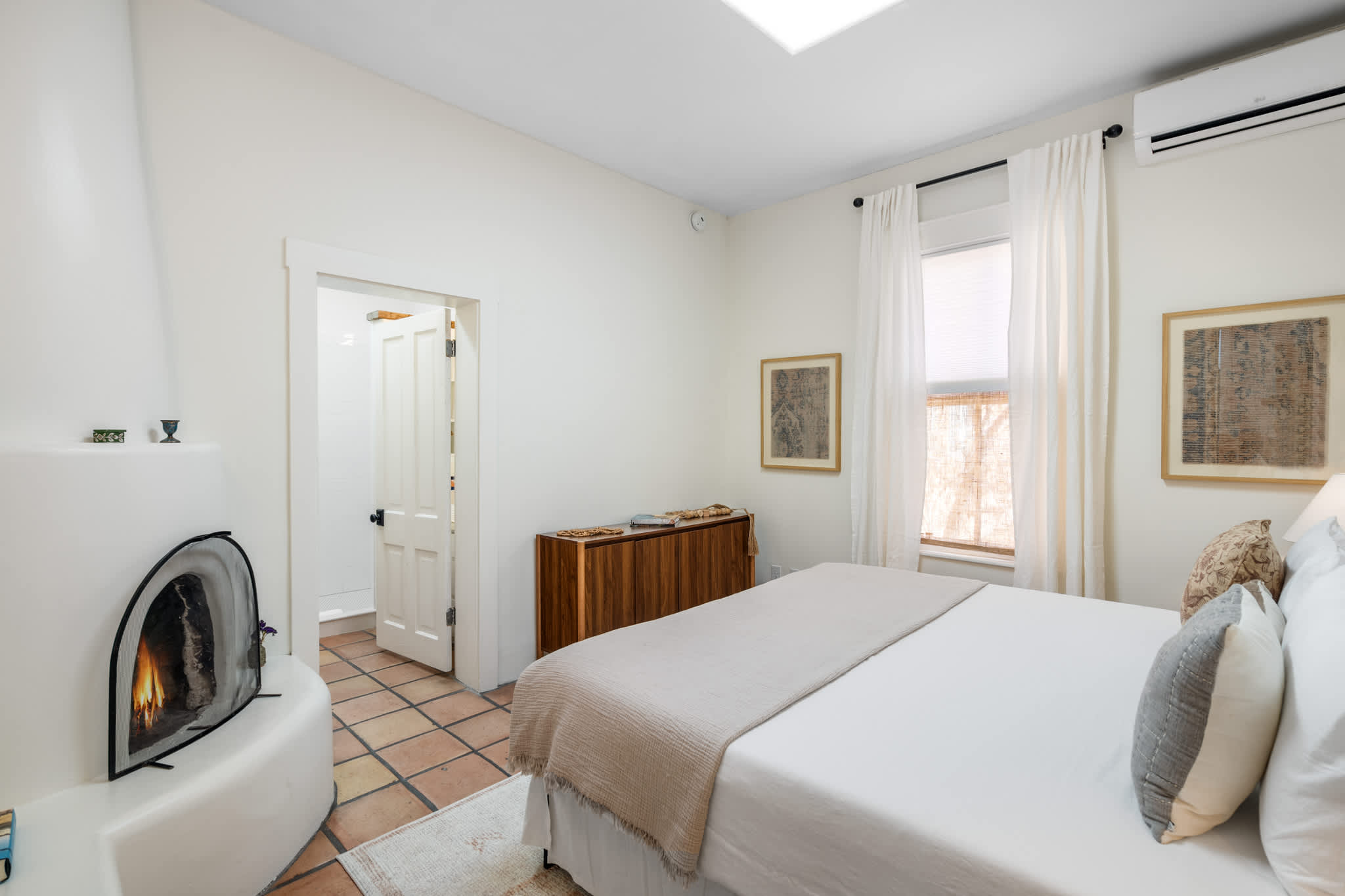 Private yet connected, the fourth bedroom is located in the attached casita. This special suite features a quaint wood burning Kiva fireplace, queen bed and comfy seating connected to a light filled bathroom.