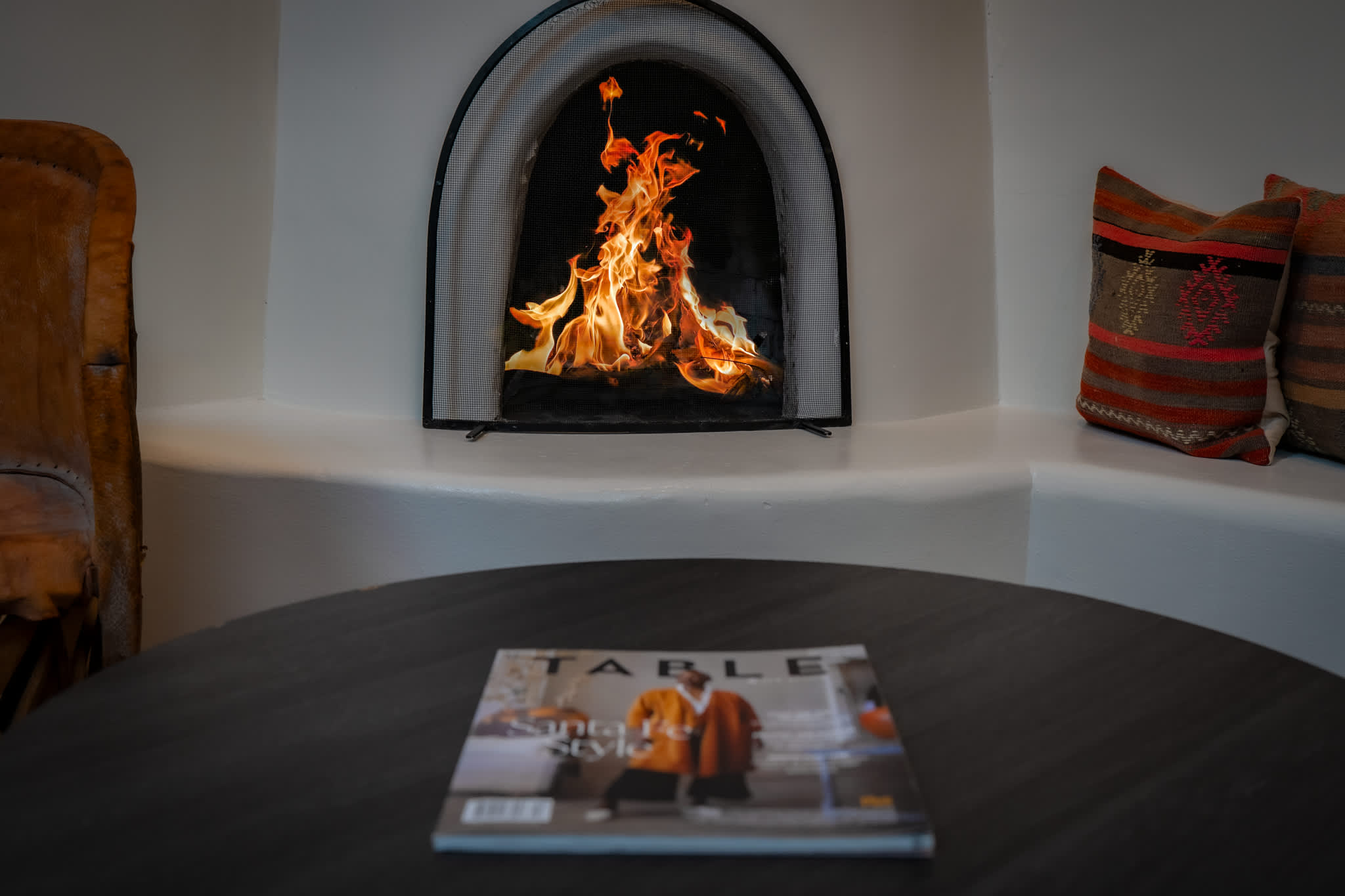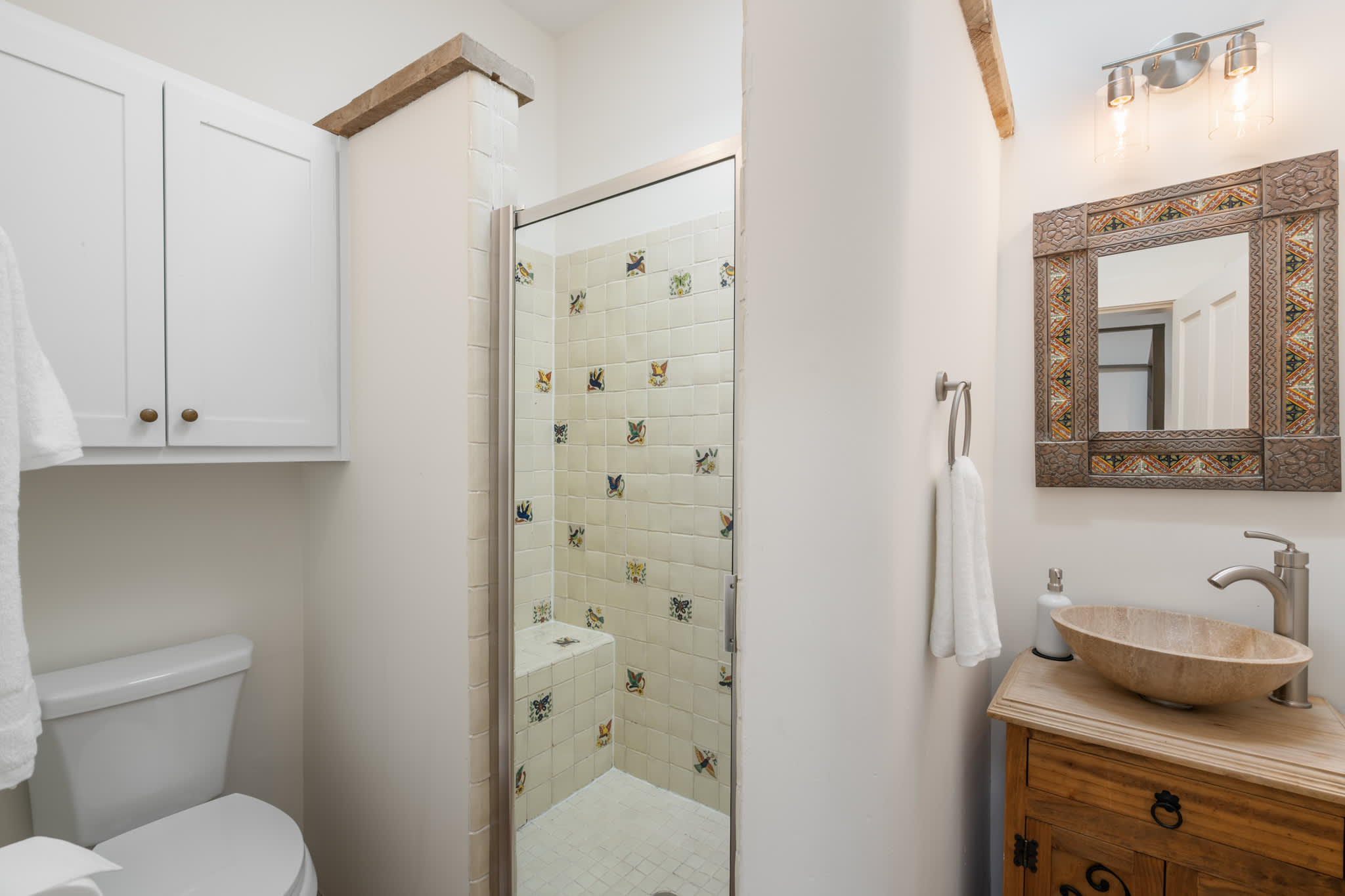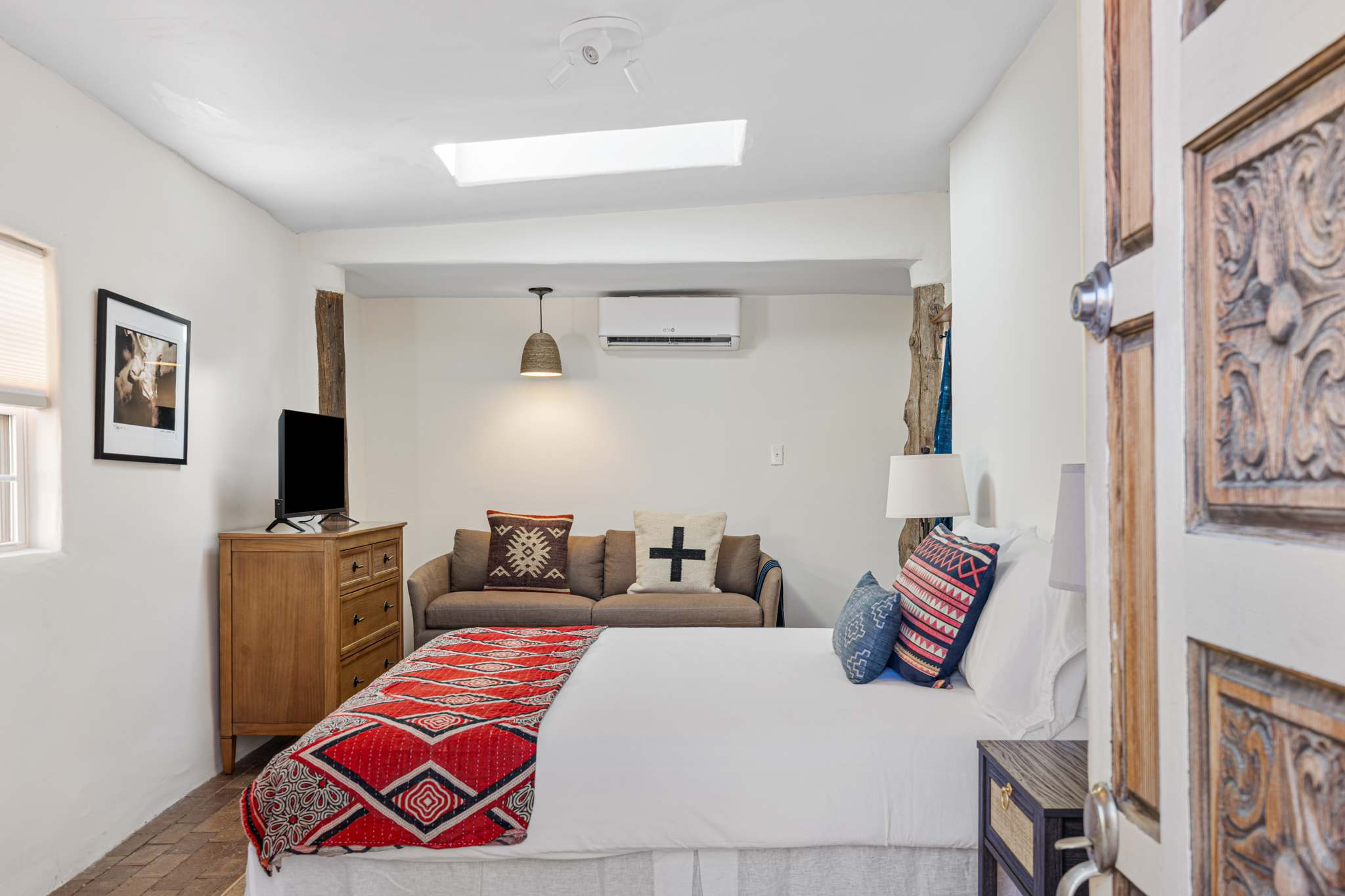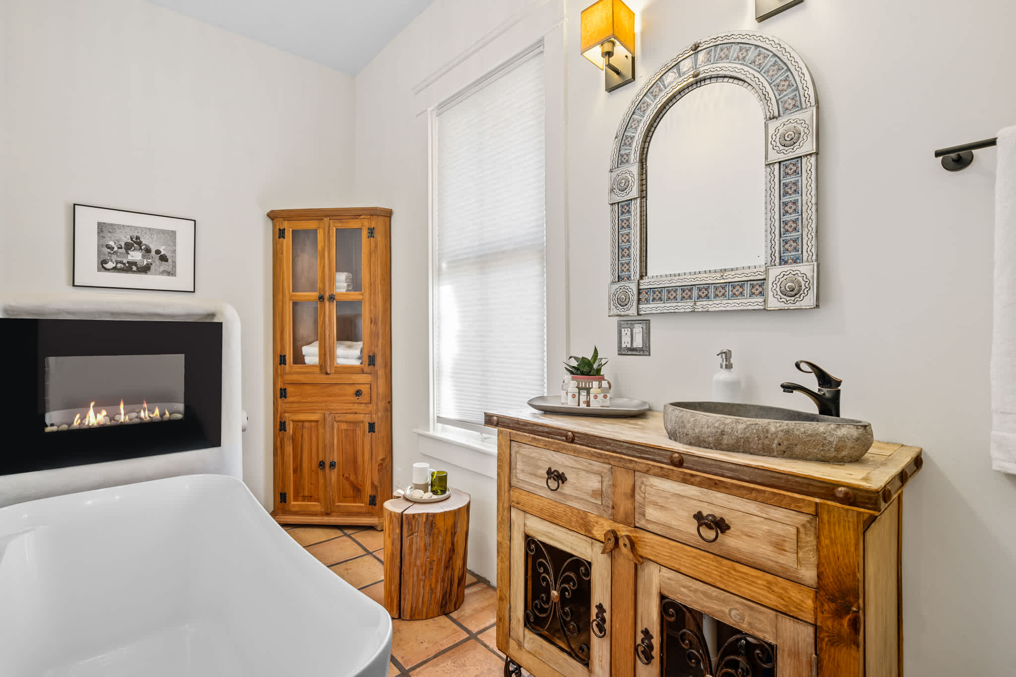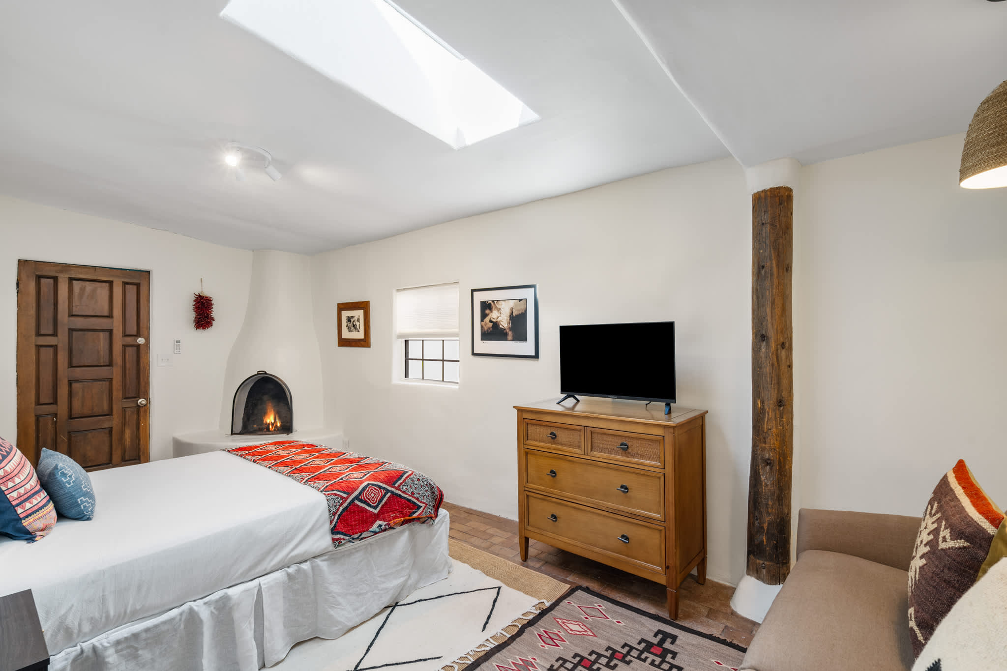 Private yet connected, the fourth bedroom is located in the attached casita. This special suite features a quaint wood burning Kiva fireplace, queen bed and comfy seating connected to a light filled bathroom.