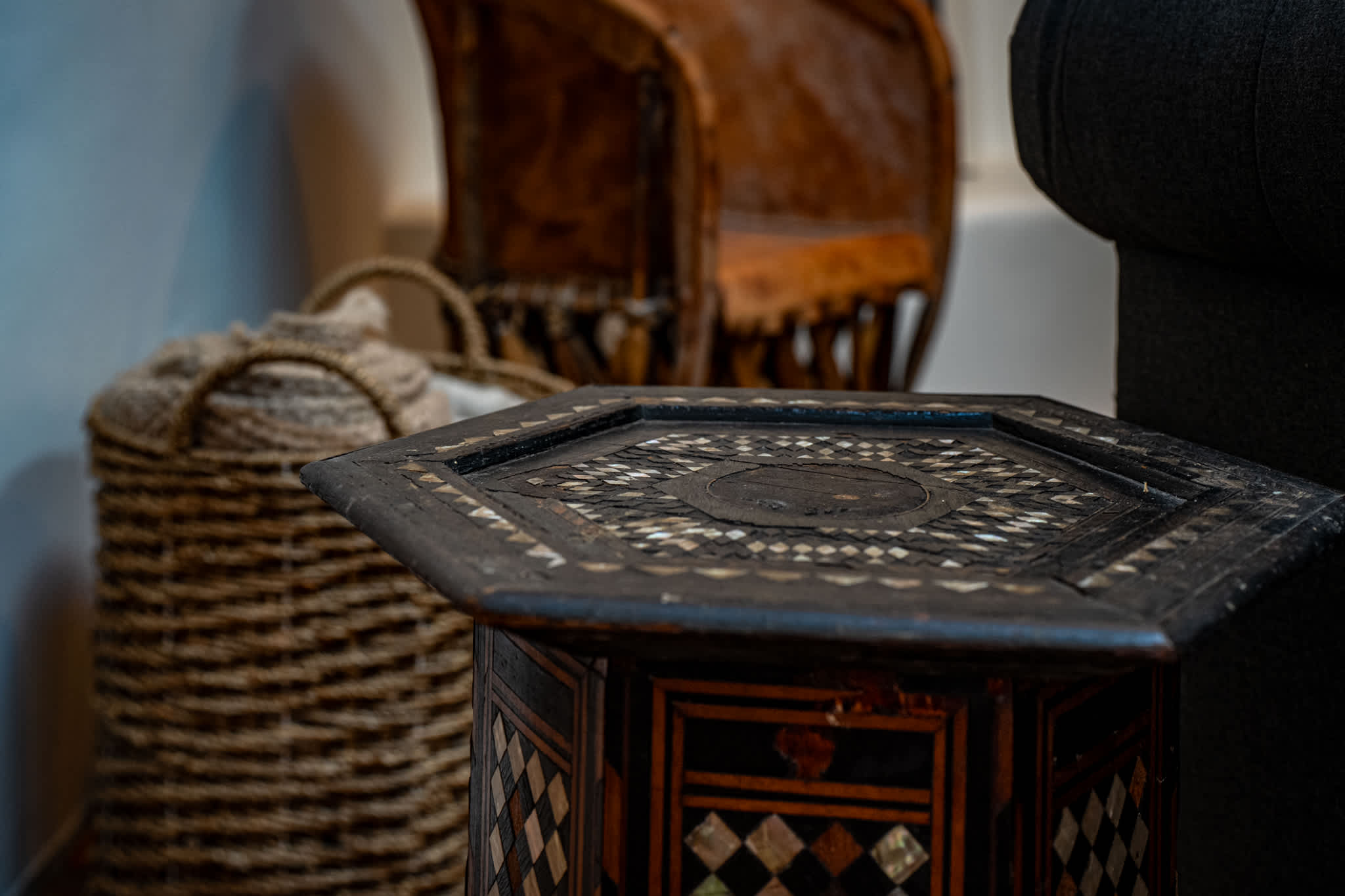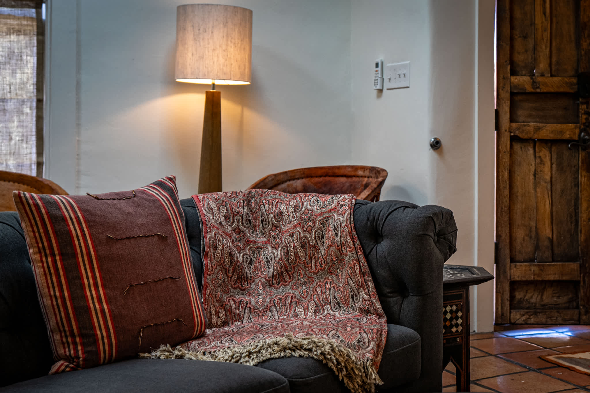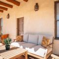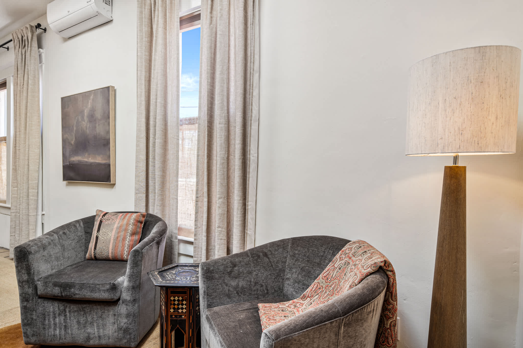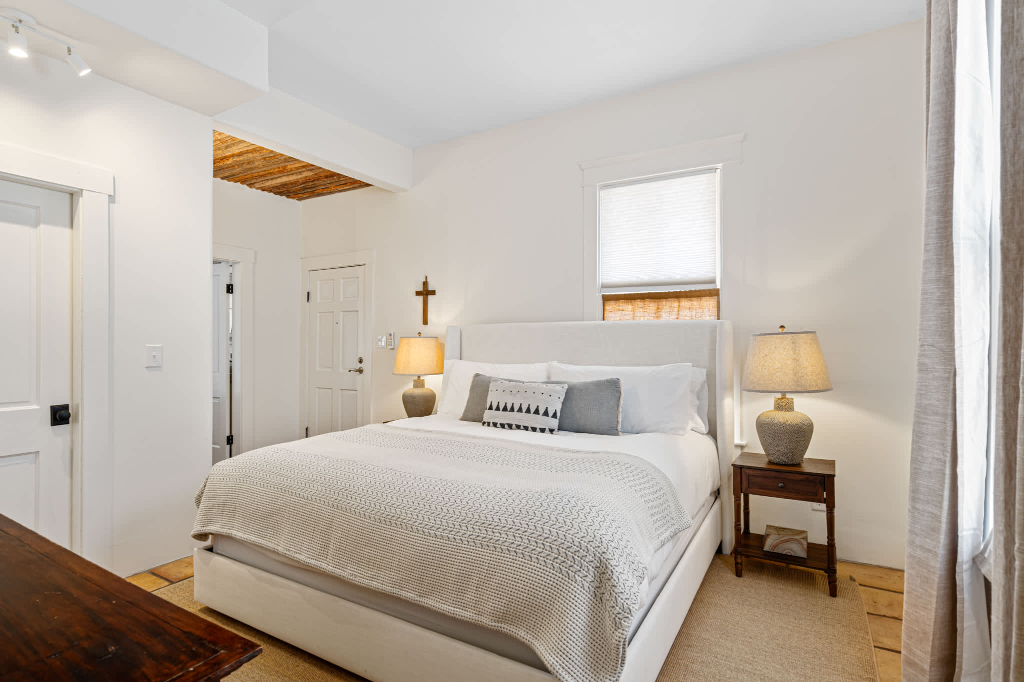 Private yet connected, the fourth bedroom is located in the attached casita. This special suite features a quaint wood burning Kiva fireplace, queen bed and comfy seating connected to a light filled bathroom.