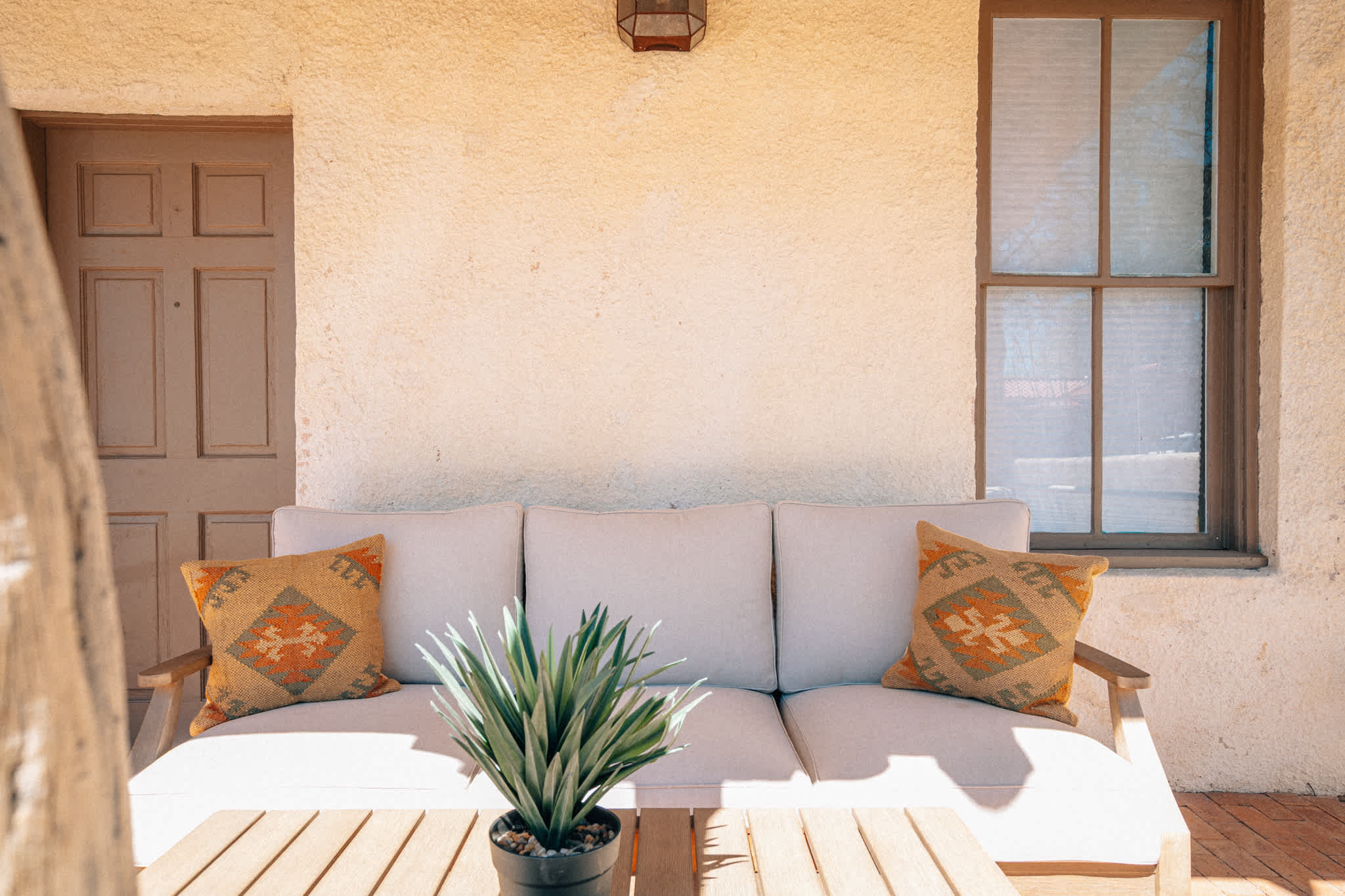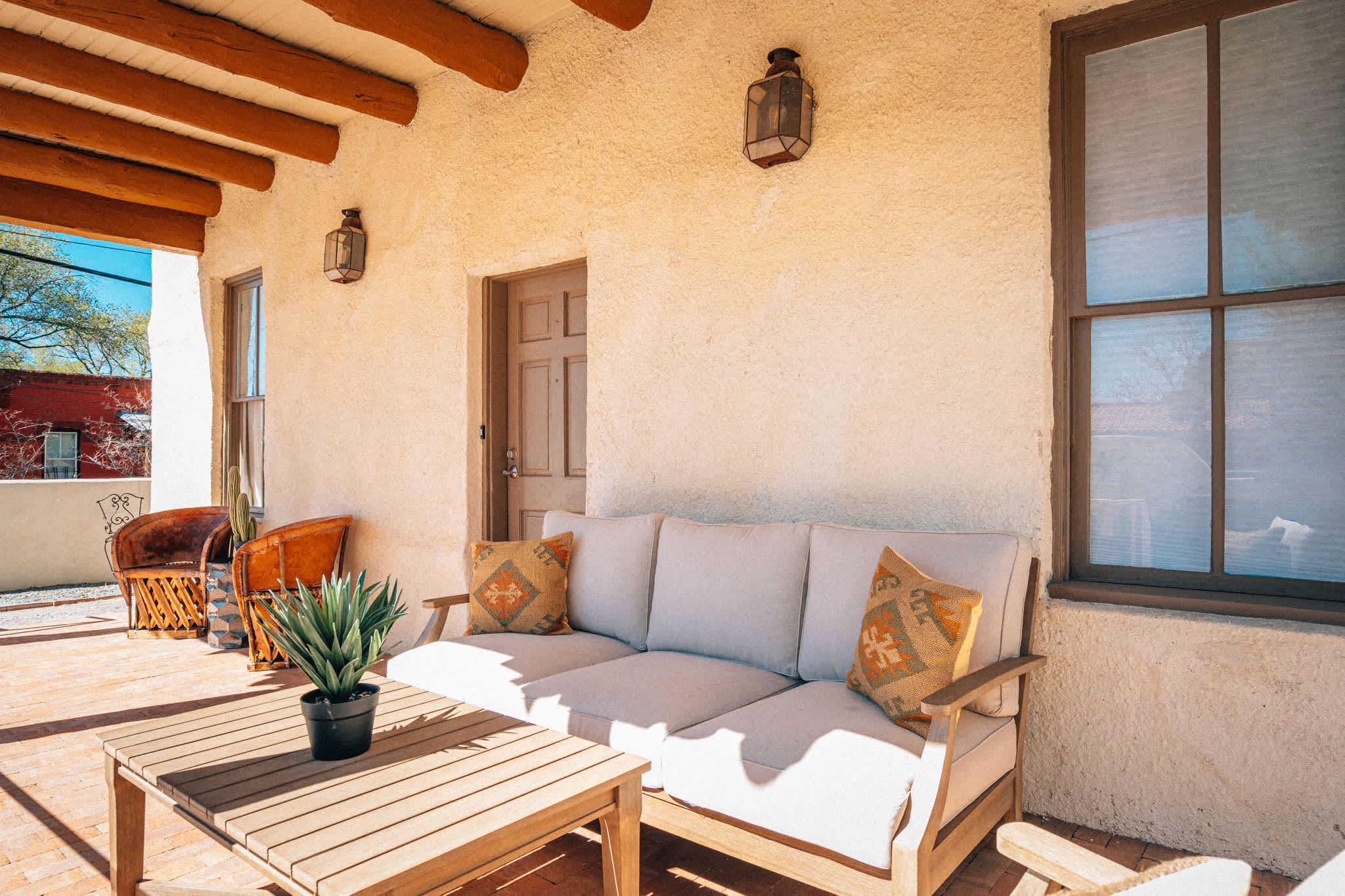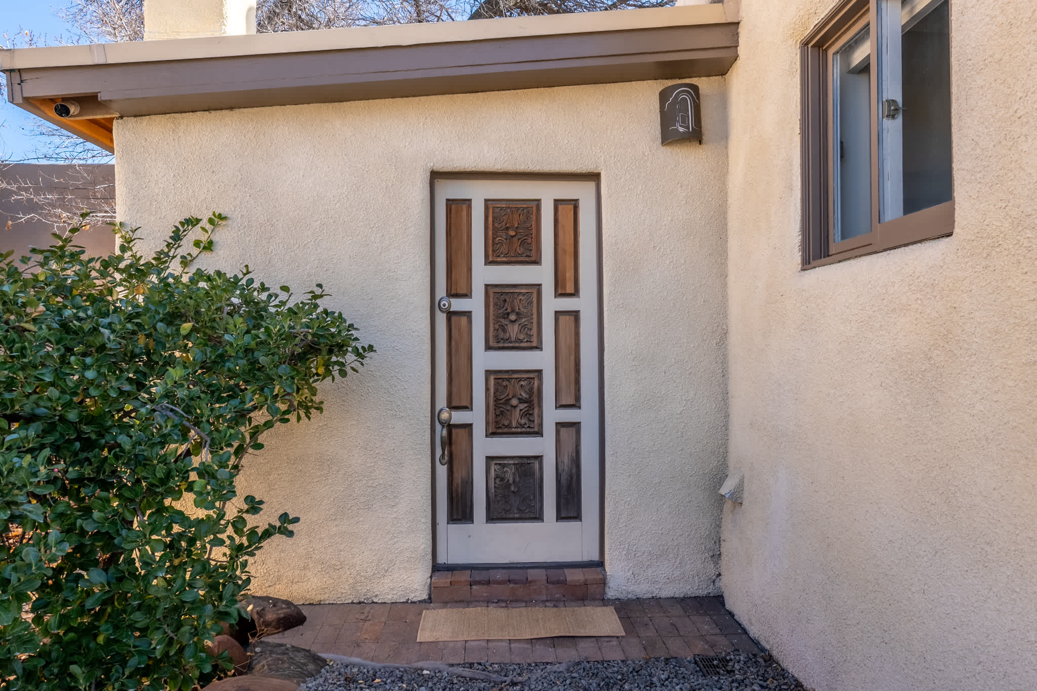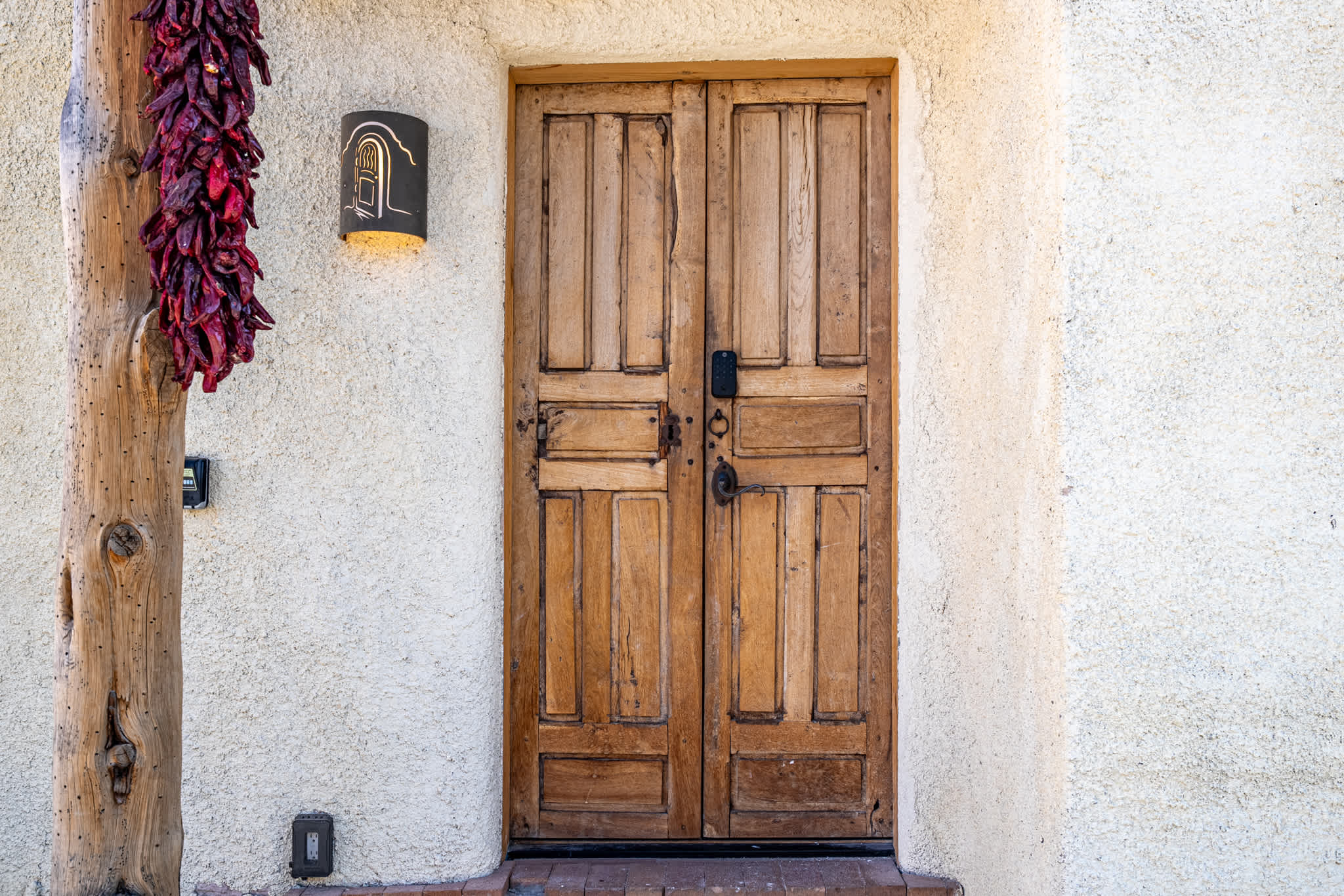 Step outside to enjoy the home’s classic Santa Fe exterior and a simple, private outdoor setting. The covered front portal offers a shaded spot to sip coffee in the morning or watch the sunset, while off-street parking makes coming and going easy. The outdoor areas are quiet and low-key with ample off street parking for guests who want a convenient place to land between explorations of Santa Fe.