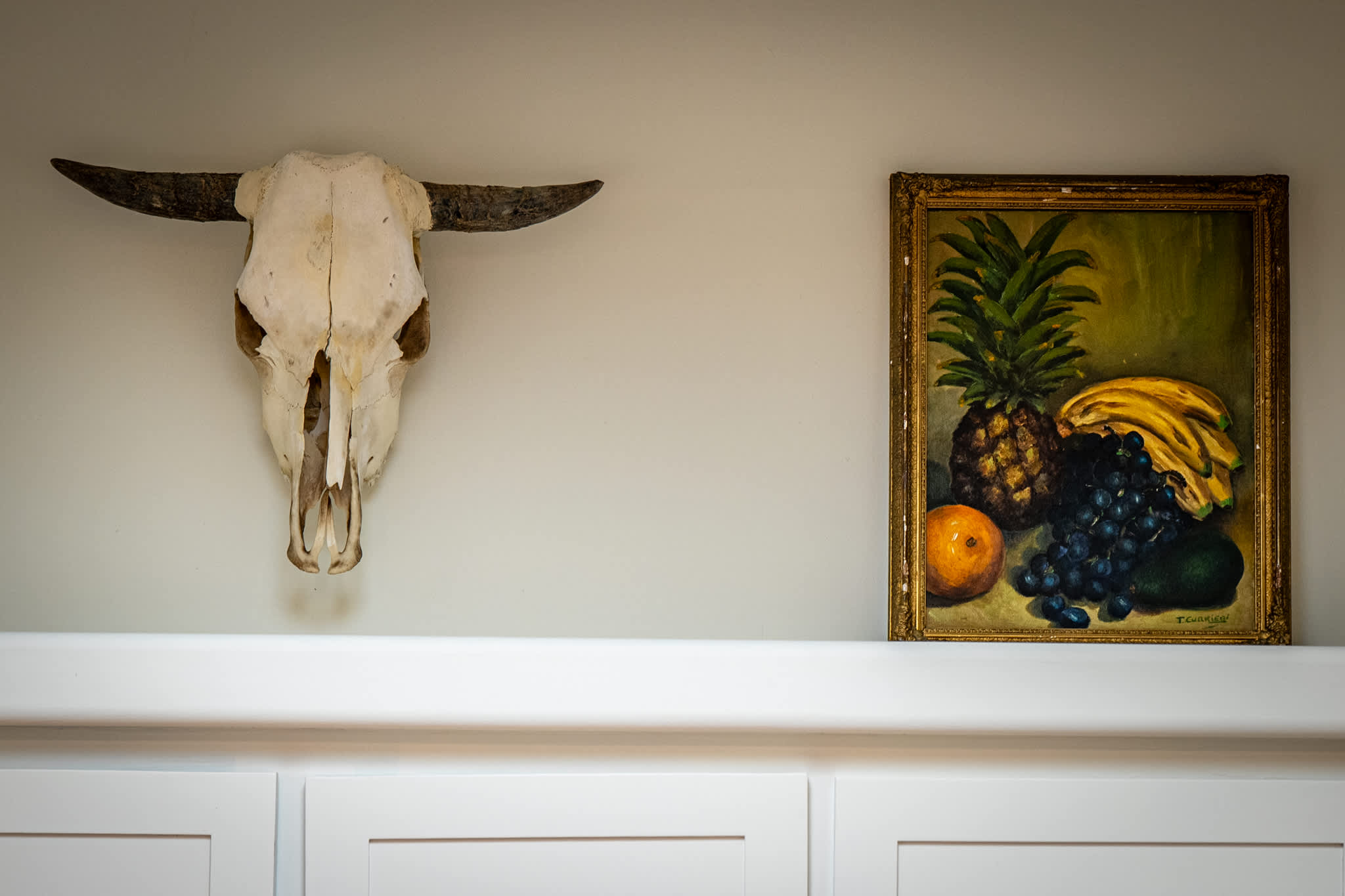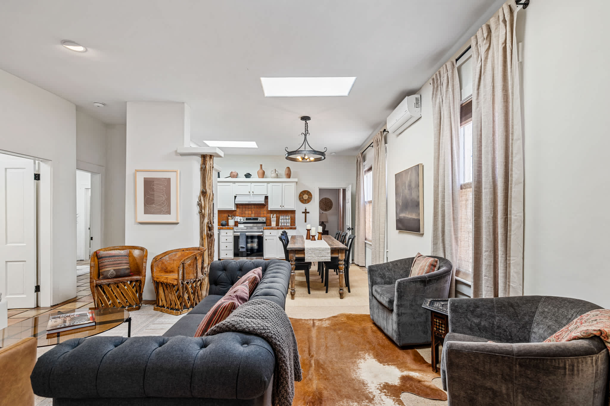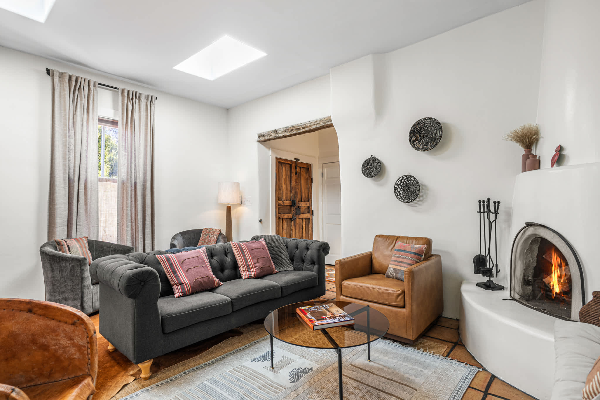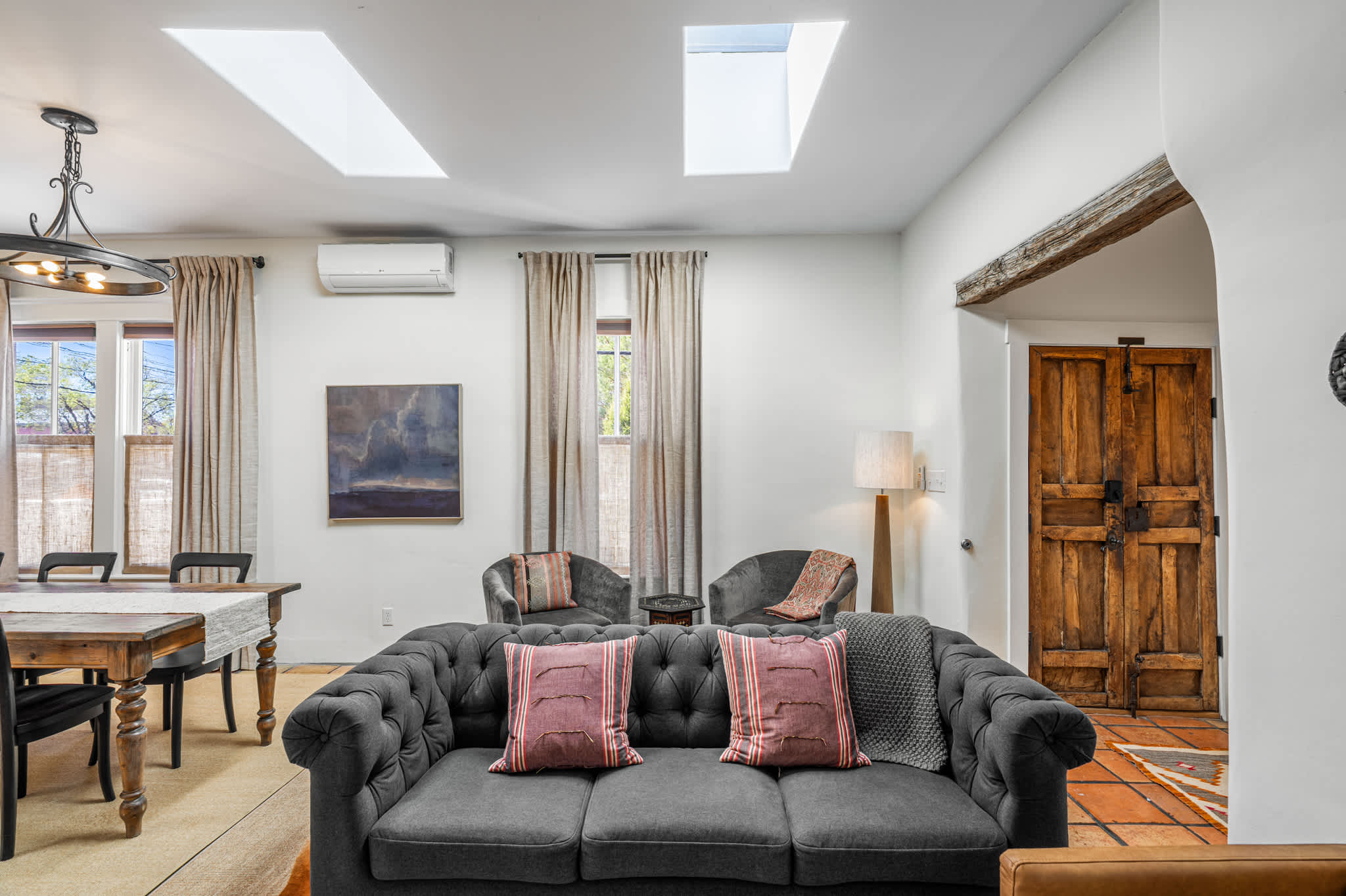 The open living room is light-filled and inviting anchored by a traditional wood burning Kiva fireplace, clean white plaster walls, warm saltillo tile, large historic windows and multiple skylights that bring in beautiful natural light all day. A plush sofa and comfortable leather lounge chairs are arranged for easy conversation or movie nights, and the space flows seamlessly into the dining and kitchen areas. Mini-split A/C and heat keep things comfortable year-round.