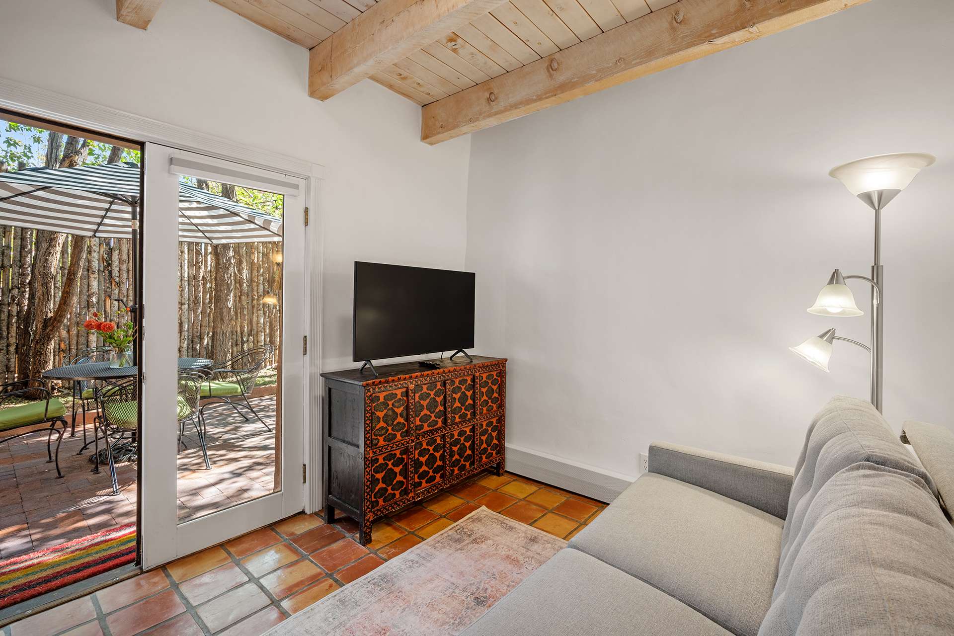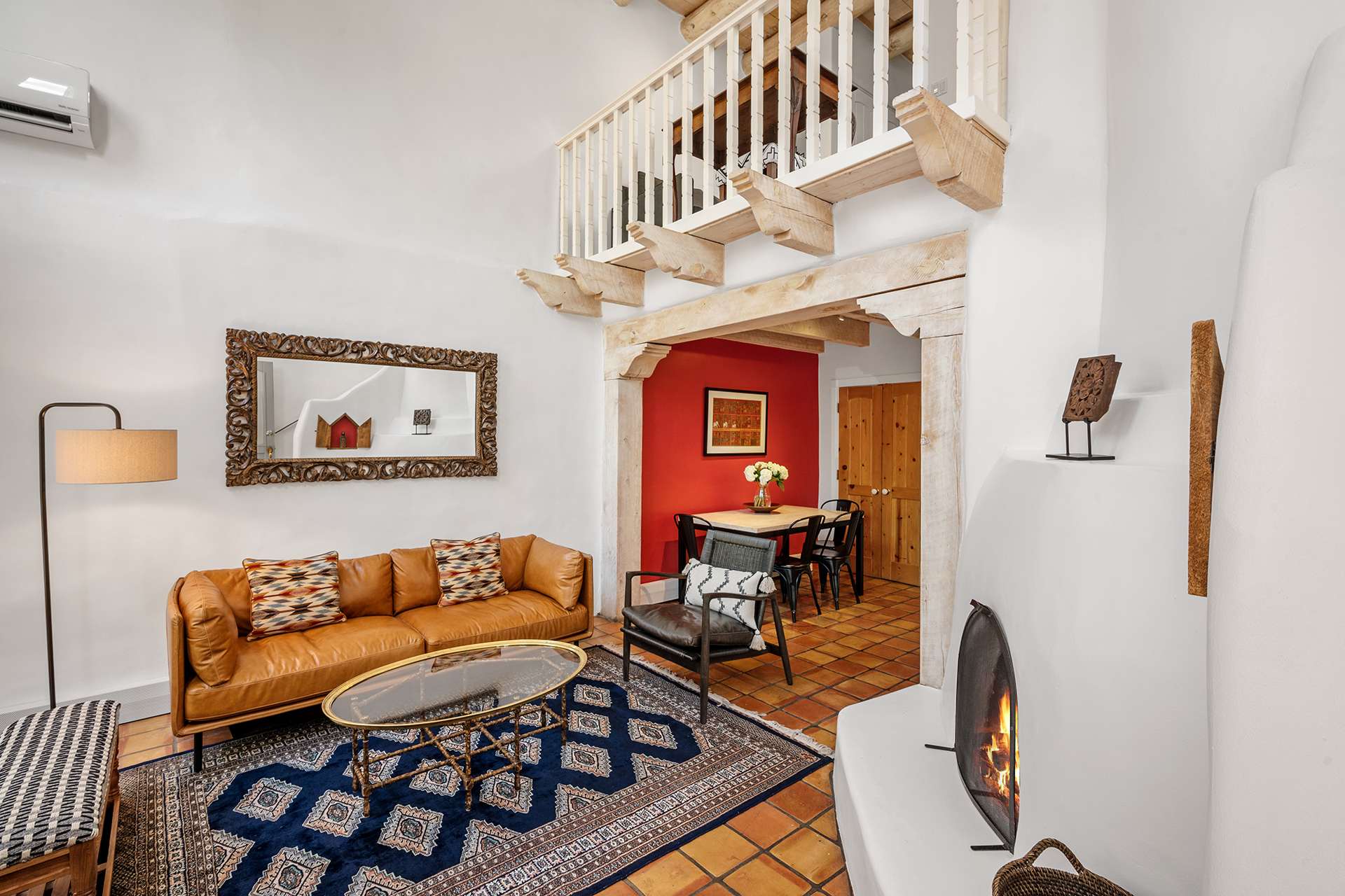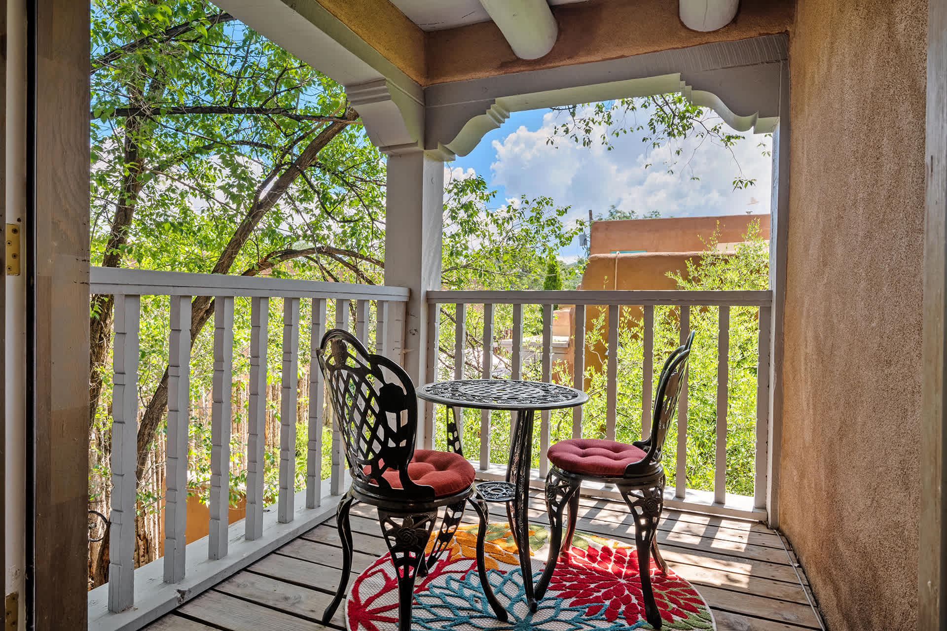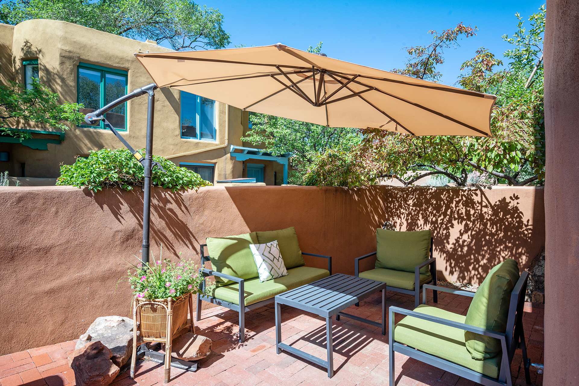 The downstairs patio has a dining space, a lounge space, and a gas grill that will allow you to spend hours enjoying Santa Fe’s famous weather.
