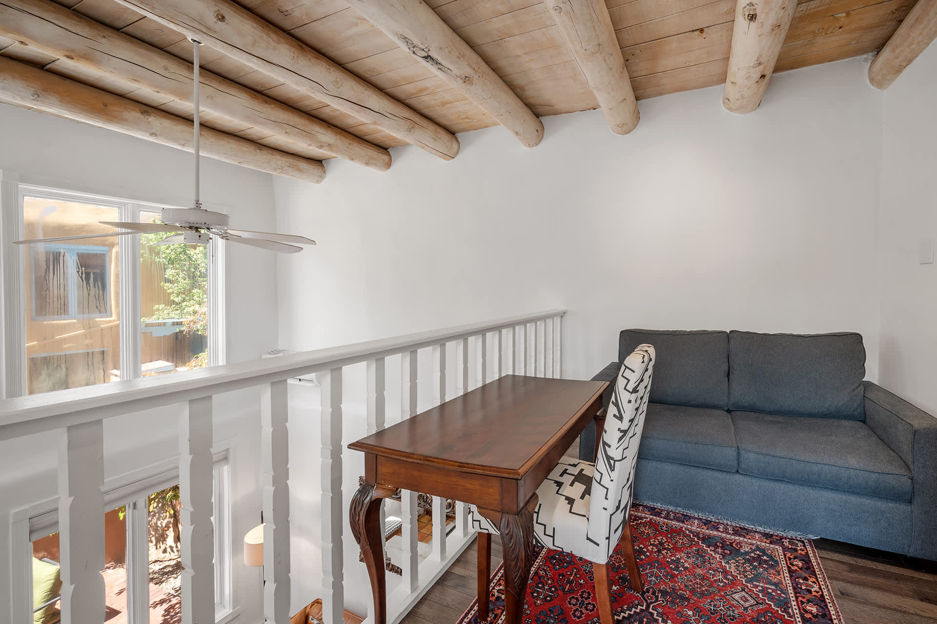 The comfortable living room furnishings face the TV on one side, and a large and romantic kiva fireplace on the other. The den is located between the kitchen and patio, and features a sleeper sofa for an additional guest. An indoor balcony hosts a home office with a view of the living space.