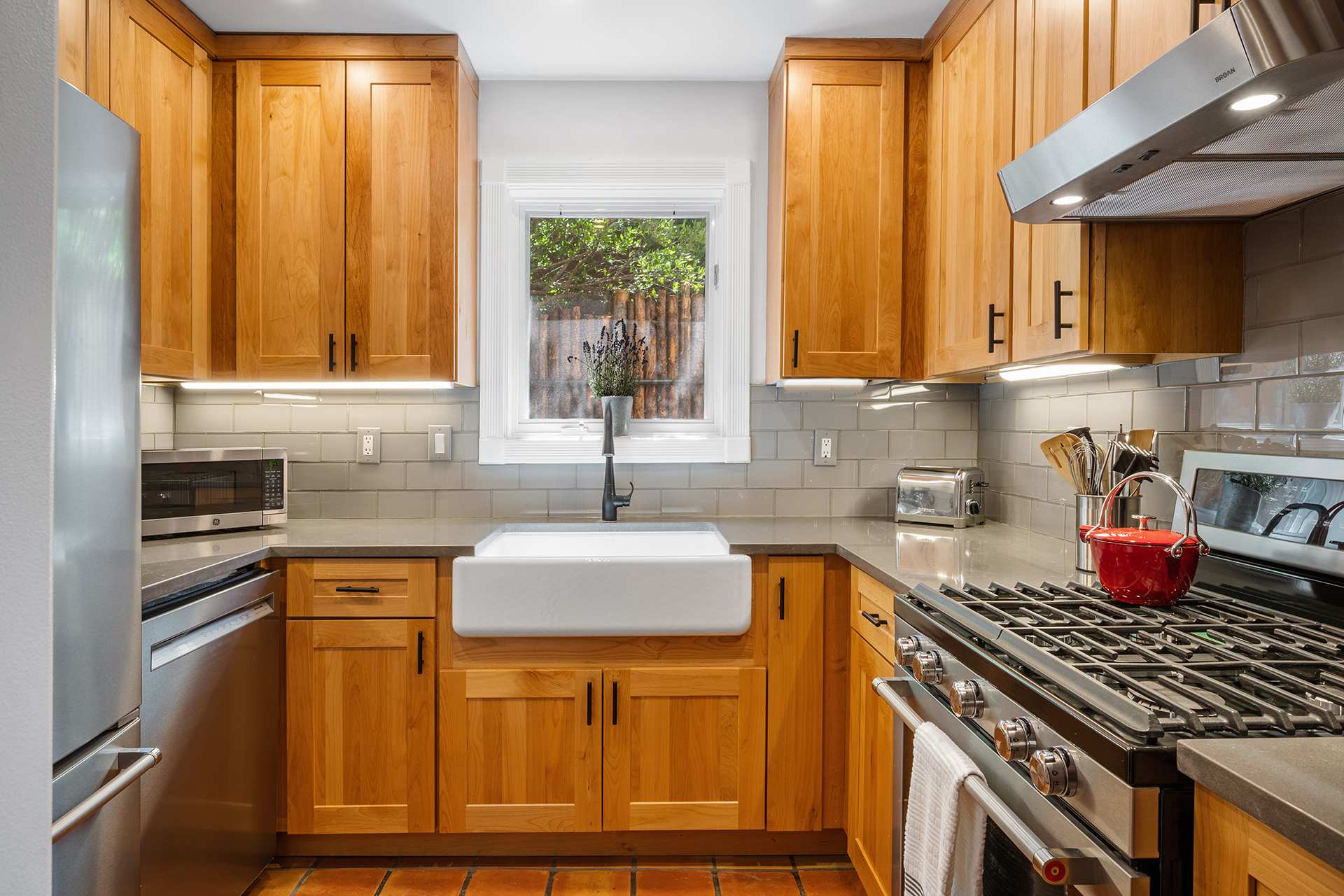 The kitchen is equipped with luxury stainless steel appliances, a large farmhouse sink, sleek modern countertops, and under-cabinet lighting.