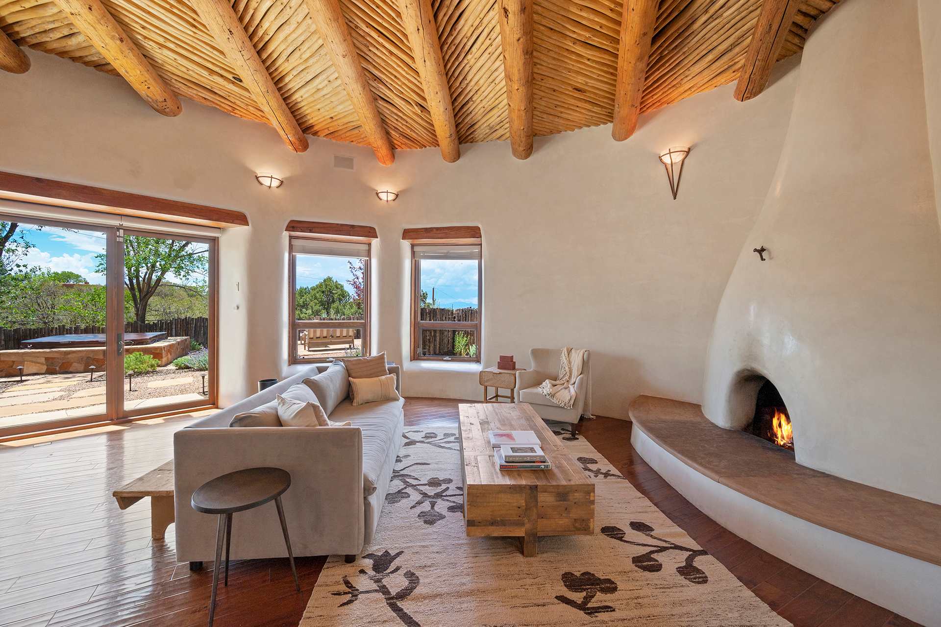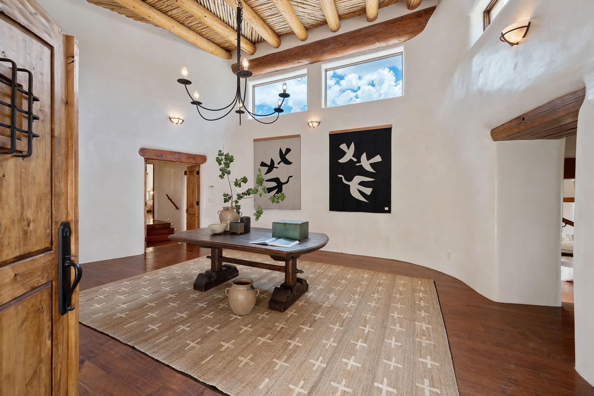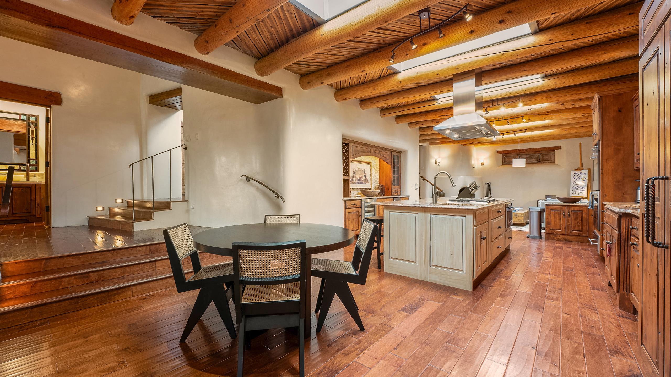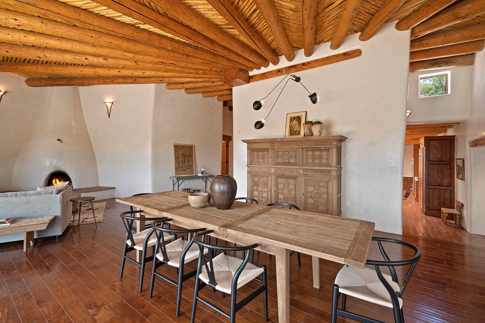 The stunning living room is centered around the large kiva fireplace, and features tall windows and glass French doors that pour abundant natural light onto the gorgeous diamond plaster walls and classic, comfortable furniture. The gorgeous fanned Vigas lead your eye straight to the stunning views of the New Mexico landscape, which you can also take in from the patio just outside.