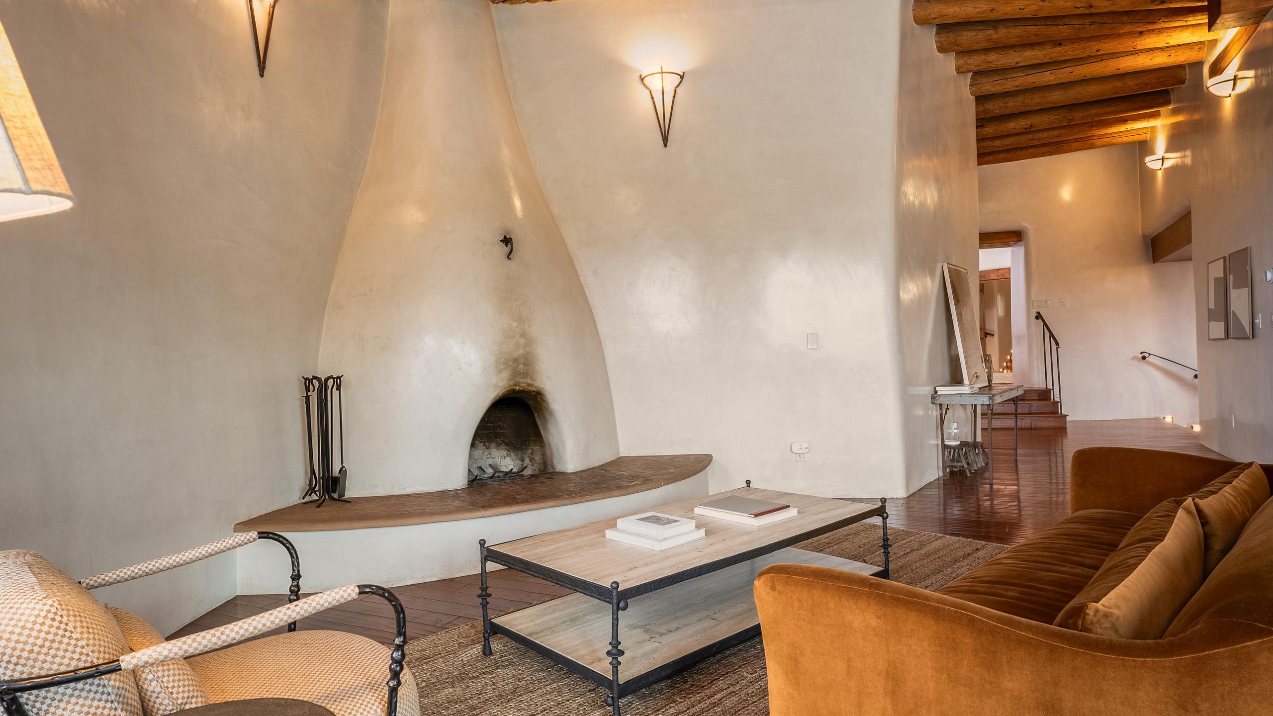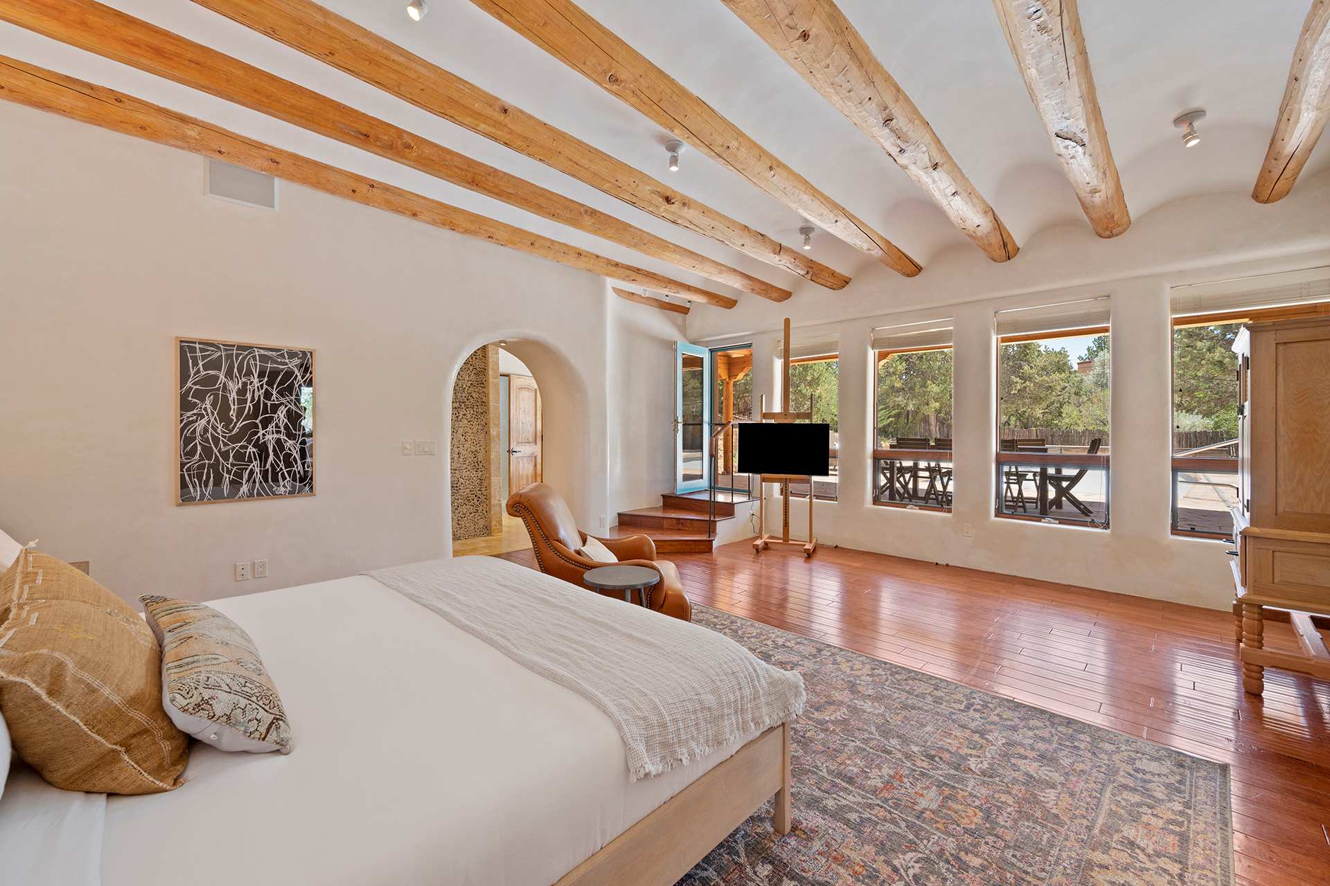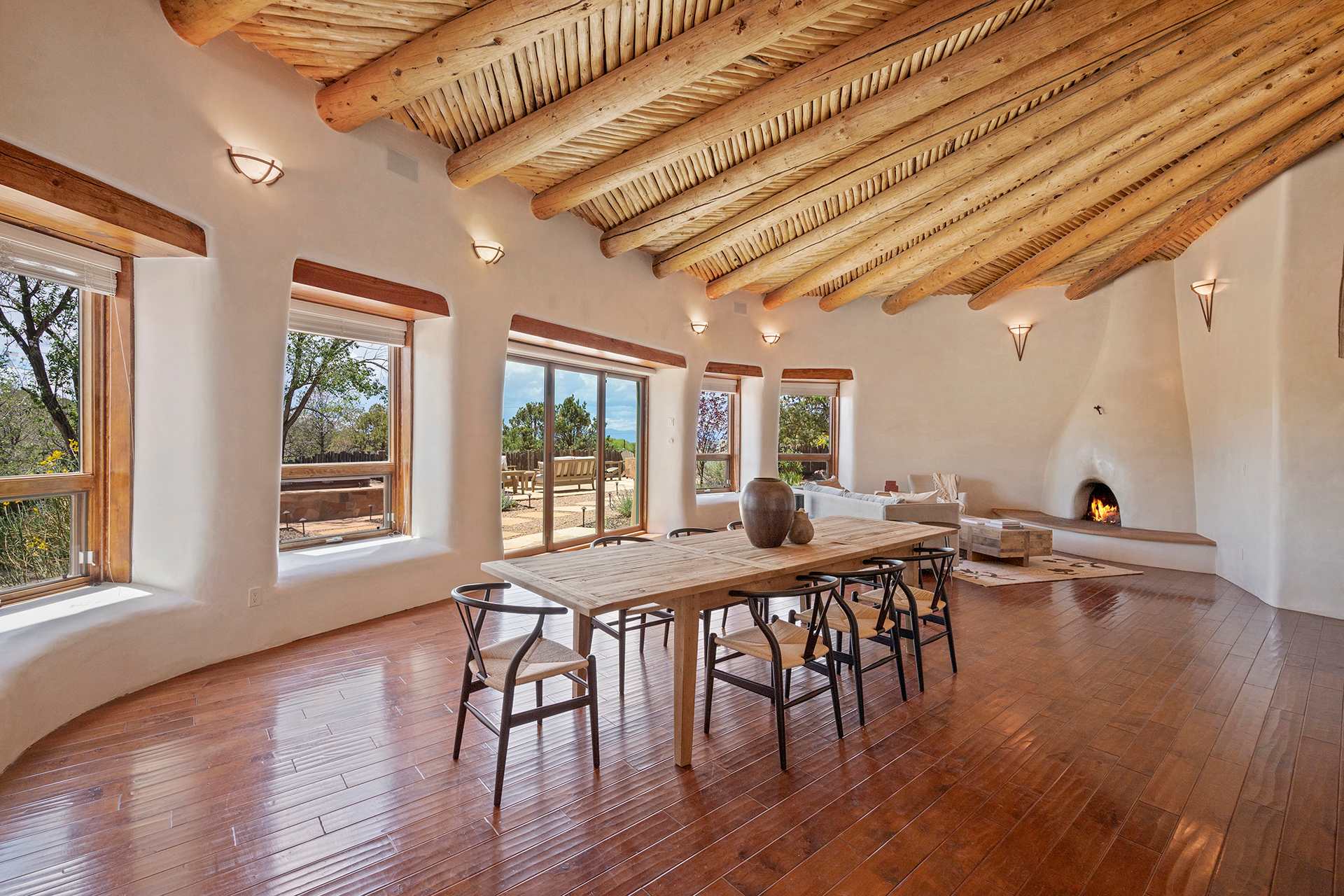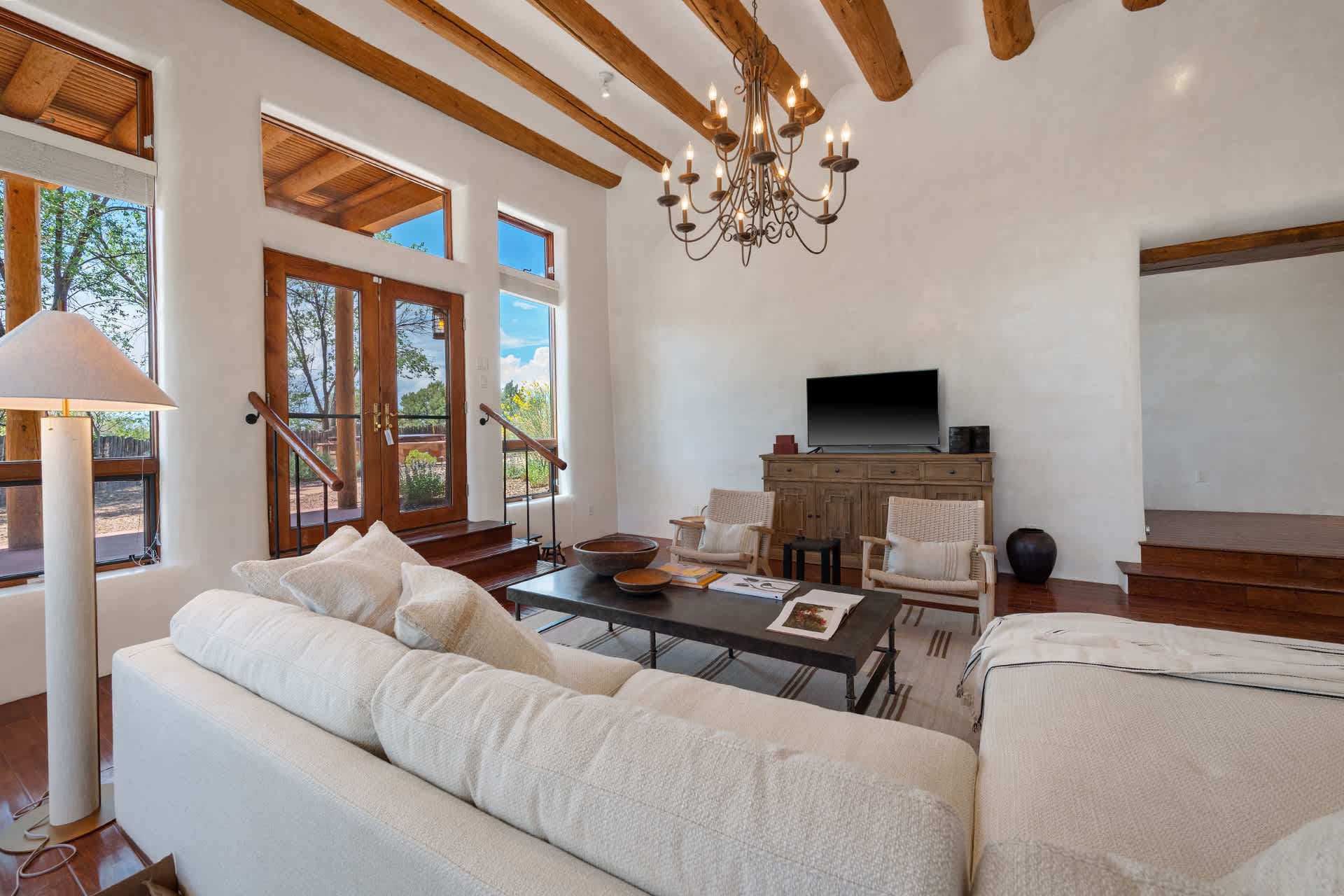 The stunning living room is centered around the large kiva fireplace, and features tall windows and glass French doors that pour abundant natural light onto the gorgeous diamond plaster walls and classic, comfortable furniture. The gorgeous fanned Vigas lead your eye straight to the stunning views of the New Mexico landscape, which you can also take in from the patio just outside.