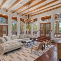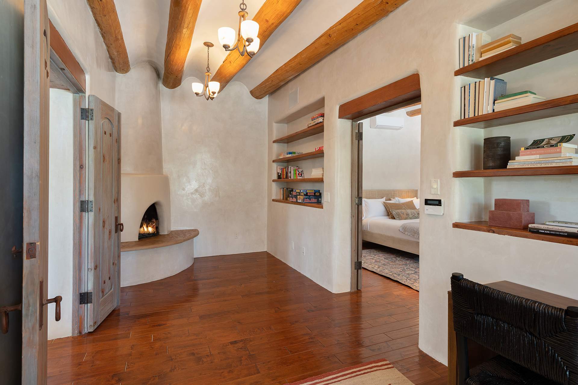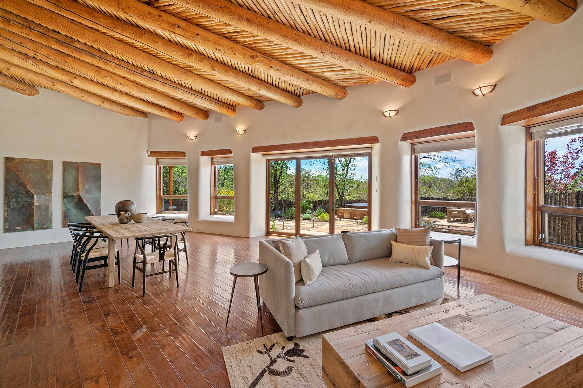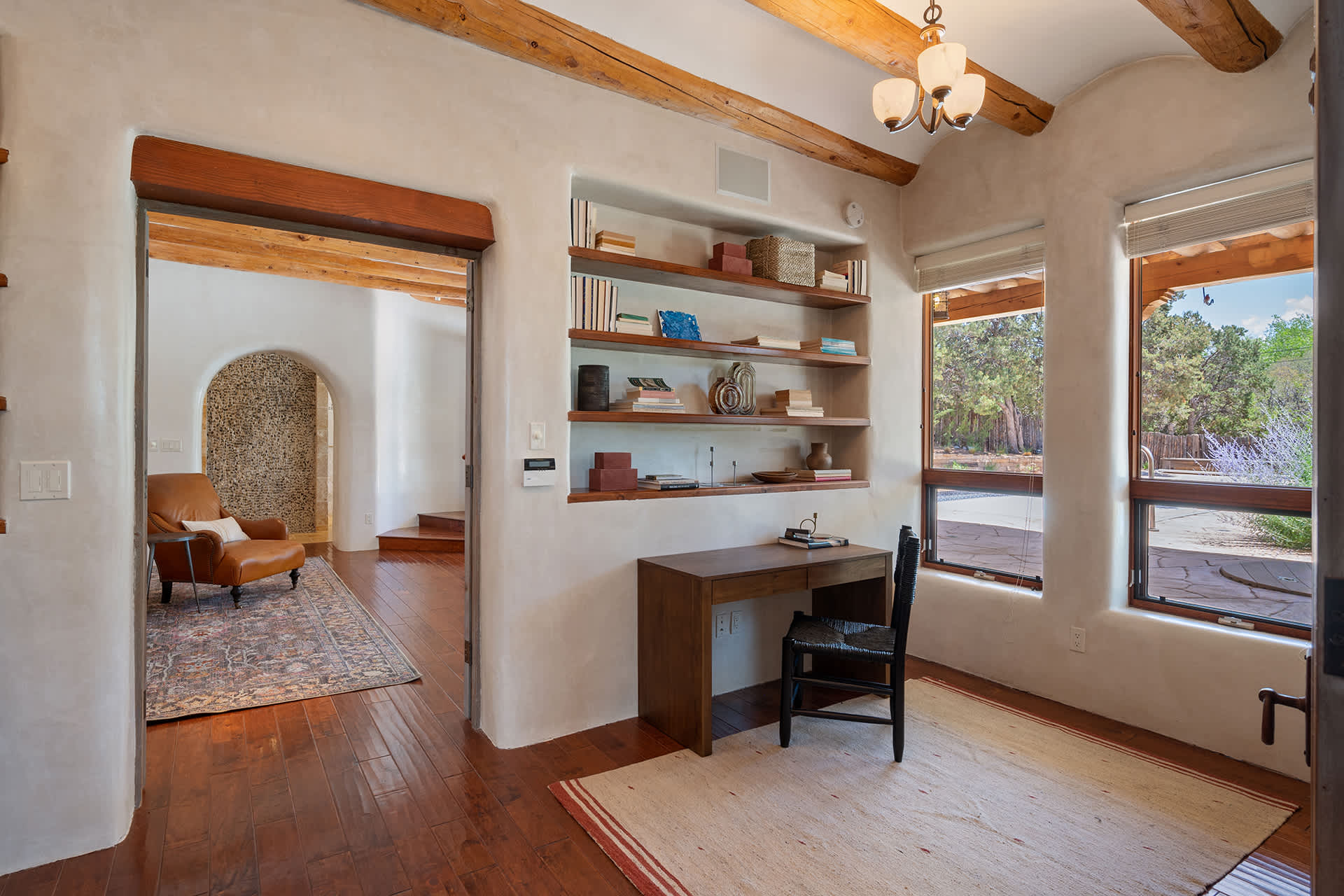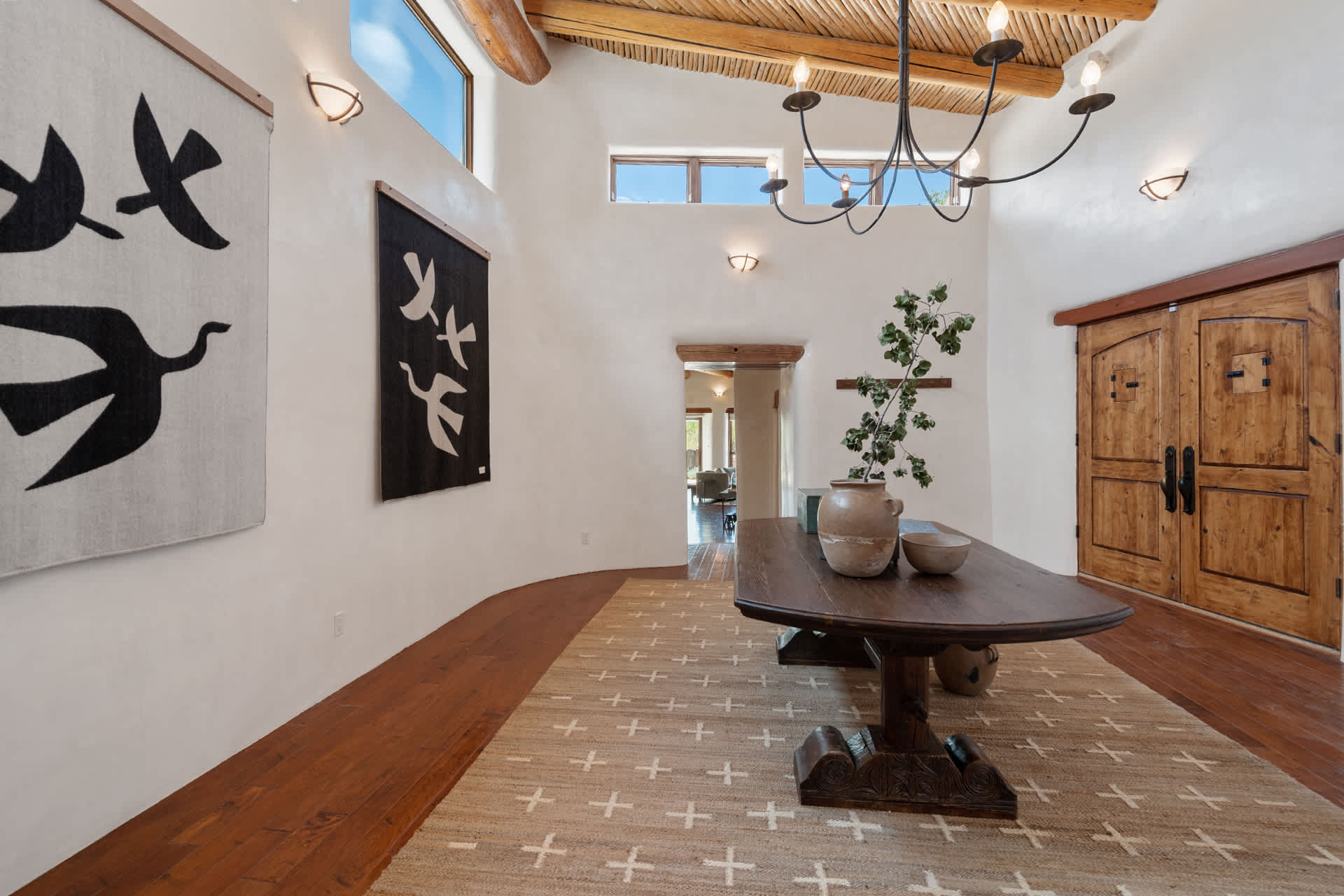 The stunning living room is centered around the large kiva fireplace, and features tall windows and glass French doors that pour abundant natural light onto the gorgeous diamond plaster walls and classic, comfortable furniture. The gorgeous fanned Vigas lead your eye straight to the stunning views of the New Mexico landscape, which you can also take in from the patio just outside.