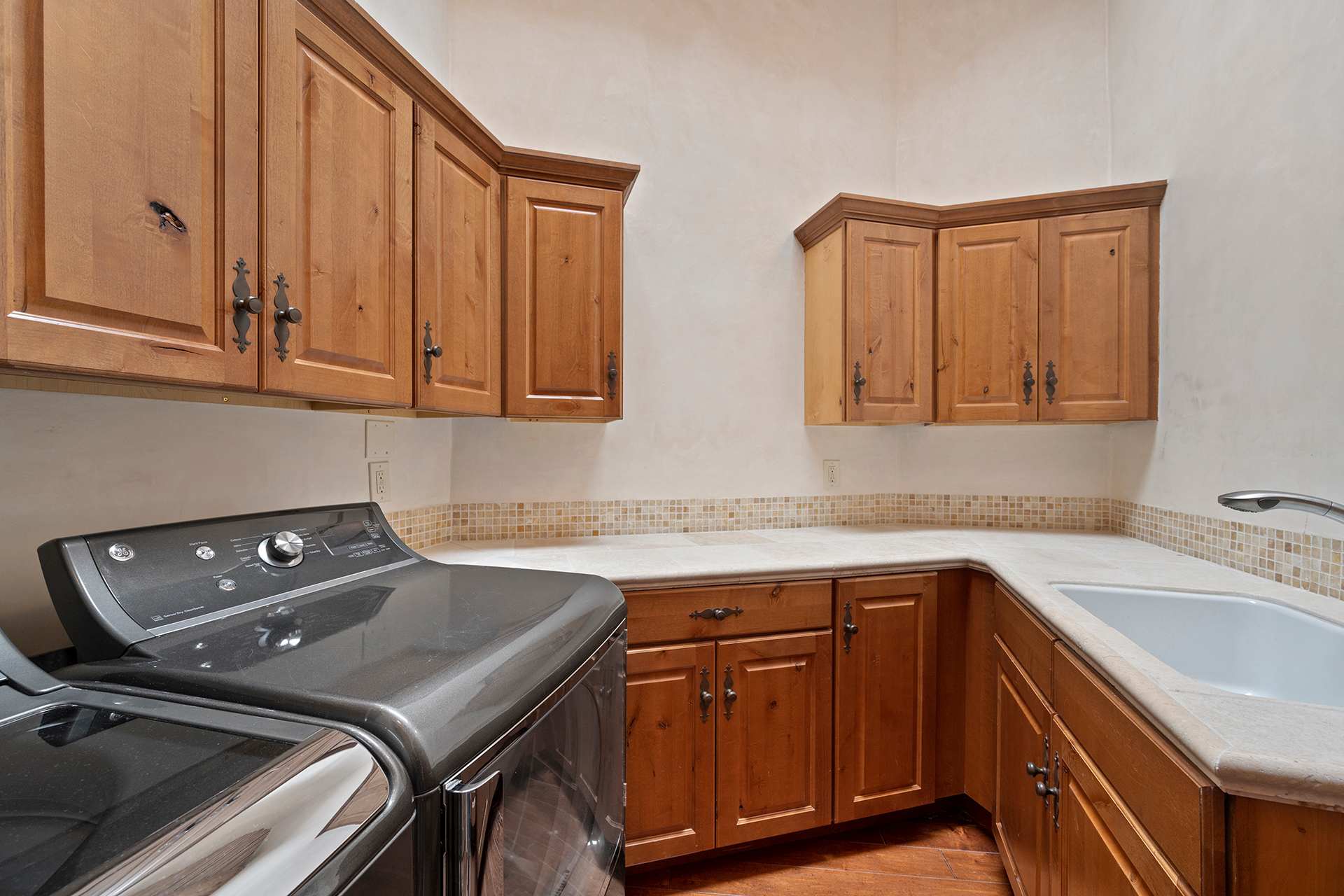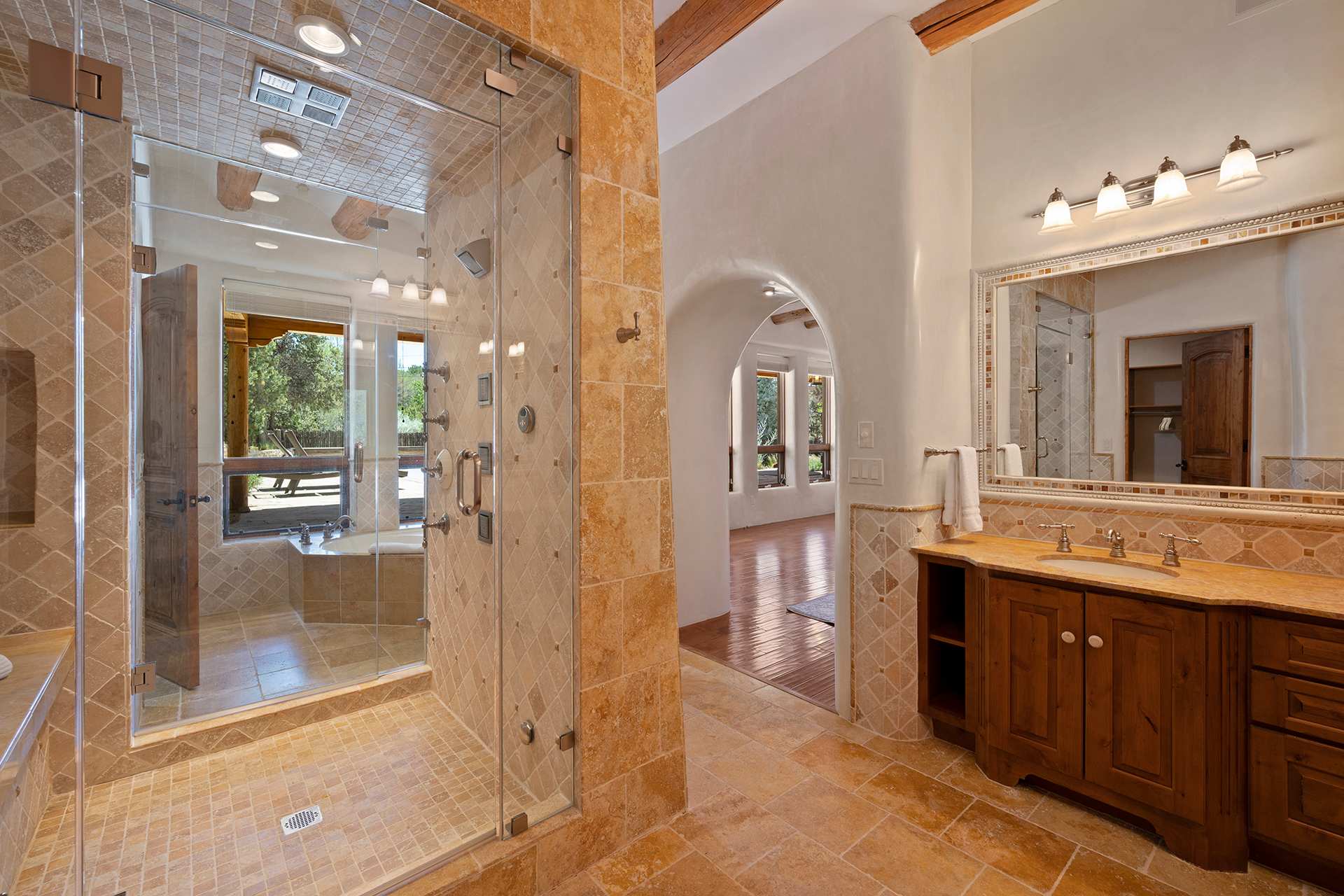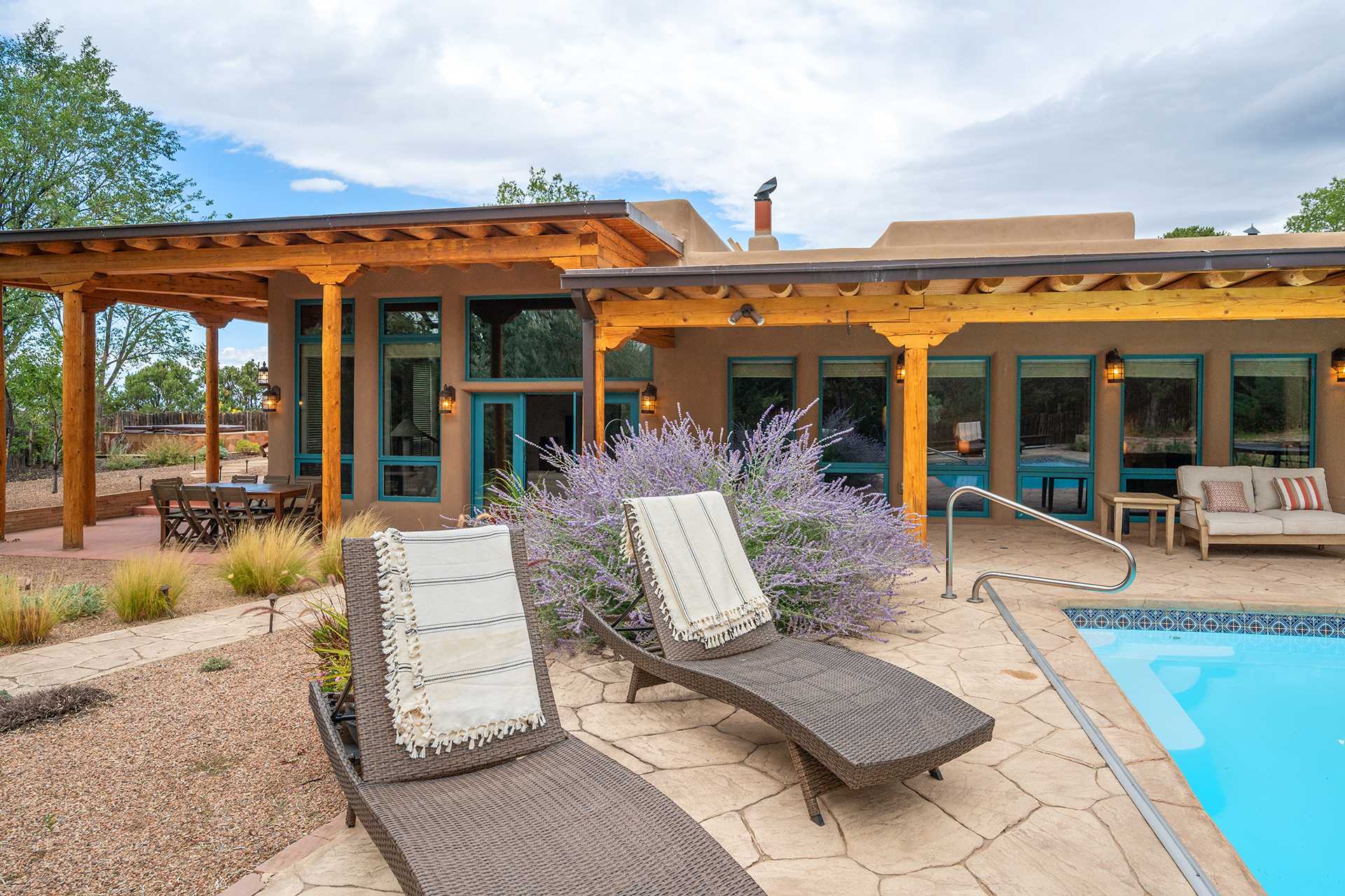 The stunning interior is rivaled only by the gorgeous outdoor space. The heated pool and hot tub will perfectly complement Santa Fe’s mild and sunny weather. There is ample room to cook on the BBQ, eat a family meal, sunbathe, and take in New Mexico’s mountainous landscape.
