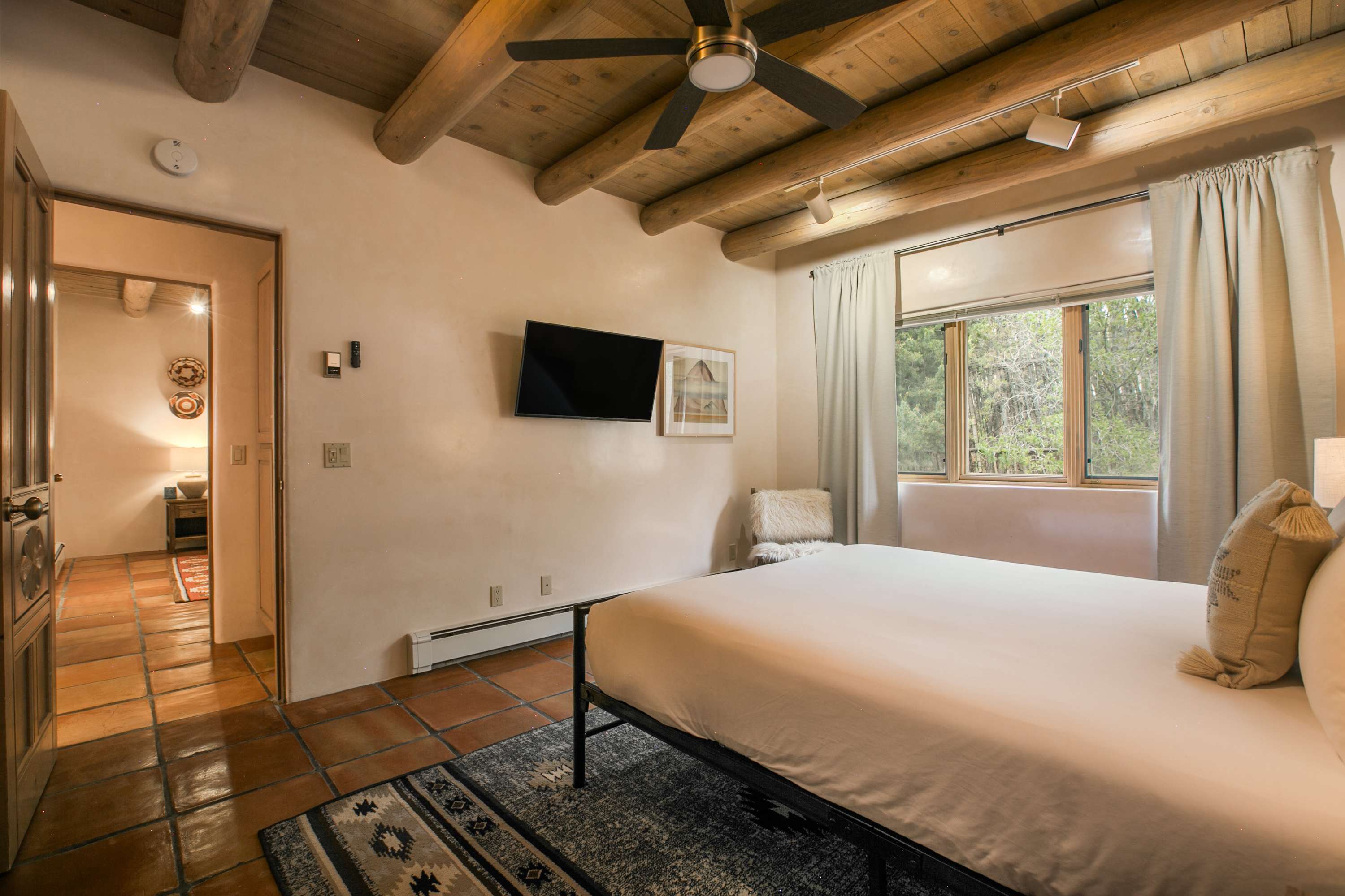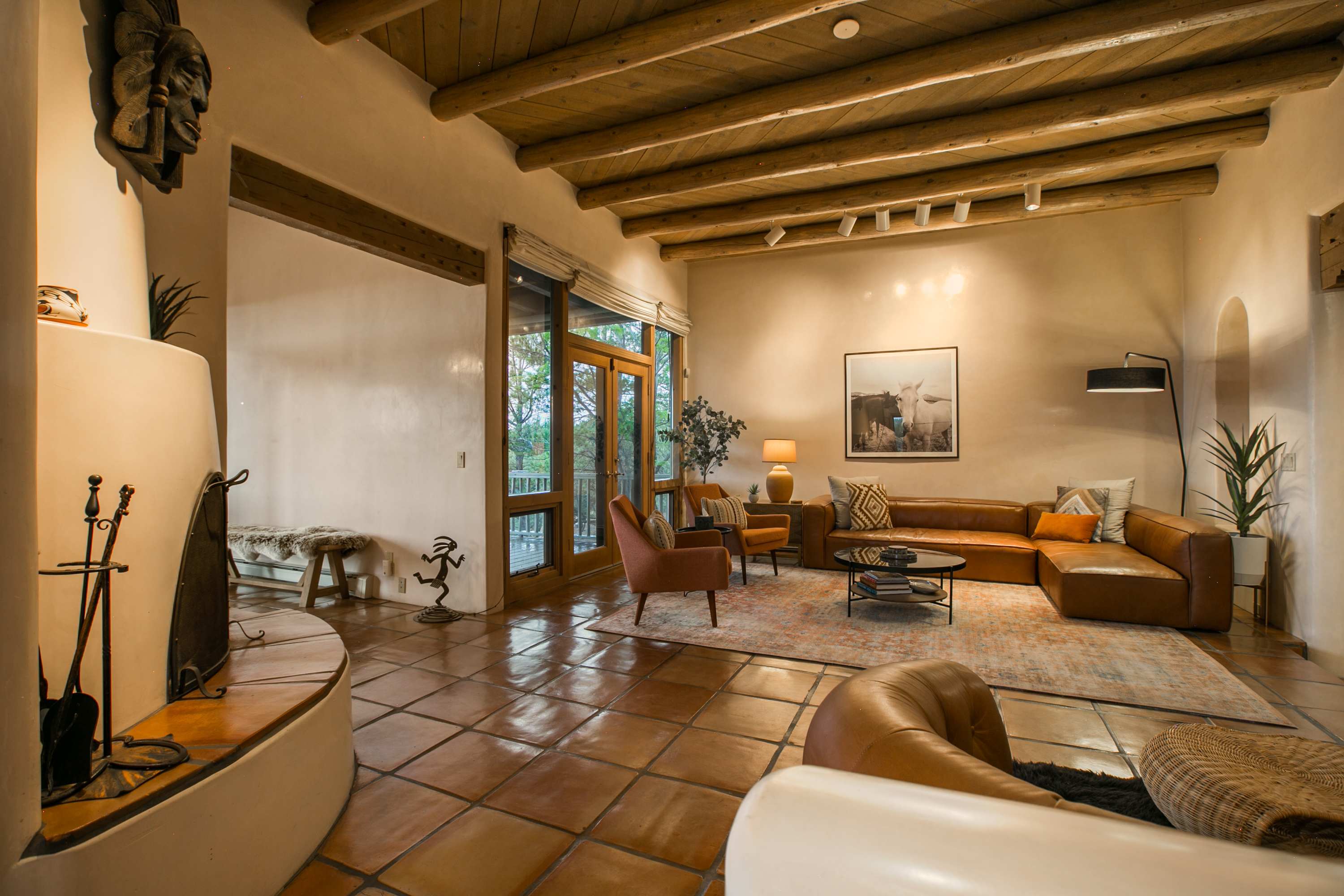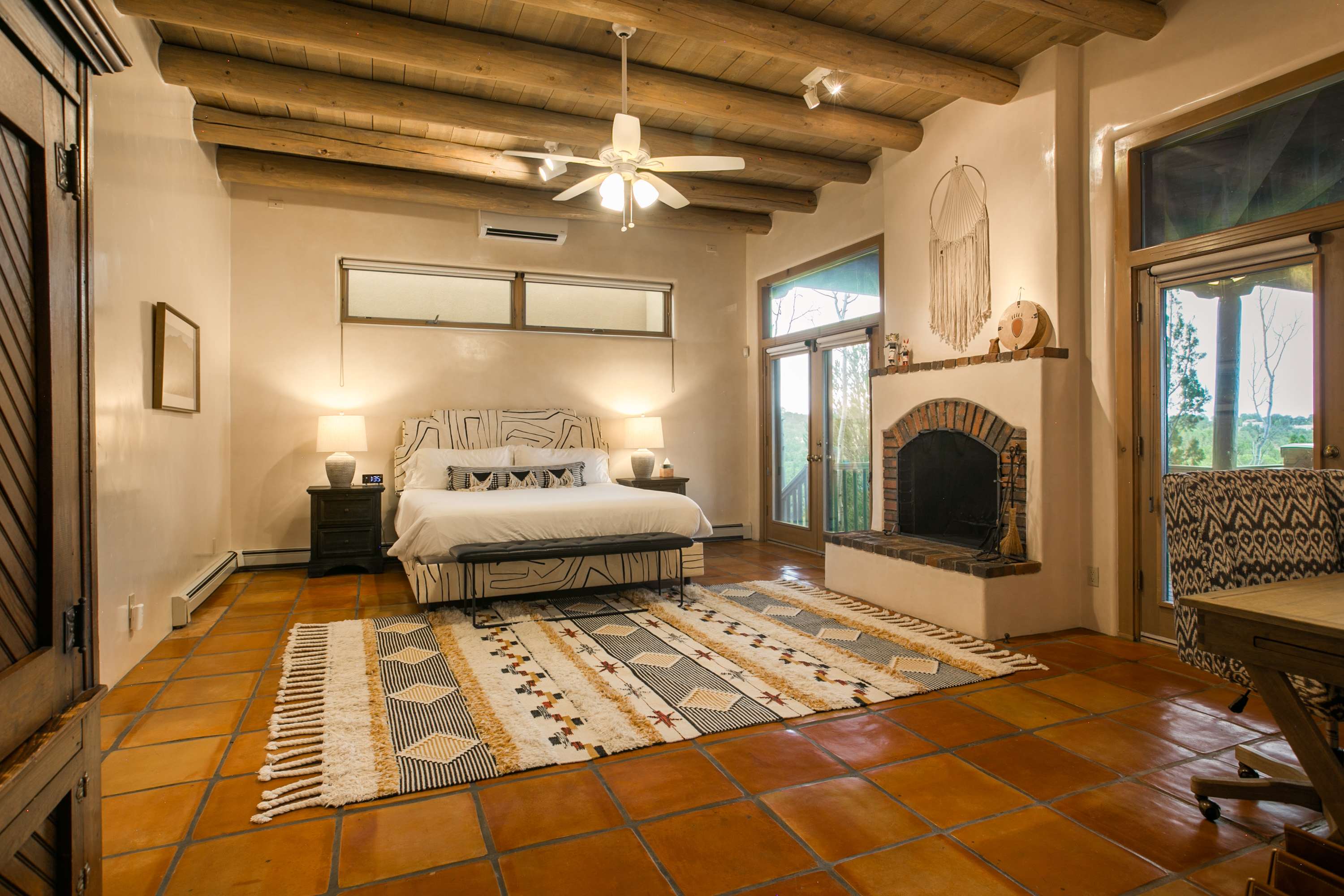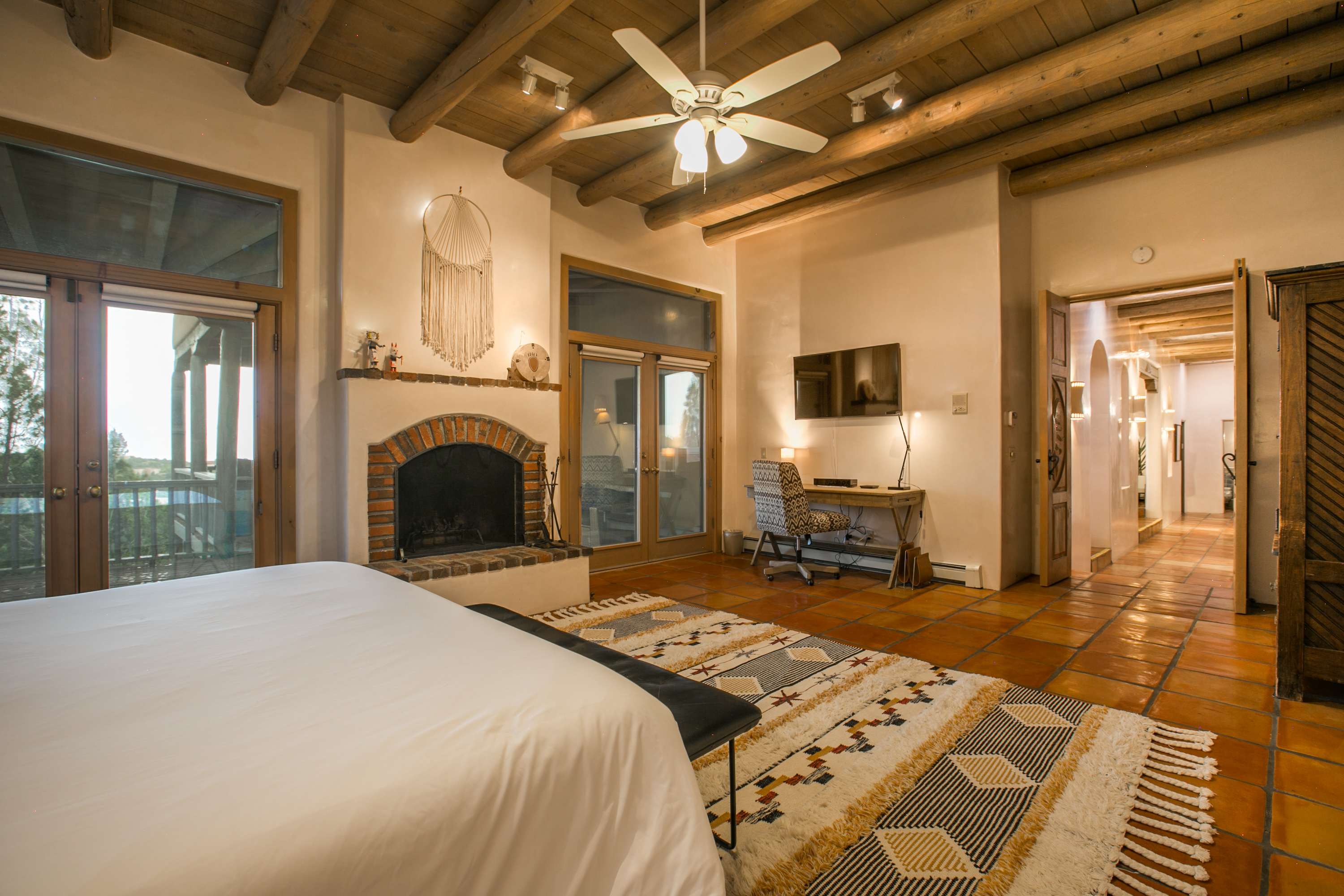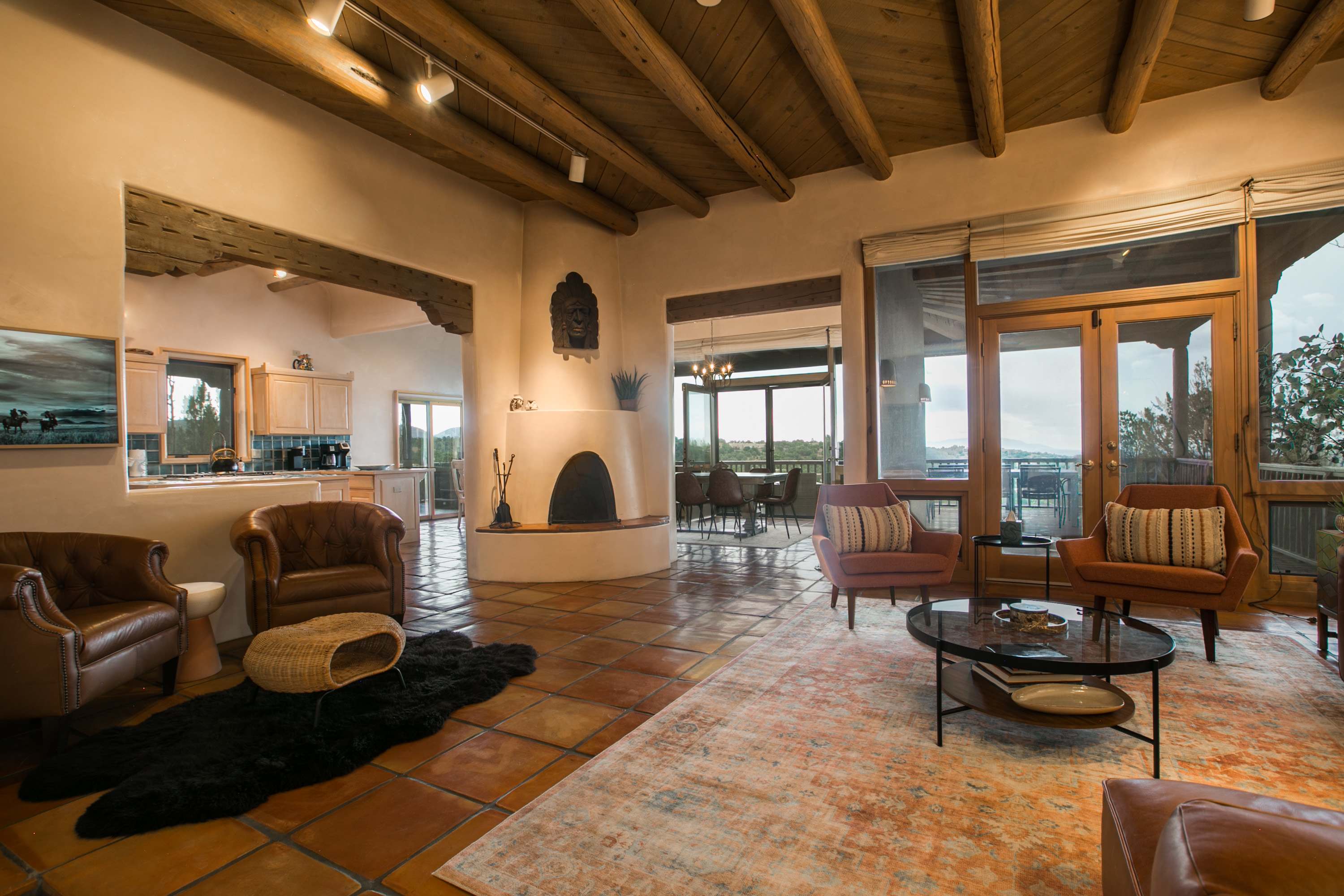 The living room features framed mountain views through large windows and glass doors. The kiva fireplace compliments the views, and together, they provide an unbeatable ambiance. High ceilings with traditional vigas, diamond plaster walls, carved wood corbels, saltillo tile, willow twig cabinet doors, and custom light fixtures create a purely Southwestern atmosphere that perfectly compliments the New Mexican landscape. This room does not contain an AC unit but all bedrooms do.