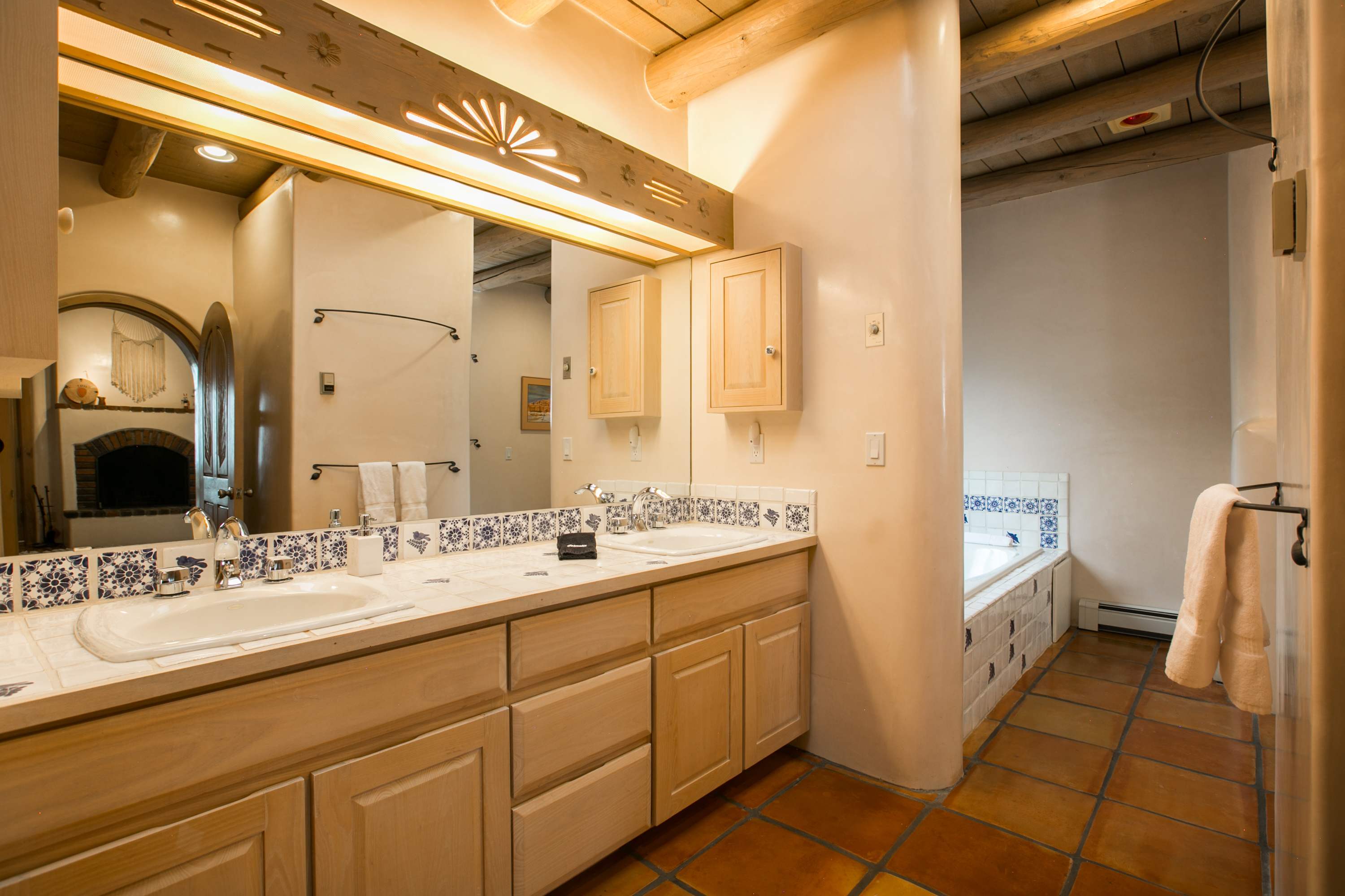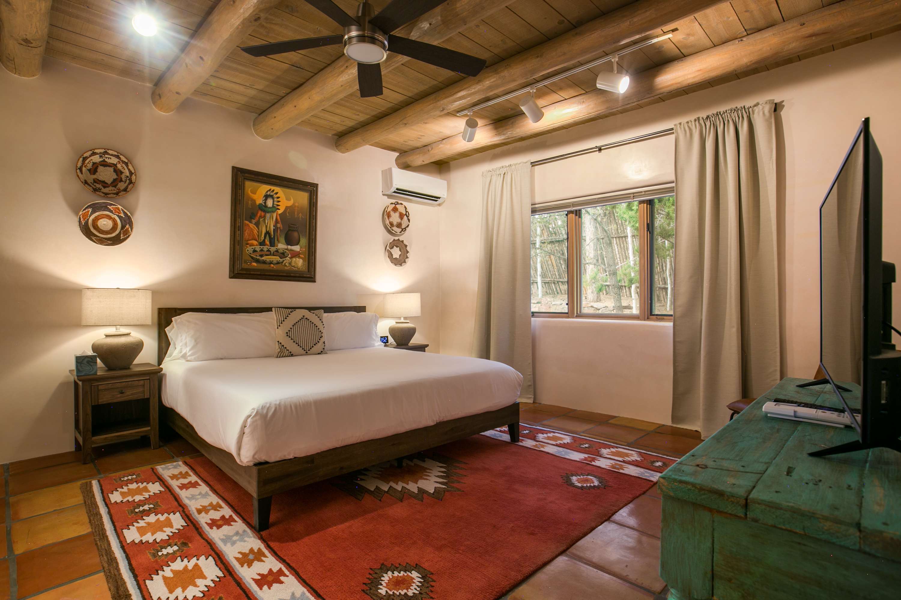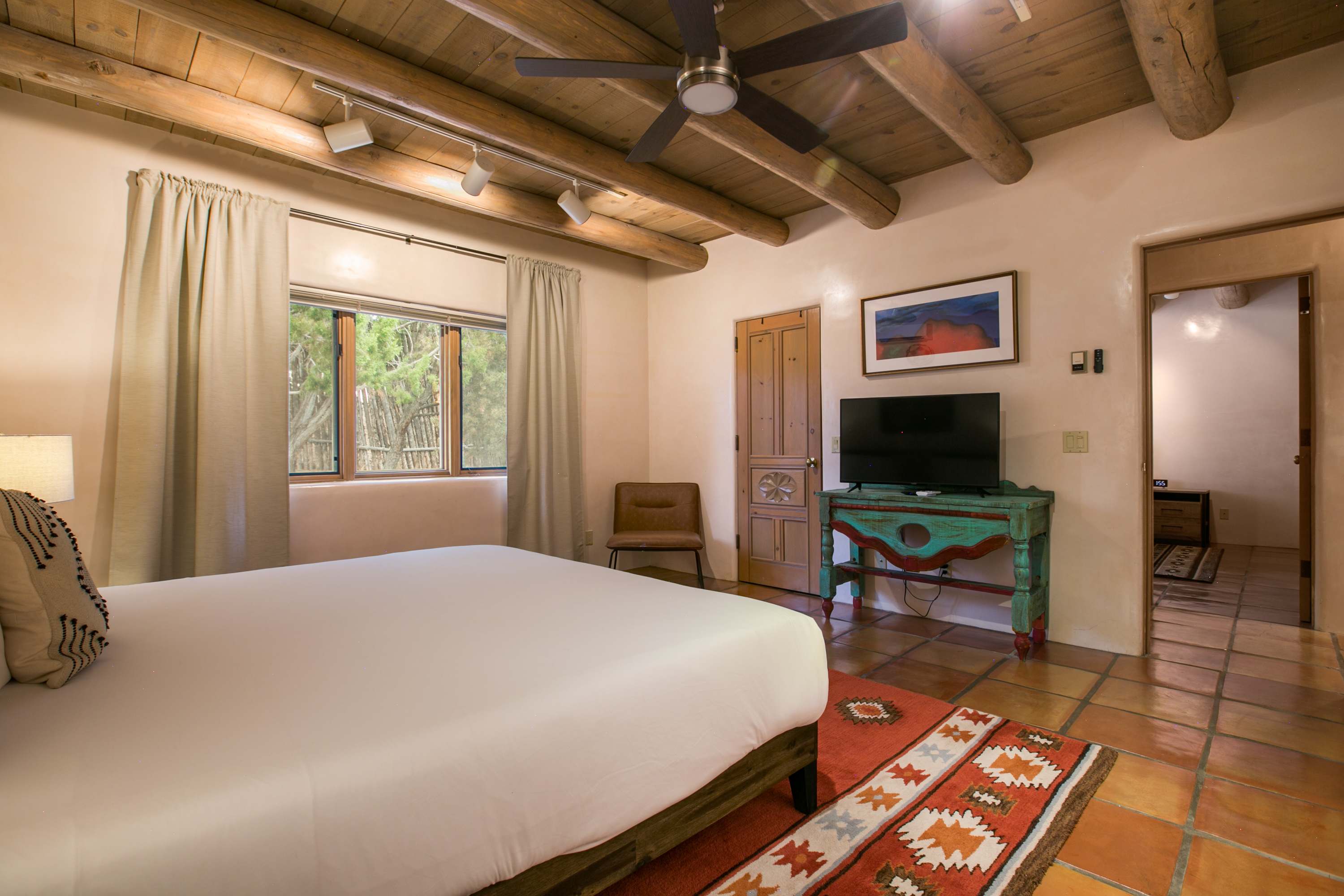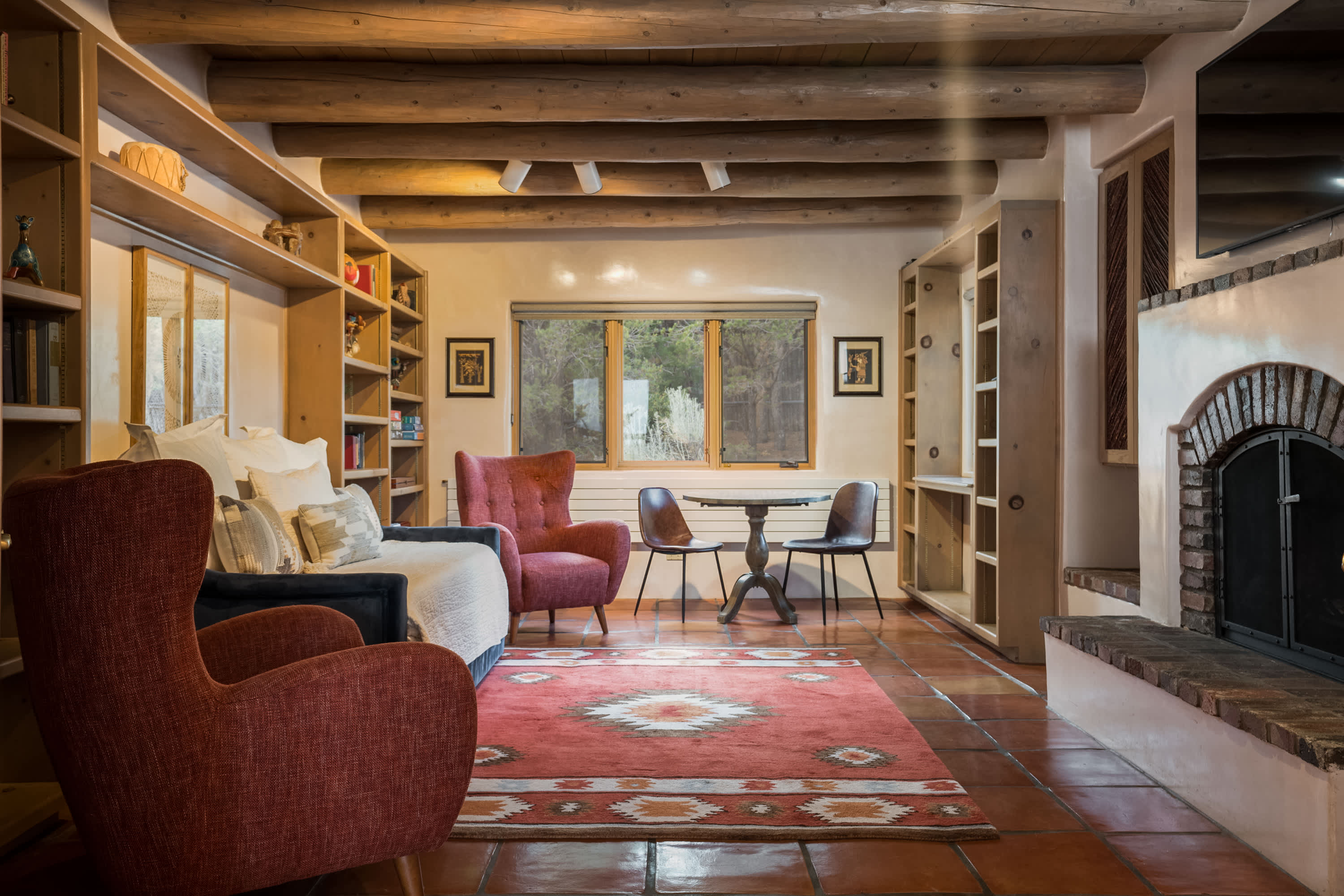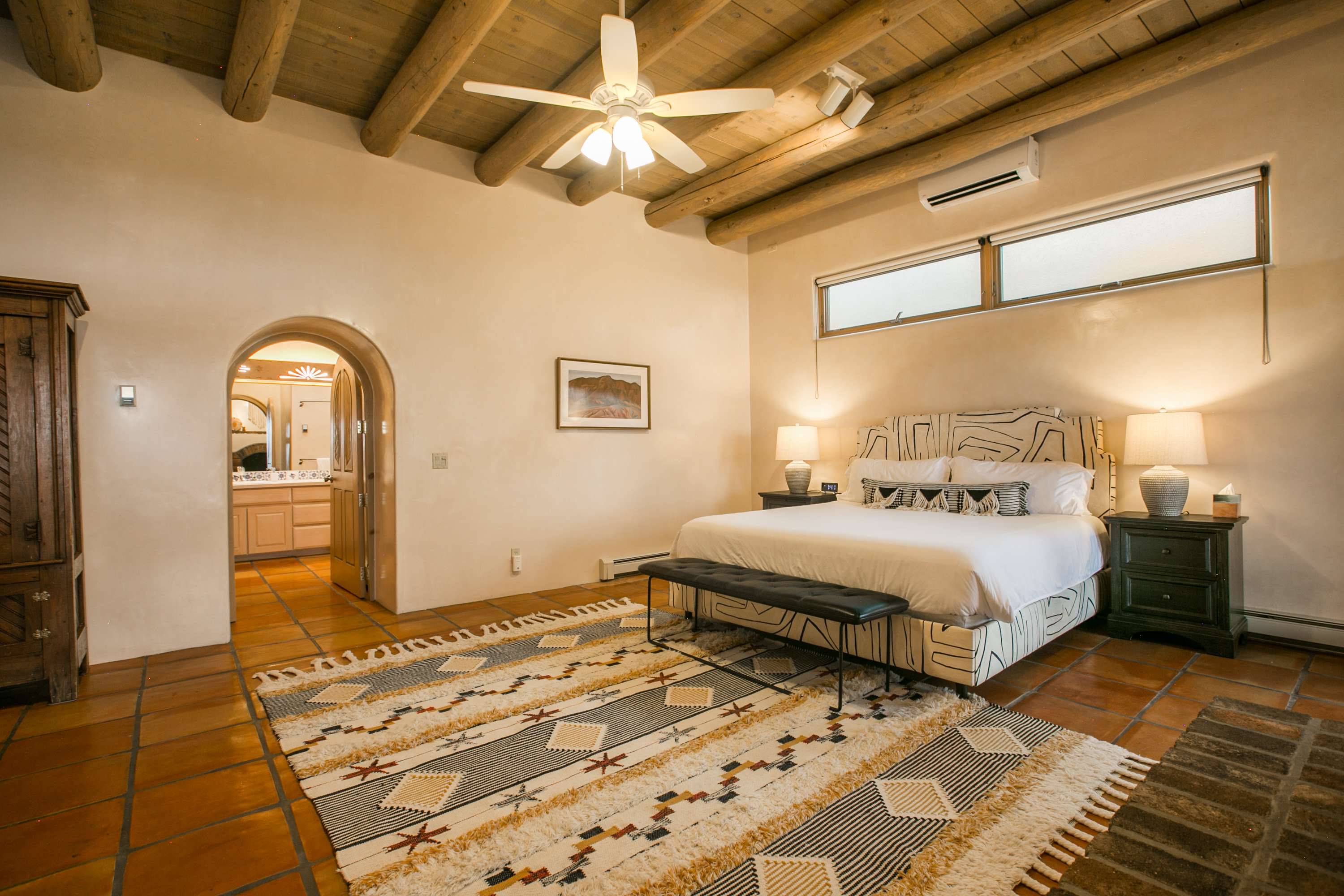 The living room features framed mountain views through large windows and glass doors. The kiva fireplace compliments the views, and together, they provide an unbeatable ambiance. High ceilings with traditional vigas, diamond plaster walls, carved wood corbels, saltillo tile, willow twig cabinet doors, and custom light fixtures create a purely Southwestern atmosphere that perfectly compliments the New Mexican landscape. This room does not contain an AC unit but all bedrooms do.