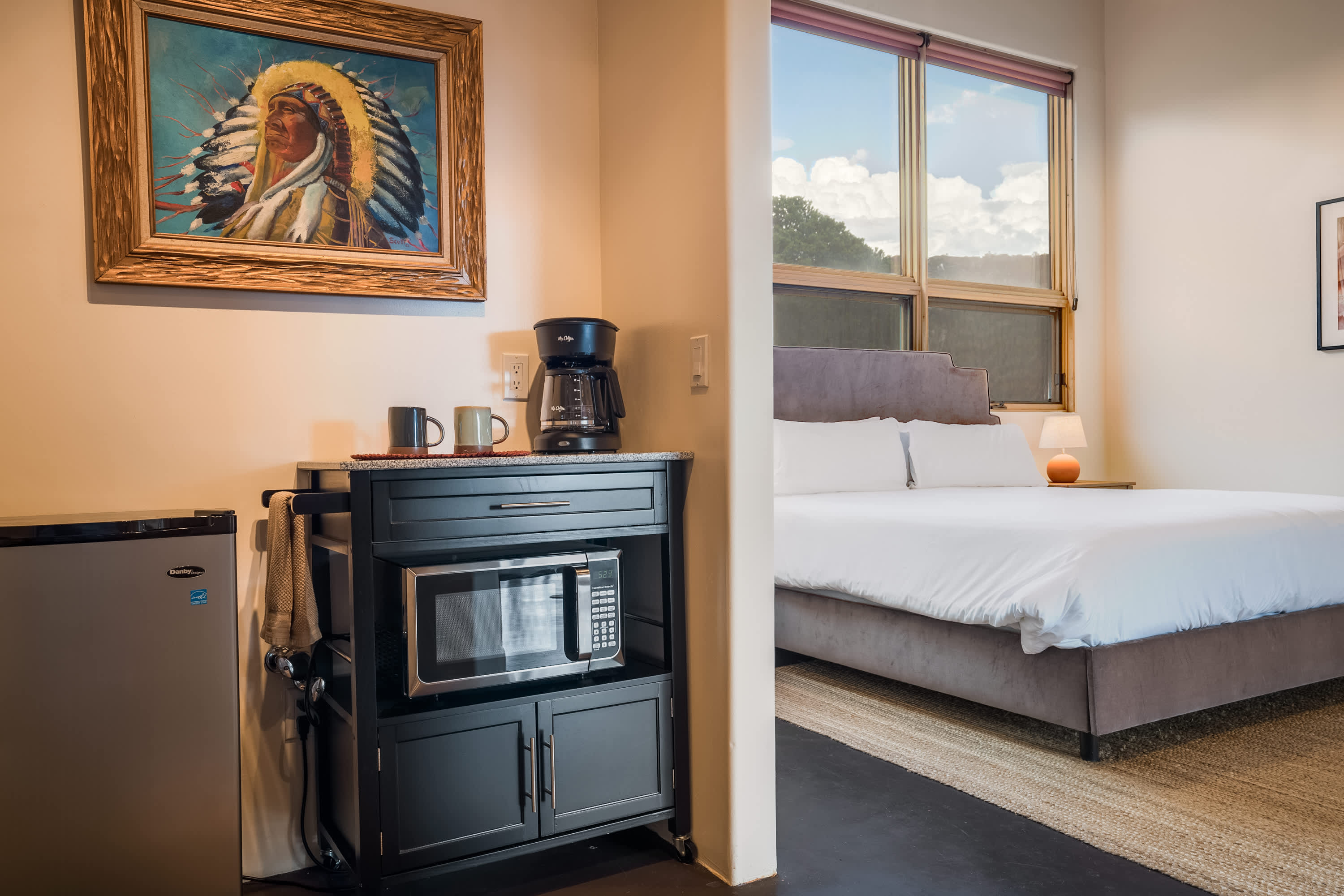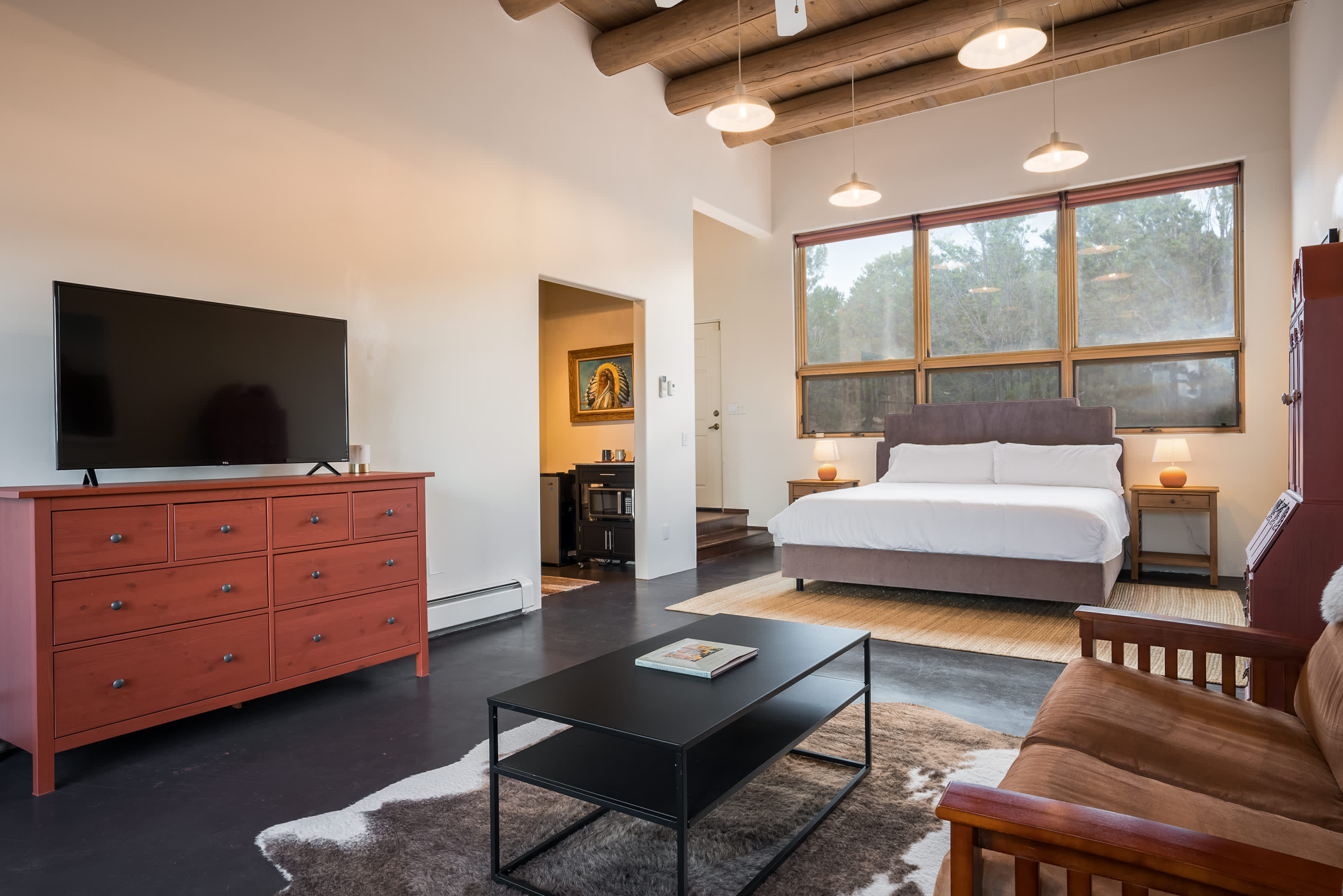 The guesthouse casita is a completely private and self-contained suite complete with a king bed, full bathroom, mini-fridge, microwave, and high-definition TV.