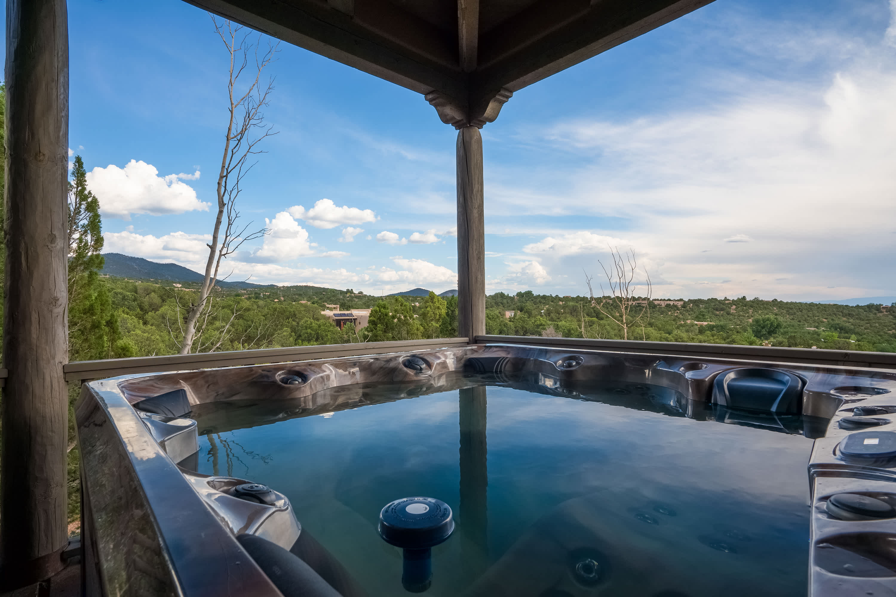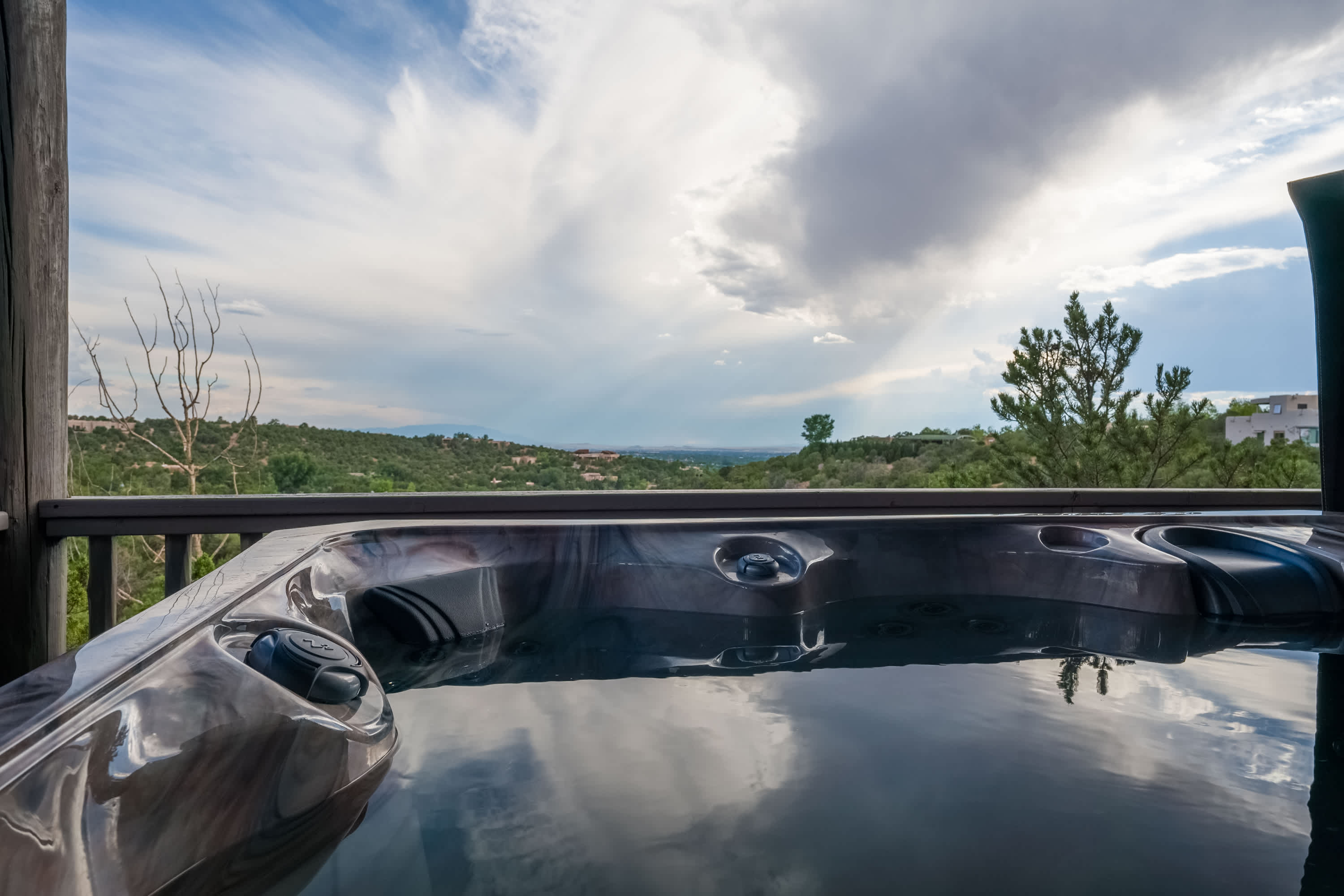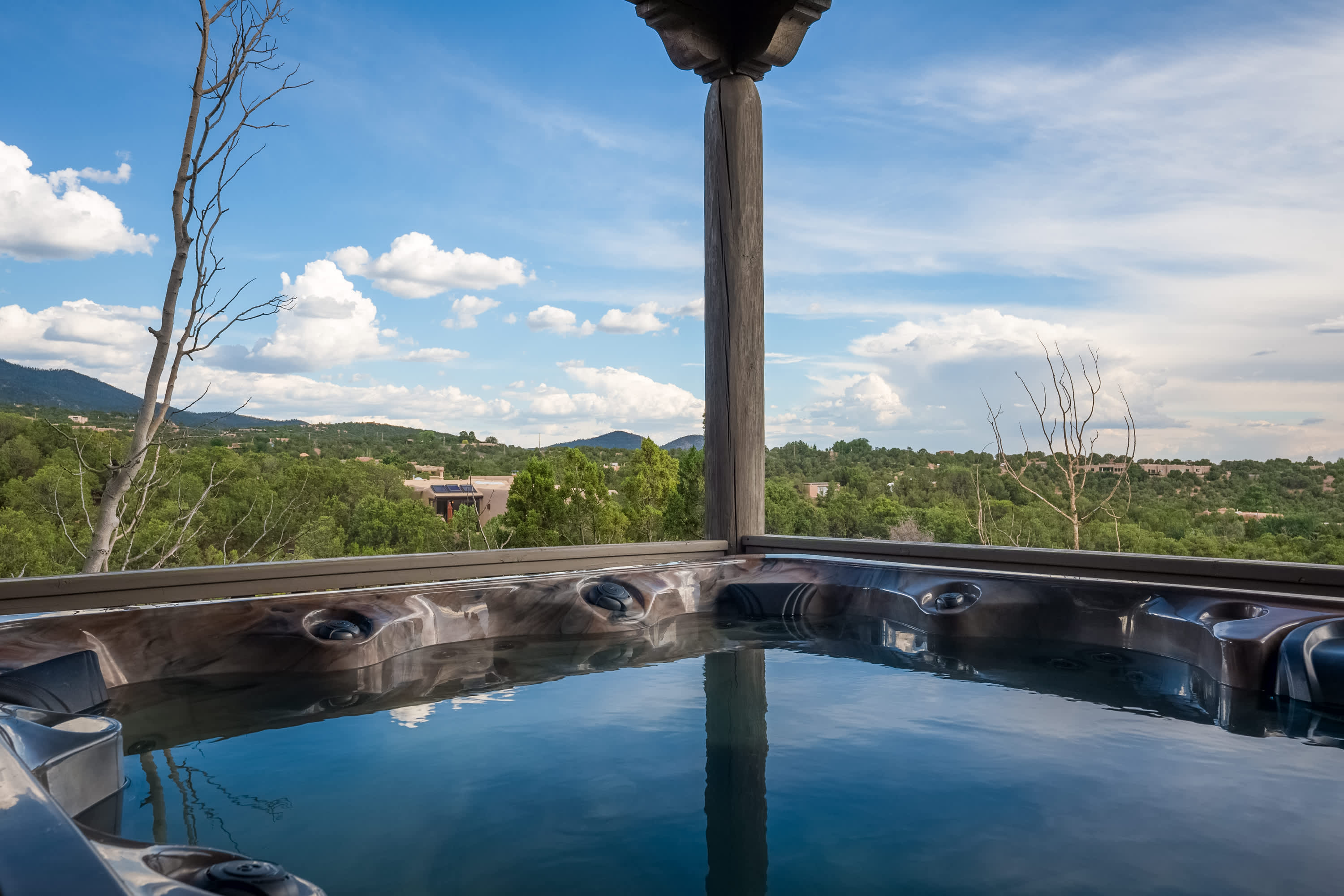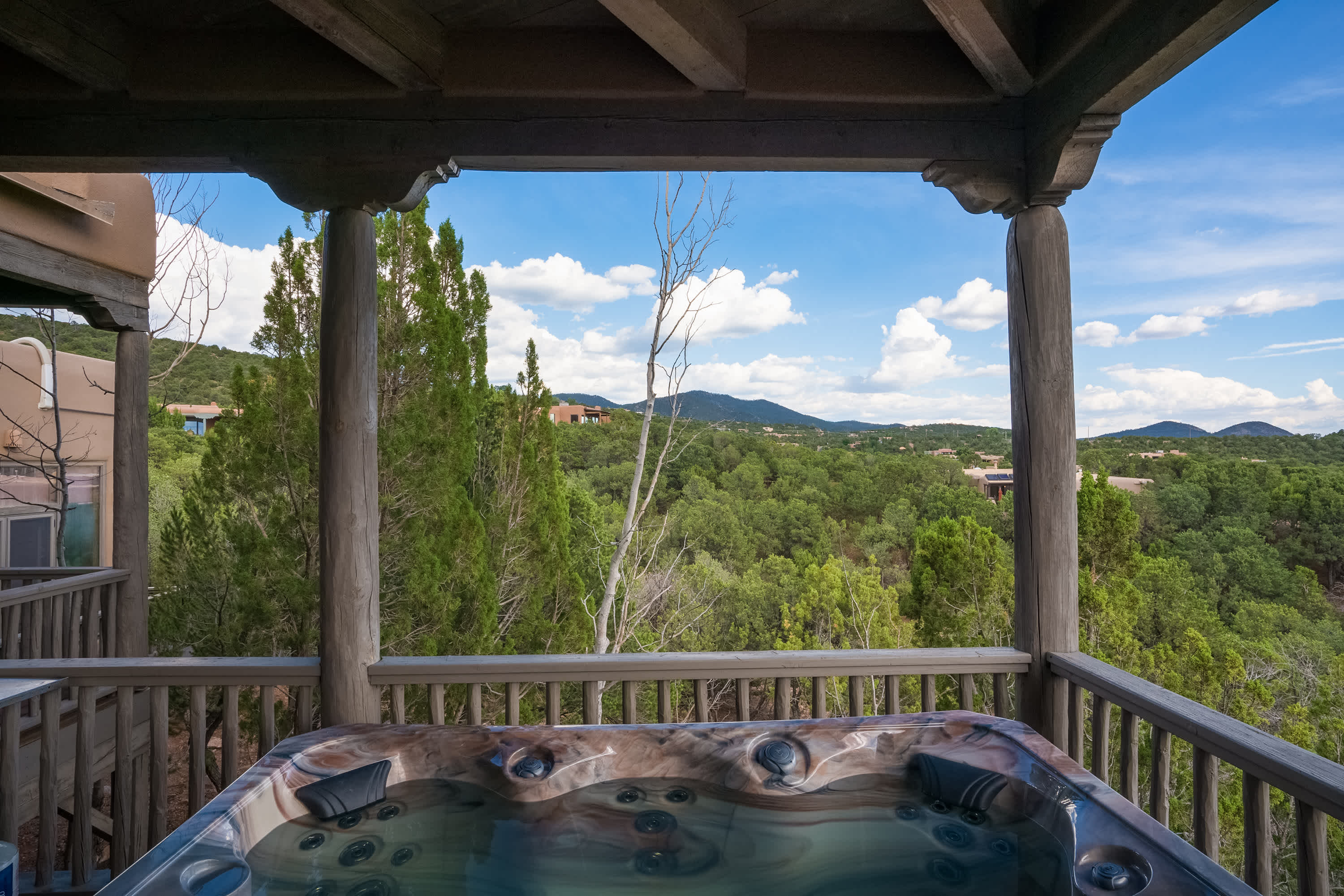 In addition to the gorgeous surroundings, the stunning and professionally landscaped courtyard will make you feel steeped in New Mexico’s natural splendor. The wraparound deck opens into the living room, so it is perfect for entertaining, or simply relaxing and taking in the landscape. A hot tub is perfectly situated on the deck, offering a fun and relaxing way to take in the sights!