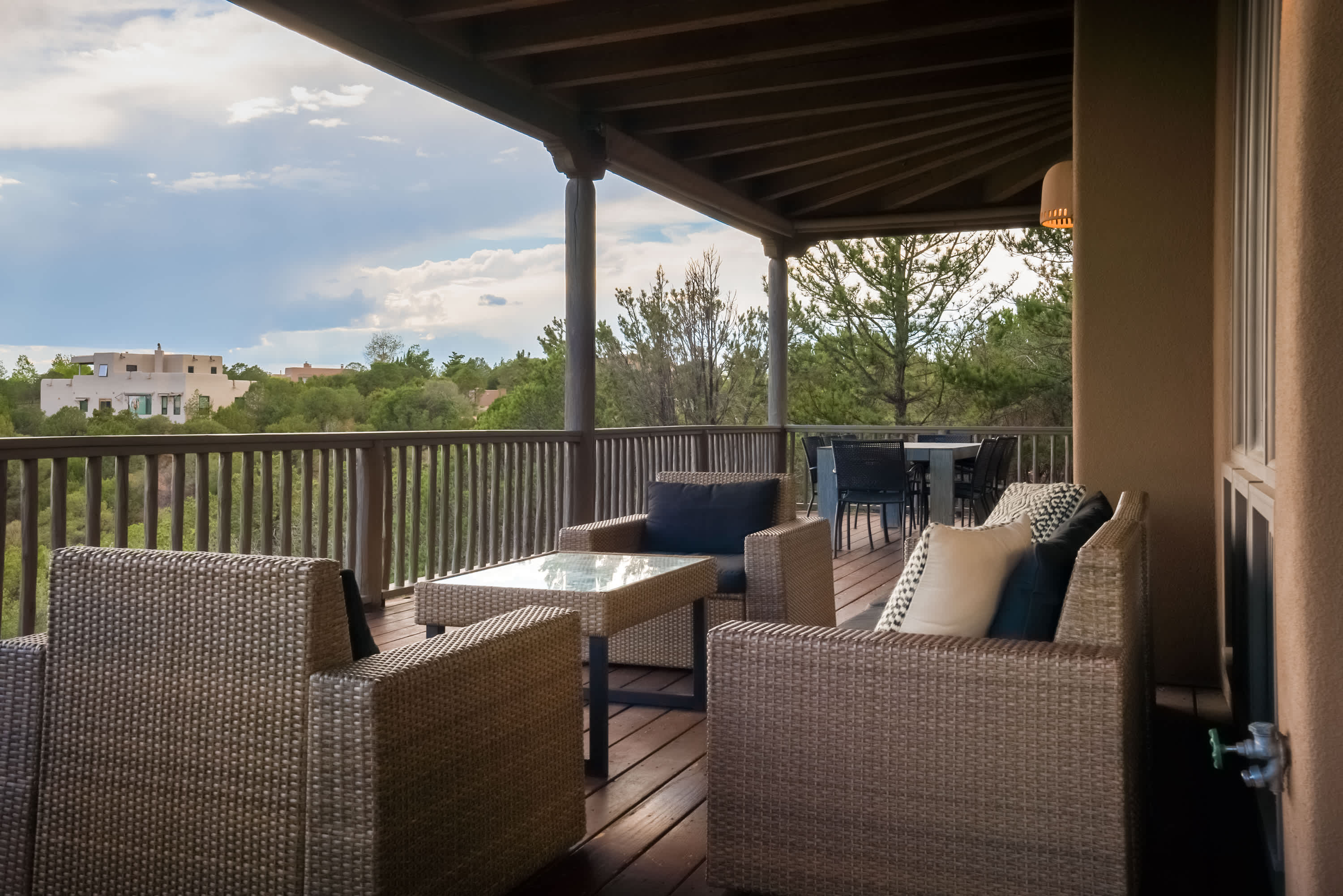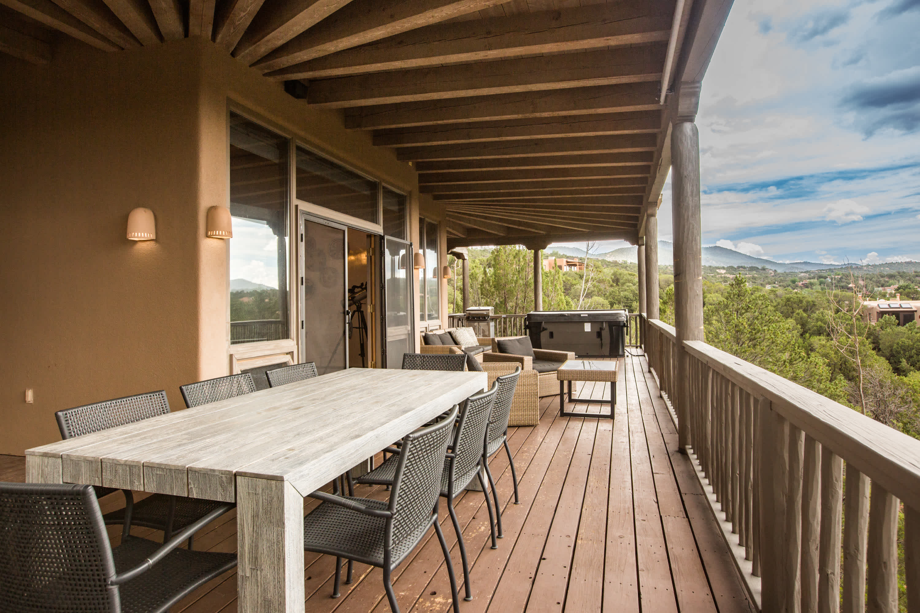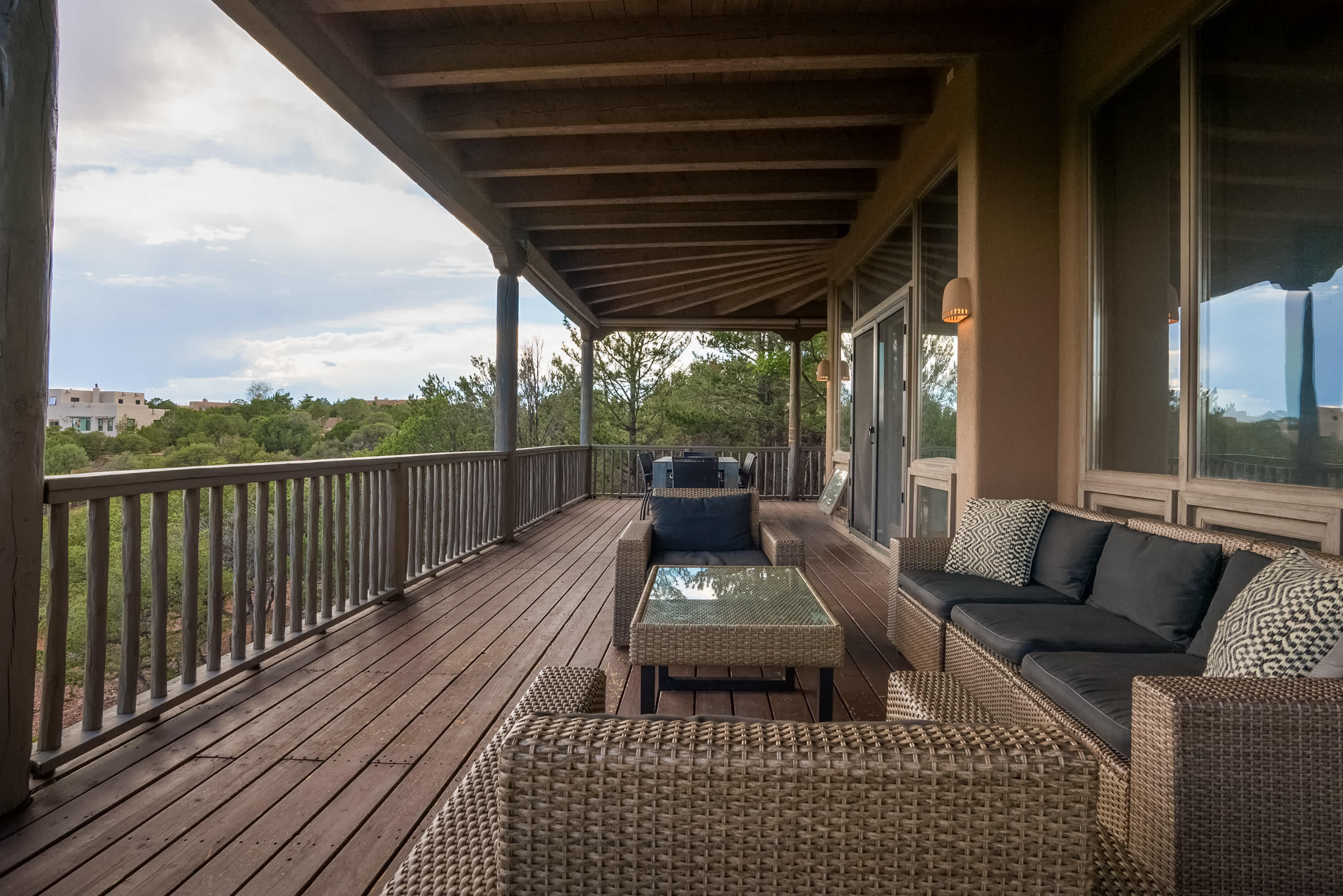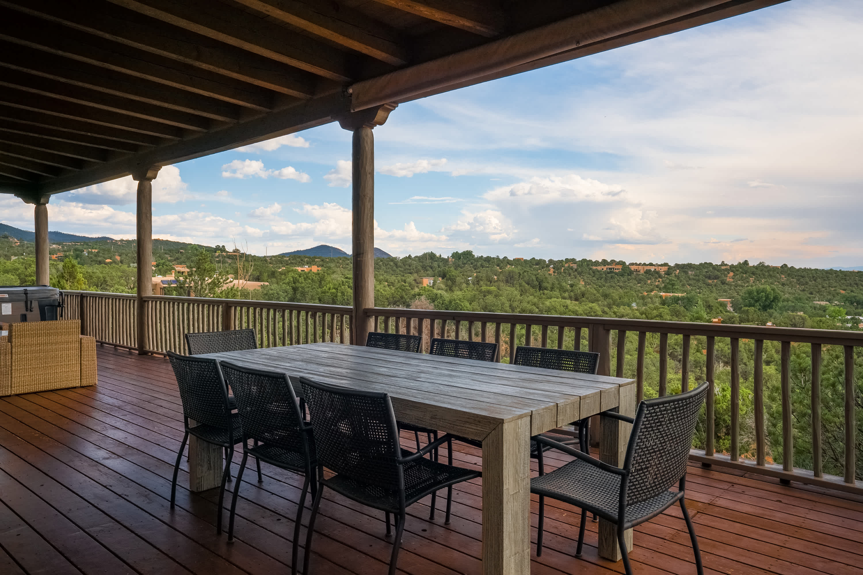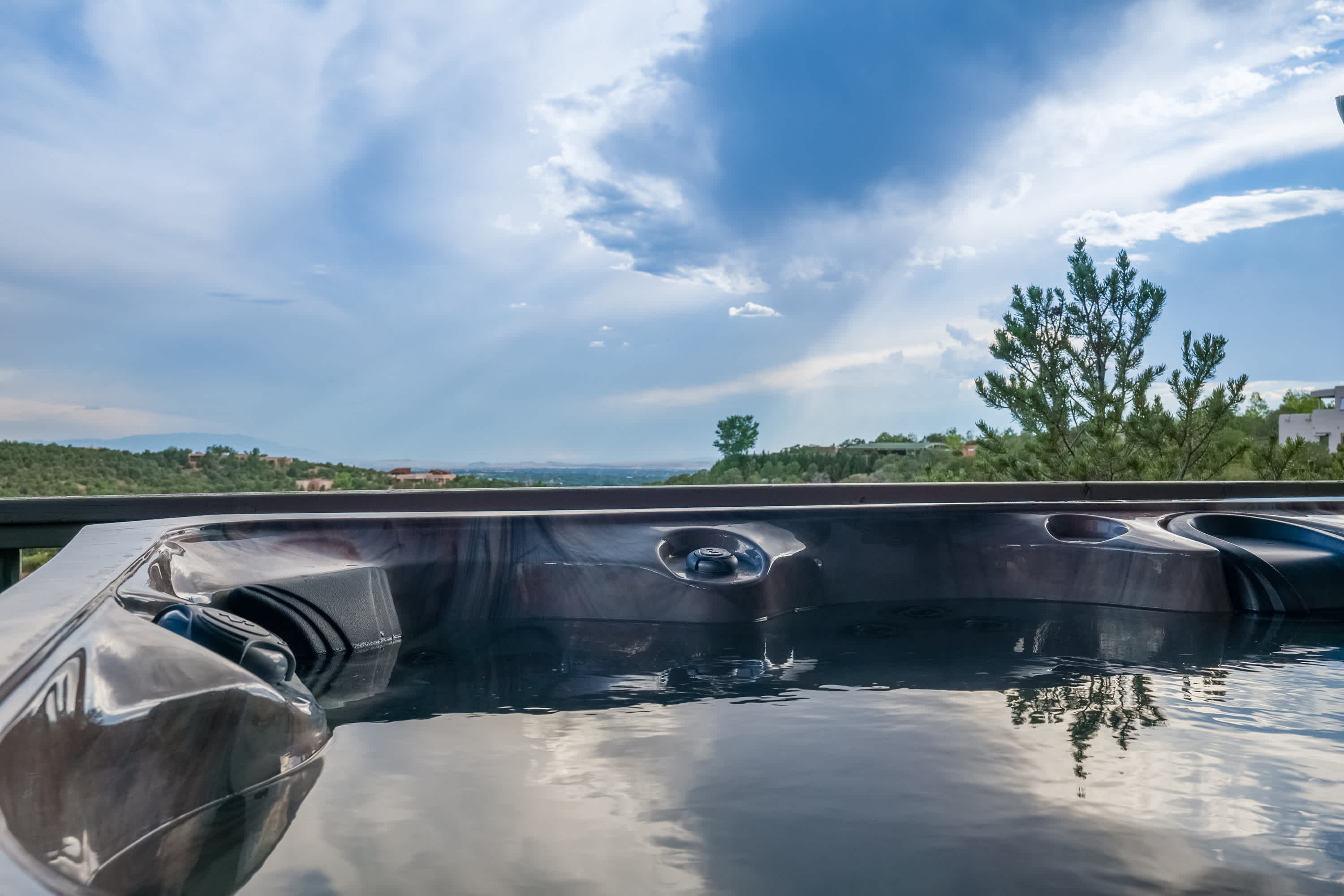 In addition to the gorgeous surroundings, the stunning and professionally landscaped courtyard will make you feel steeped in New Mexico’s natural splendor. The wraparound deck opens into the living room, so it is perfect for entertaining, or simply relaxing and taking in the landscape. A hot tub is perfectly situated on the deck, offering a fun and relaxing way to take in the sights!